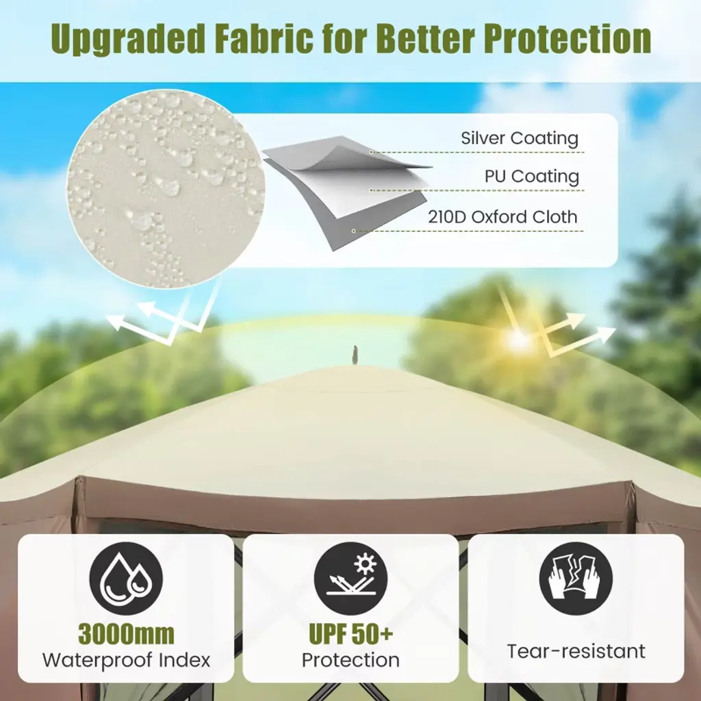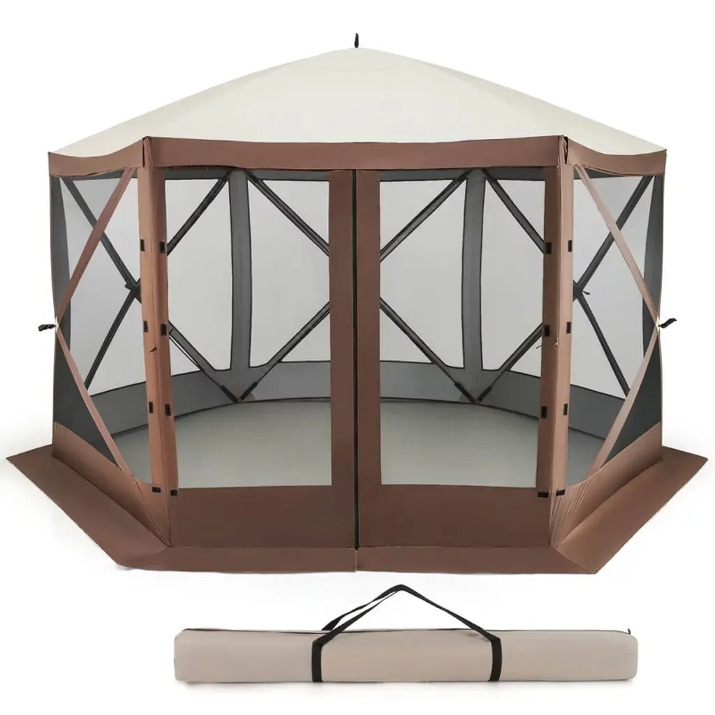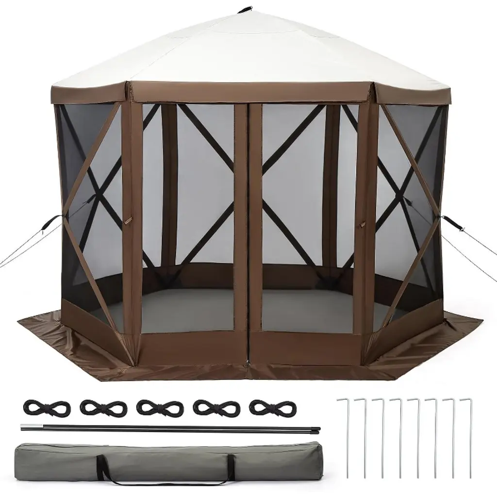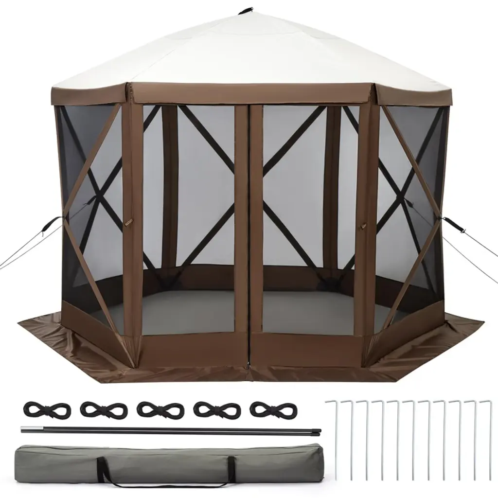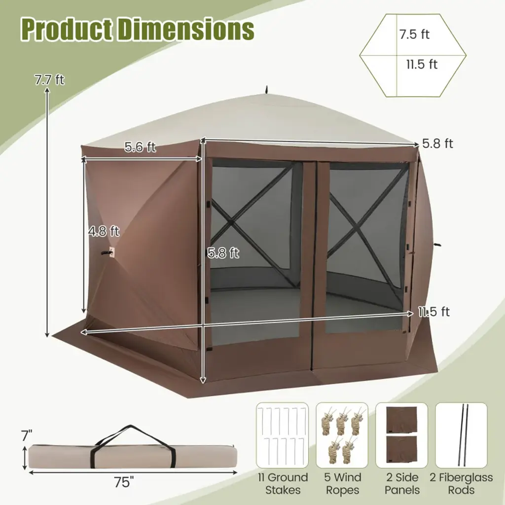 Stay protected, comfortable, and secure on all your adventures with the hub tent! With a shading area of 11.5 ft x 11.5 ft, this spacious tent is suitable for 8-10 people, making it ideal for camping, picnic, parties, and more. Featuring 6-sided mesh netting, you can enjoy the natural landscape without the disturbance of unwanted guests. Moreover, 2 removable side walls will help enhance the privacy. With convenient pop-up structure, setting up this screened canopy is a breeze. Additionally, with the carrying bag included, you can easily store and transport the tent wherever your adventures take you. Plus, the folding hub tent adopts upgraded fabric for better protection. Crafted with oxford fabric and treated with a PU and silver coating, the tent effectively shields you from rain while providing reliable sun protection. Also, the stability is assured with included wind ropes and ground stakes. And the extended cover allows you to put weighted stones to enhance the wind-resistance.Features11.5 x 11.5 ft large tent offers roomy shaded area 2 side panels can be easily attach on any 2 sides as you want to enhance privacy Premium oxford cloth is tear-resistant for durability With PU coating and silver coating, the canopy tent is sun-proof Innovative pop-up structure allows 1 person to finish the assemble in 1 minute 6 side mesh netting walls will provide all-round ventilation Effortlessly secure the tent with wind ropes and ground nails Designed with extended cover for weighted objects Strong center hub and reinforced corners increase the overall sturdiness Equipped with a multi-purpose hook to hang lamp or fan Equipped with a zippered front door for easy access Easily open the door and keep it in place with fixing ties and smooth zippers Detachable side panels are fixed by hook & loop fasteners The folding gazebo tent is foldable & portable with carry bagColor: Brown Material: 210D Oxford Fabric, Mesh, Fiberglass Rod Overall Dimensions: 11.5 x 11.5 x 7.7 ft (L x W x H) Size of the Wind Cloths: 5.6 x 4.8 ft (L x W) Size of the Carrying Bag: 7" x 7" x 75"(L x W x H) Net Weight: 27lbs Package Includes: 1 x Pop-up Screen House Tent 1 x Carrying Bag 5 x Wind Rope 11 x Metal Ground Stake 2 x Wind Cloth 2 x Fiberglass Rod 1 x User’s Manual