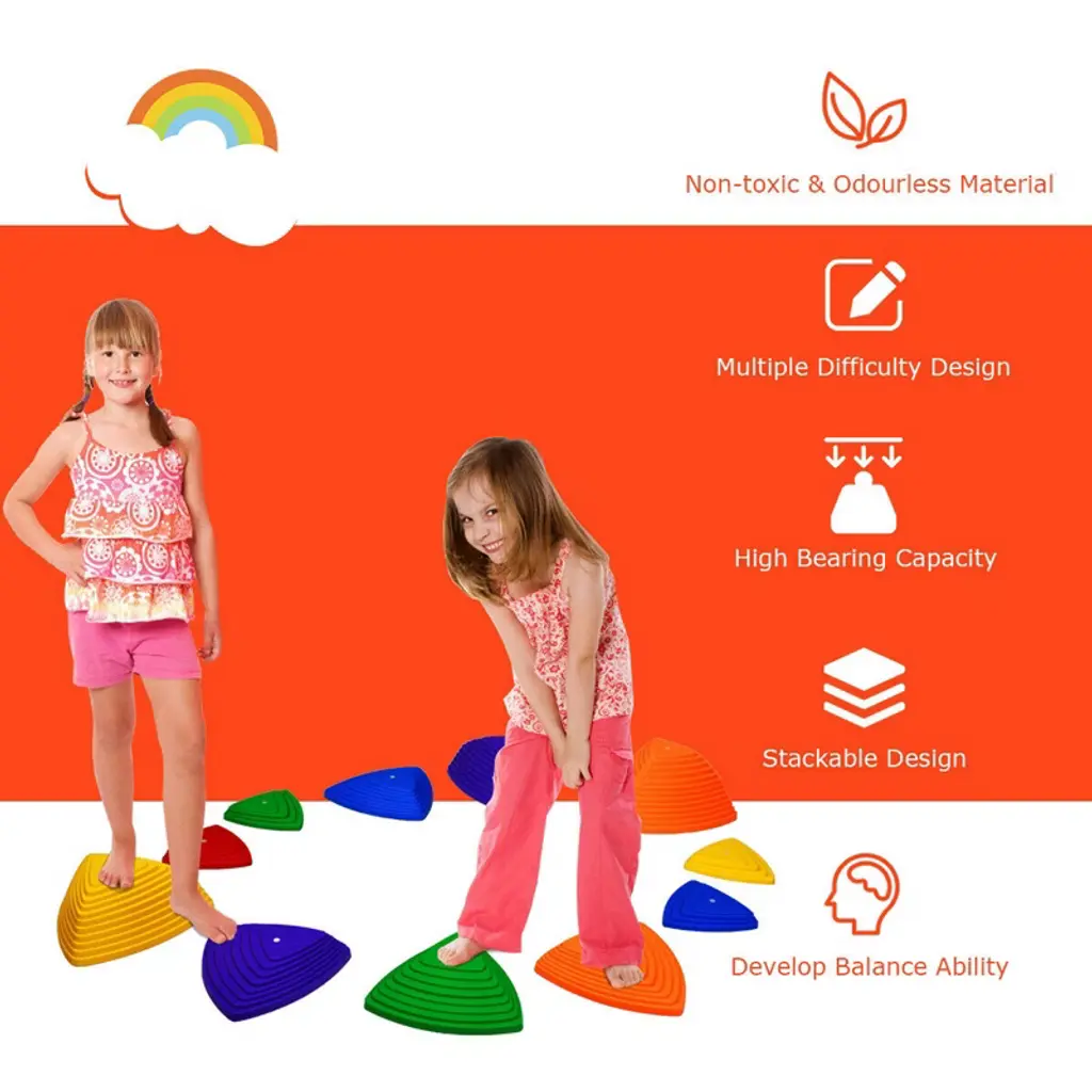 With durable PP materials and non-slip rubber edgings, the kids balance stones give kids a stable and safe playing environment. According to the needs of kids at different stages, four sizes of these stones can be set different game to develop balance and coordination, and they can also allow kids to play with their imagination to create their own games. This stepping stones set promotes physical activity and active play, inspiring your child to jump, stretch, climb, and balance for full-body exercise. These stepping stones can be stacked up for easy storage without wasting too much space.FeaturesColor: Multi-color Material: PP, Rubber Small Stones: 9'' x 2''(L X H) Medium Stones: 13.5'' x 3''(L X H) Large Stones: 15'' x 6.5''(L X H) Extra Large Stone: 16'' x 8''(L X H) Net Weight: 9lbs Weight Capacity: 220lbs Recommended Age: 3 years old + Certification: ASTM Package includes: 11 X Balance Stones 1 X User's Manual