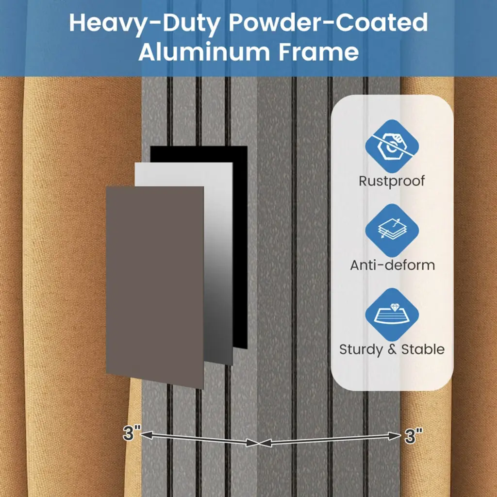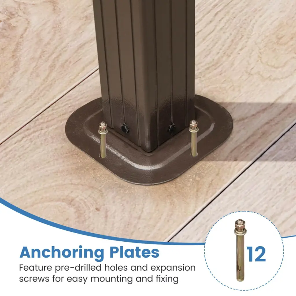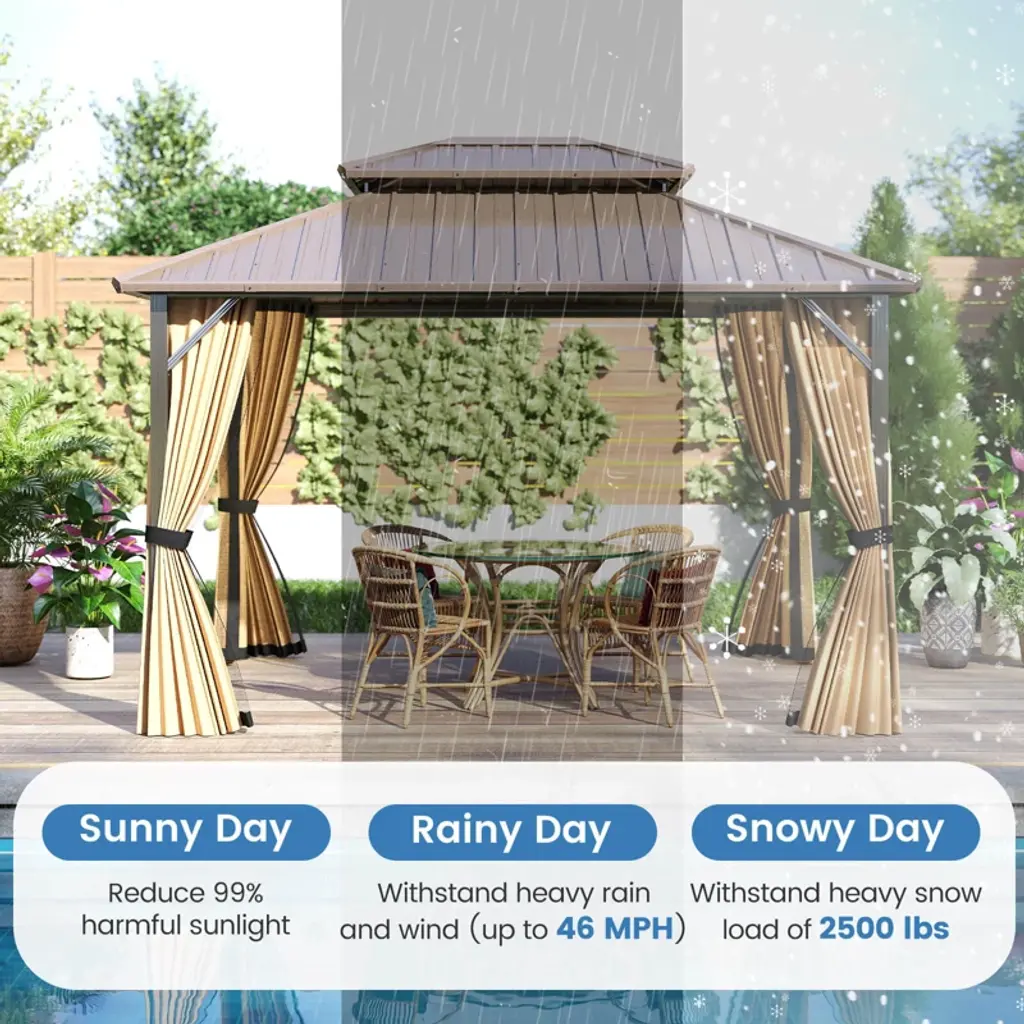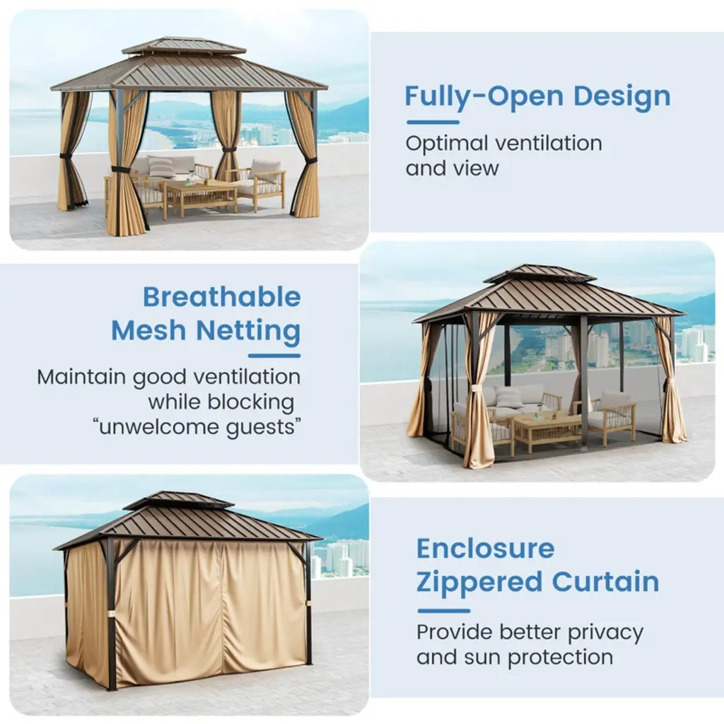 Our 12 x 10 ft hardtop gazebo comes with a double-layer galvanized metal roof, ensuring good ventilation while offering superior protection from sun, rain, wind, and snow, which is a perfect year-round heaven for outdoor gathering. The aluminum frame is engineered for durability and stability, resistant to rust and reinforced with anchoring plates, including 12 expansion screws for securing of concrete floors, ensuring it remains securely anchored in place even during rough weather. Besides, featuring integrated double-layer sidewalls, complete with mesh netting and zippered curtains, you can enjoy an intimate setting free from “unexpected guests” and prying eyes, or open up to let the breeze flow through on warmer days. The addition of a ceiling hook provides versatile options to enhance the ambiance, easily hanging a light, fan, or flower basket to customize your setup for any event. From leisurely afternoon tea to lively evening parties, this gazebo is spacious enough to host a variety of activities!FeaturesThe heavy-duty galvanized metal roof is waterproof, sun-protective, weatherproof Adopts a double roof design with netting for ventilation, away from “unwanted guests” Designed to shield you from harmful sunlight, strong winds, heavy rain, and snow Supported by a robust aluminum frame, rustproof, reliable, sturdy, built to last The expansion screws help fix the gazebo on solid ground for better wind resistance The top hanging hook provides additional convenience for hanging a light or fan (not included) Adopts double sidewalls with mesh netting and zippered curtains, meet different needs The sidewalls with 2-in-1 loop straps and smooth dual-side zippers feature a fully-open design The waterproof polyester curtains provide privacy and further protection from elements The curtains can be secured on 4 columns with fixing straps and windproof hooks Assembly requiredColor: Coffee Material: Galvanized Metal, Aluminum, Mesh, Polyester Fabric Product Dimensions: 12 x 10 x 9.8 ft (L x W x H) Ground Clearance: 6.4 ft Net Weight: 187 lbs Package Includes: 1 x Hardtop Gazebo 12 x Expansion Screws 1 x User’s Manual