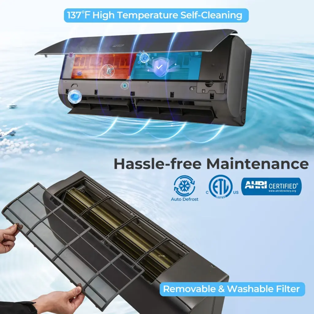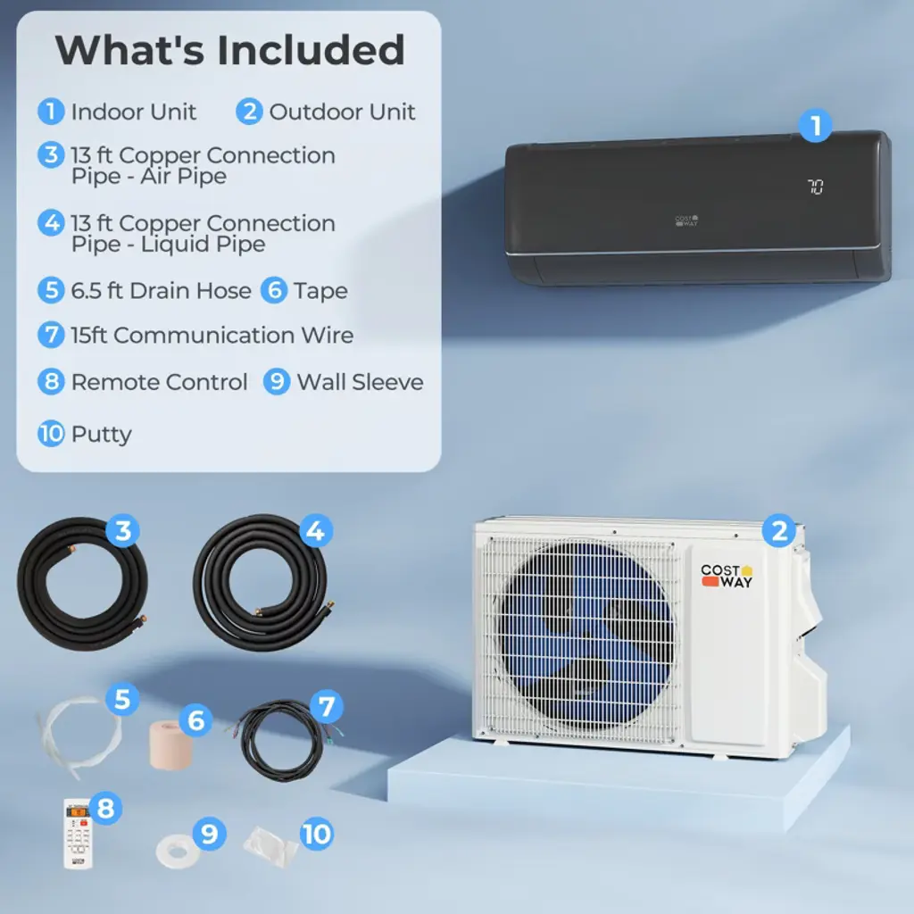 Discover the convenience and efficiency of our 12000 BTU mini split AC. This inverter air conditioner and heater pump system is designed to maintain comfort in large spaces up to 750 sq. ft. With its impressive 22 SEER2 and 9 HSPF2 ratings, it offers efficient cooling and heating options, reducing your energy consumption. Besides, this air conditioner can also serve as a dehumidifier and fan for all weather conditions. The integration of WiFi connectivity allows you to control your mini split AC from anywhere using your smartphone. It’s also compatible with Alexa, allowing for seamless voice control. Set schedules easily with the 24-hour timer and enjoy a variety of functions -swing, turbo, i feel, ECO and sleep- to suit your comfort needs at any time. Warm Notice: The installation of this equipment should be done only by a Licensed HVAC Installer. Features4 in 1 design for customized comfort: cool, heat, dry and fan Powerful cooling & heating for large rooms up to 750 sq.ft Multiple ways to control: App/voice/remote control High efficiency inverter technology and ECO mode 4D air supply avoids direct blowing for added comfort Smart 0-24 hour timer for personalized comfort Enjoy a peaceful sleep with low noise and screen off function Self cleaning and washable filter for simple maintenance R32 refrigerant with a lower environmental impact Auto defrost function for higher heating efficiency Complies with ETL and AHRIColor of Indoor Unit: White/Gray Color of Outdoor Unit: White Material: Metal, Aluminum, Copper, AS Indoor Unit Dimensions: 30" x 8"x 11.5" (L x W x H) Outdoor Unit Dimensions: 28" x 11"x 21" (L x W x H) Voltage:115V/60Hz Max. Input Power: 1600W Max. Input Current: 11A Cooling Capacity: 12000 BTU Heating Capacity: 12300 BTU Cooling Power: 1040W Heating Power: 1040W Coverage Area: 750 sq. ft Air Flow Volume: 600 m³/h Dehumidifying Capacity: 51 Pints/Day Temperature Setting Range: 60℉~90℉Refrigerant: R32 SEER2: 22 HSPF2: 9 Indoor Noise Level:42 dB Outdoor Noise Level:53 dB Net Weight of Indoor Unit: 17.5 lbs Net Weight of Outdoor Unit: 50.5 lbs Package Includes: 1 x Indoor Unit 1 x Outdoor Unit 1 x 13 ft Copper Connection Pipe - Liquid Pipe 1 x 13 ft Copper Connection Pipe - Air Pipe 1 x 15 ft Communication Wire 1 x 6.5 ft Drain Hose 1 x Remote Control 1 x Tape 1 x Wall Sleeve 1 x Putty 1x User Guide