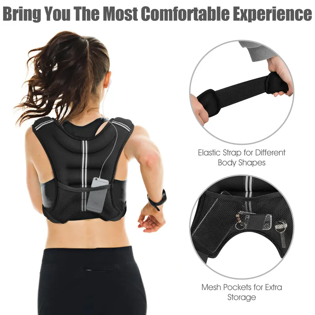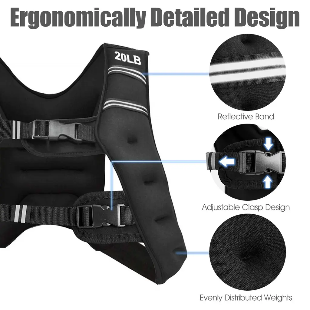 Our 12lbs/20lbs weighted vest is a good workout equipment for both man and woman. You can wear it when you climb mountain, run or do sports. The weighted vest can help you lose weight, burn more calories, increase your power and build muscle. Besides, this weighted vest is made from 2.5mm Neoprene, filled with black iron sand. So you can feel comfortable when you exercise. In addition, it has reflective strip to ensure you safety in your night workout. What's more, there is an extra storage pocket in the back of the weighted vest, and you can store some small items in it. And the thickened and widened shoulder straps can evenly distribute the pressure on the shoulders. Have it, you will have the perfect body and strong physique. FeatureSoft, comfortable and breathable material provide a comfortable experience Non-toxic and odorless black iron sand inside enhance the effect of exercise. Two adjustable buckles can be adjusted according to users' body shape Reflective strips keep users safe at night Fine workmanship and tight stitching ensure no sand leakage Thicker and wider shoulder straps distribute stress evenly across the shoulders Back pocket can be used to store small items like cards, keys and cell phones Helps you increase exercise, burn more calories, and build muscle Can be used while running, climbing, exercising or even walking Ideal for all sports enthusiastsSpecificationColor: Black Product Weight: 12lbs20lbs Material: 2.5mm Neoprene, Black Iron Sand Package includes: 1 x 12LBS20LBS Weighted Vest