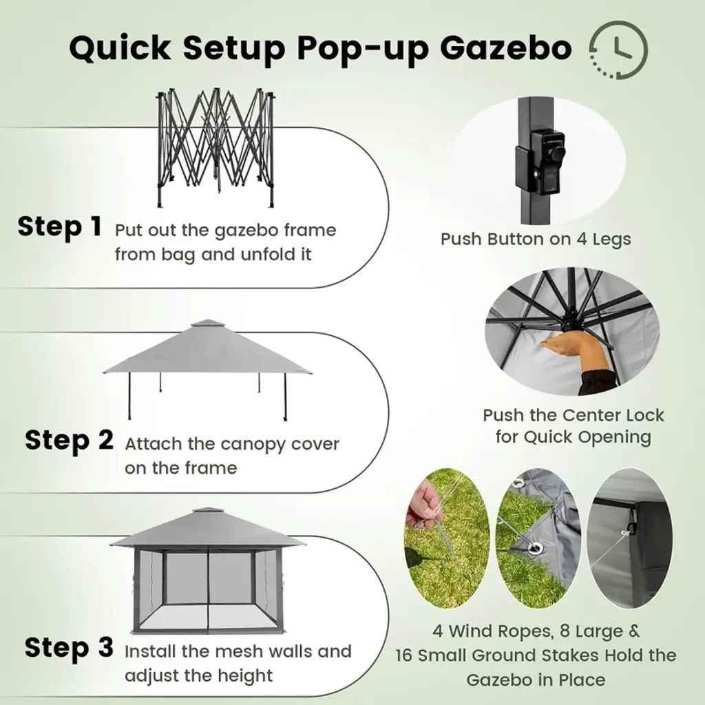Enjoy optimal comfort with the portable gazebo tent! If you want a tent that provides both shade and ventilation, our outdoor gazebo will be a good choice. The super large canopy provides 169 sq. ft of shade, enough for 10 people to move freely. Vented top with mesh ensure you stay cool and comfortable. In addition, 4 zippered removable mesh walls help promote ventilation and keep unwelcomed guests out. The canopy is made of waterproof, tear-resistant oxford fabric and features a layer of premium PU coated silver that will provide you with UV50+ protection and 500mm waterproof rating. For your convenience, you only need to push the central lock to unfold it in seconds. And all the accessories can be packed in the included carry bag. The wheeled carry bag makes it easy to move the gazebo tent outdoors. The gazebo is made of strong and sturdy metal construction with additional reinforcement rods to ensure higher stability. Also, the 4 wind ropes and 24 stakes help the gazebo stay stable outdoors. So whether you need to hold a small commercial event, concert or party outdoors, this pop-up canopy is a great choice! Features13 ft x 13 ft gazebo provide sufficient space for picnics, gatherings, parties, etc 3 levels adjustable heights can flexible adapt to different occasion High quality oxford fabric is tear-resistant, breathable to last for a long time PU silver coating ensure UV50+ protection and 500mm waterproof rating 4 mesh walls effectively avoid sultry while blocking unpleasant guests Metal frame is coated with anti-rust paint for long service life Adopting reinforced rods to increase wind-resistance in outdoors Equipped with 4 wind ropes, 24 stakes to enhance stability Double ventilated top with mesh promotes airflow and bright vision Extended and sloping eaves easy to drain out water Double sided zippers allow you to open the mesh sidewalls from inside or outside Easy to setup and fold down with clever pop-up design Wheeled carry bag enables you to take the tent anywhere you wantColor: Khaki/Grey Material: PU Silver Coated Oxford, Metal, PV C Overall Dimension: 13 ft x 13 ft x 8-10 ft (L x W x H) Carrying Bag Size: 51.5" x 9.5" x 9.5" (L x W x H) Adjustable Height: 8 ft, 9 ft, 10 ft Net Weight: 53 lbs Package Includes: 1 x Outdoor Gazebo Canopy 1 x Carrying Bag 4 x Wind Rope 8 x Large Stake 16 x Small Stake 1 x User's Manual