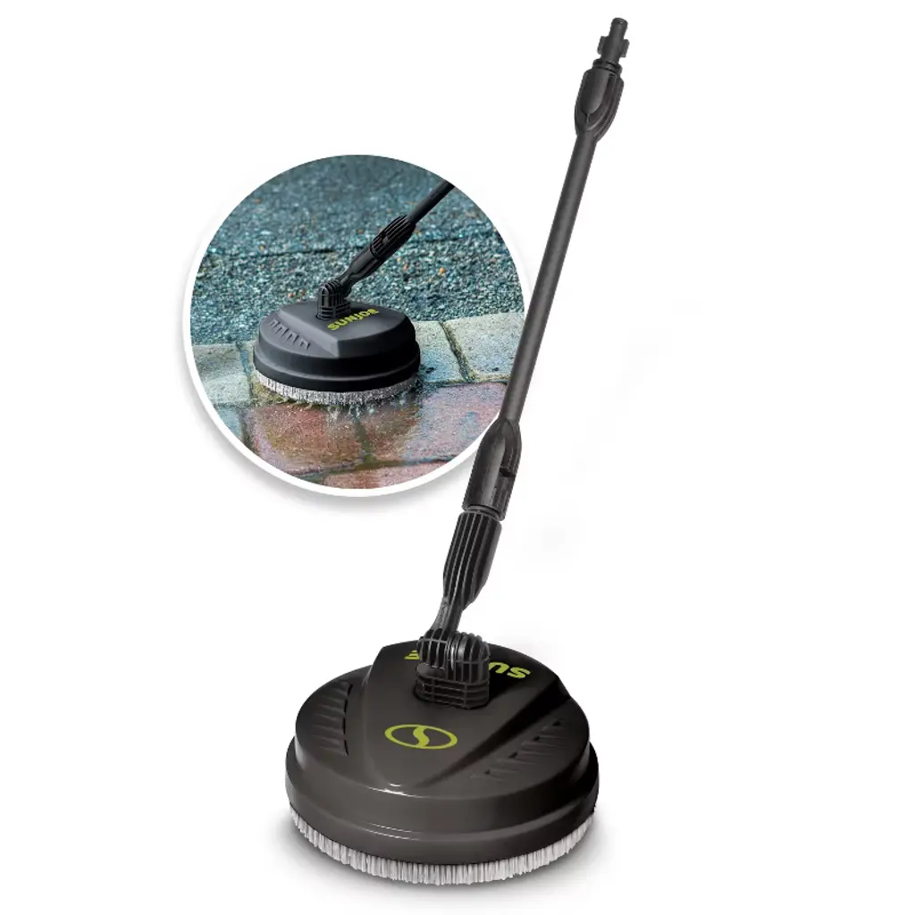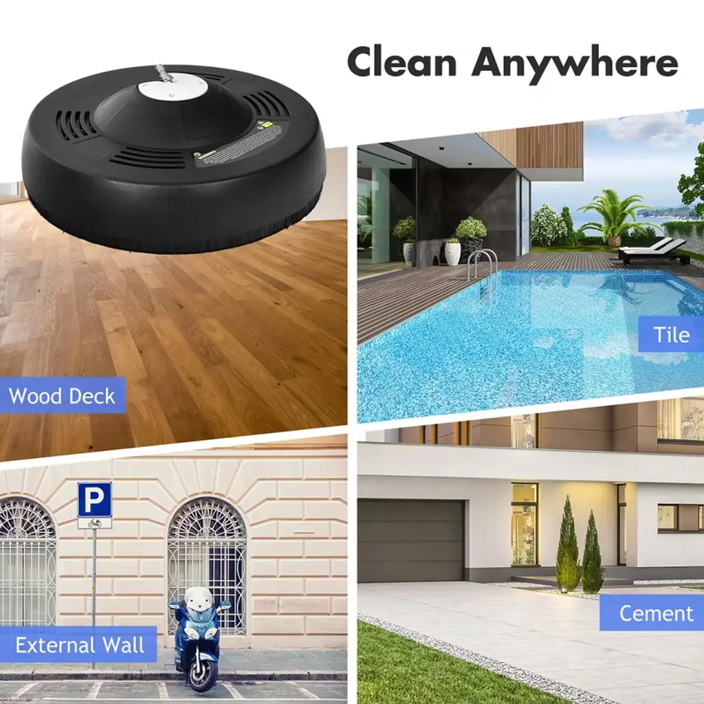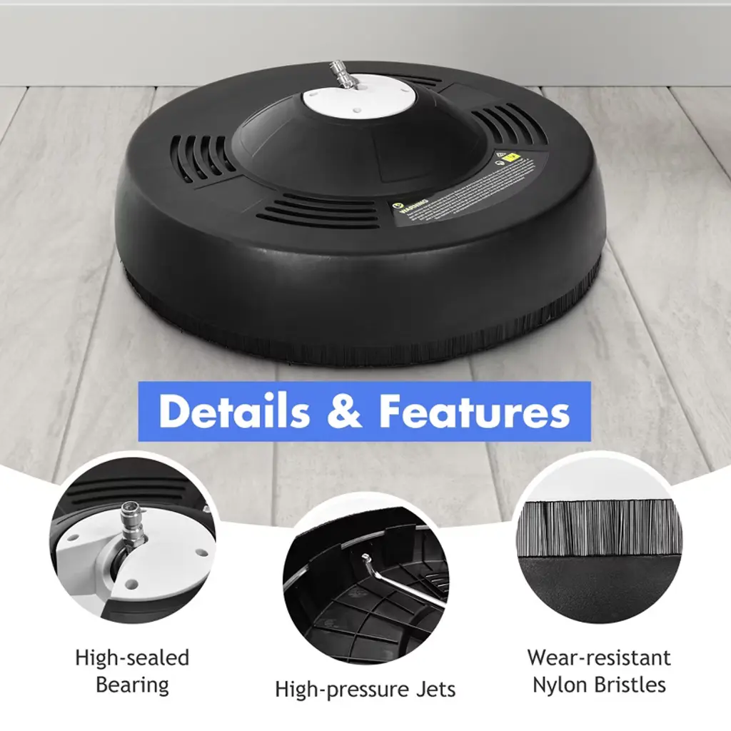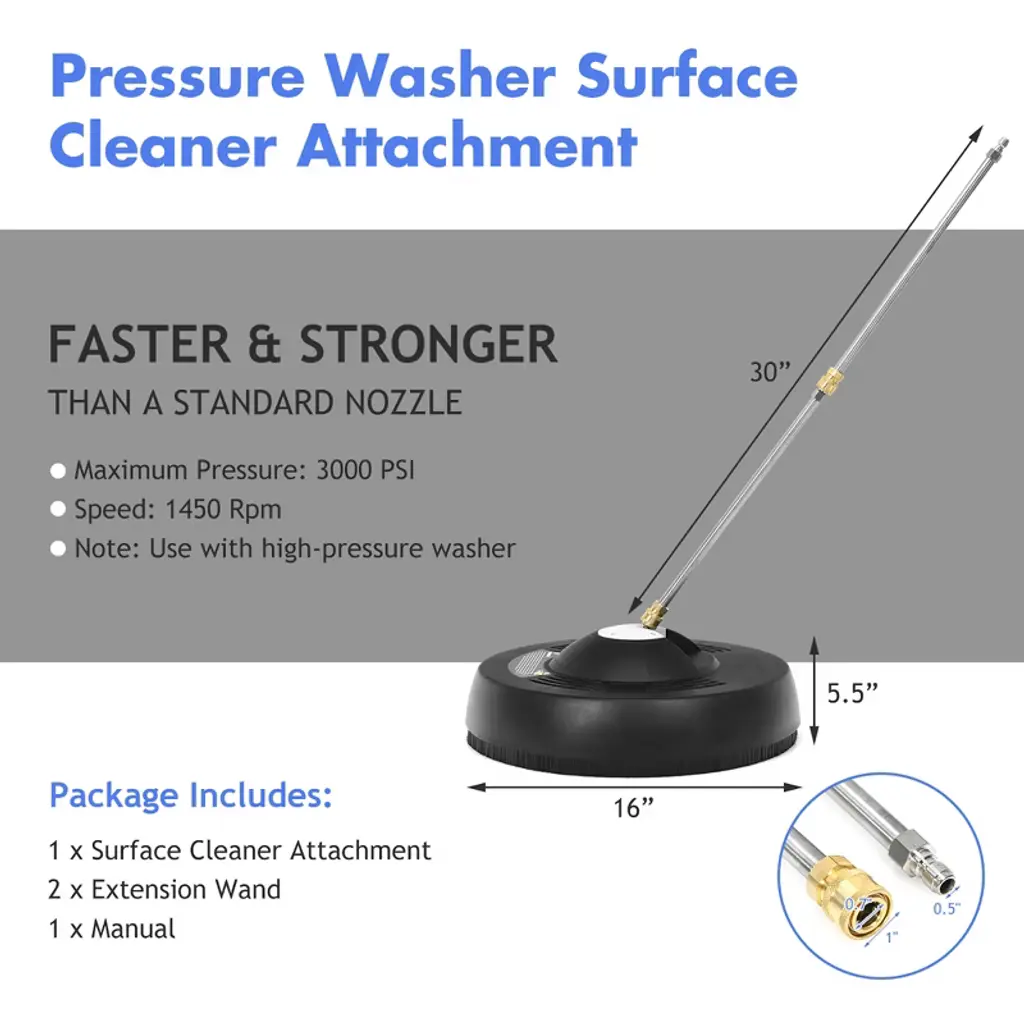 Our 16-inch pressure washer attachment is designed to clean large areas such as sidewalks, driveways, patios, decks and more. It combines high pressure water flow and spinning nozzles to provide you with a professional-level cleaning experience. To maximize its performance, the floor cleaner is compatible with most gas-powered pressure washers rated up to 3000 PSI, with nozzle speeds up to 1450 rpm. And it also comes with two quick-connect extension wands for your convenience. What’s more, the surface cleaner has a plastic cover that avoids splash and keeps you dry while you clean. Besides, composed of selected materials and built in high-sealed construction, the surface cleaner works well and serves you for long, so don’t miss it.Features16'' surface cleaner for efficiently cleaning large areas Can be used with high pressure washer up to 3000 psi Spinning nozzles at 1450 rpm for thorough cleaning Adopts 1/4-inch quick-connect interface to achieve fast installation 2 extension wands can be used separately for flexible cleaning Plastic cover with dense bristles keeps the users dry during cleaning High-sealed bearing with detachable strainer for long service lifeColor: Black Material: Iron, stainless steel, copper, PP plastic Overall Dimension: 16'' (Diam) X 5.5'' (H) Quick-connect inlet: 1/4'' Net Weight: 22 lbs Wand Length: 15'' Rotation Speed: 1450 Rpm Max Pressure: 3000 PSI Package includes: 1 x Pressure Washer Attachment 2 x Extension Wands 1 x User’s Manual