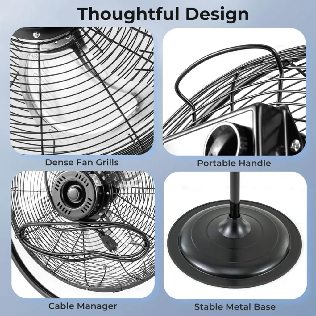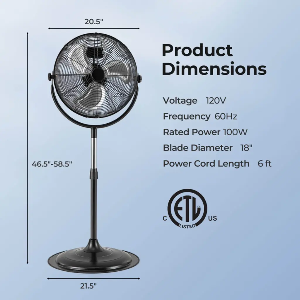 Keep your room cool and comfortable with our 18"/20" pedestal fan! With 3 speeds and adjustable height, you can customize the airflow to suit your needs. Our floor fan also features a powerful motor and aluminum blades for maximum efficiency and long-term use. The vertical oscillating function cools down every corner of your room. Furthermore, the round base helps it stay steady and stable in living rooms, bedrooms, home, offices, and more. The solid metal frame ensures great strength. The carrying handle and cable manager are also included for convenient use. Features3 speed settings meet different needs 360° vertical oscillating function to control the direction of airflow Strong motor and blades for better ventilation Heavy-duty metal structure for long-lasting use ETL certification for safe and reliable use Carrying handles for easy transportation Cable manager to organize the power cords Assembly needed Color: Black Material: Metal, Aluminum Product Dimensions: 21.5" x 46.5"-58.5"/21.5" x 50"-61.5" (Dia. x H) Fan Cover Diameter: 20.5"21" Fan Blade Diameter: 18"/20" Power Cord Length: 6 ft Number of Blades: 3 Voltage: 120V Frequency: 60Hz Rated Power: 100/120 W Airflow Volume: Low: 2568/2695 CFM Medium: 3210/3368 CFM High: 4012/4201 CFM Noise Level: 18inch: 60.22/64.79/67.89dB 20inch: 66/71/74dB Net Weight: 18/21 lbs Package Includes: 1 x Industrial Pedestal Fan 1 x Instruction
