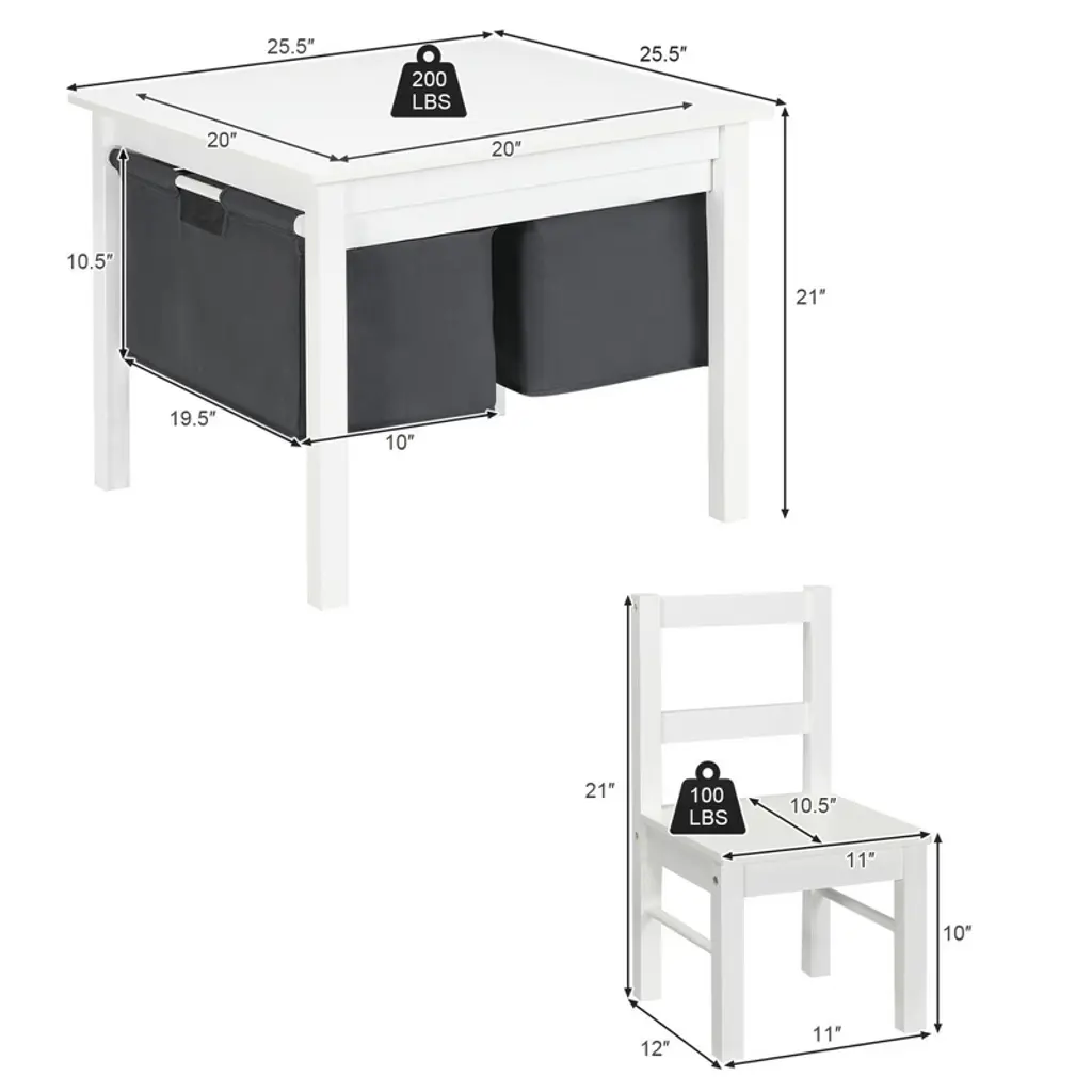 We've got you a wonderful kids activity table and chair set to bring your kids a happy and meaningful childhood. This kids furniture set includes a block building table with two storage drawers and two matching chairs. With a double-sided table panel, your kids can enjoy building up blocks for fun and flip it over to create a flat place for learning and drawing. Under the table, there are two non-woven fabric drawers with large capacity to store all kids things inside and keep the room clean and tidy. This set is constructed with premium MDF with exquisite crafts to offer your kids an ideal activity place. The chair is also sized perfectly for kids and toddlers to sit easily and stably. It will be the best gift for your kids.FeaturesColor: Espresso / White Material: MDF, Non-woven Fabric Dimension of Table: 25.5'' x 25.5'' x 21'' (L x W x H) Dimension of Chair: 11'' x 12'' x 21'' (L x W x H) Block Board Size: 20'' x 20'' (L x W) Drawer Size: 19.5'' x 10'' x 10.5'' (L x W x H) Net Weight of Table: 16 lbs Net Weight of Each Chair: 5 lbs Weight Capacity of Table: 200 lbs Weight Capacity of Chair: 100 lbs Age Range: 3-8 Years Package includes: 1 X Kids Activity Table 2 X Chairs 1 X Instruction