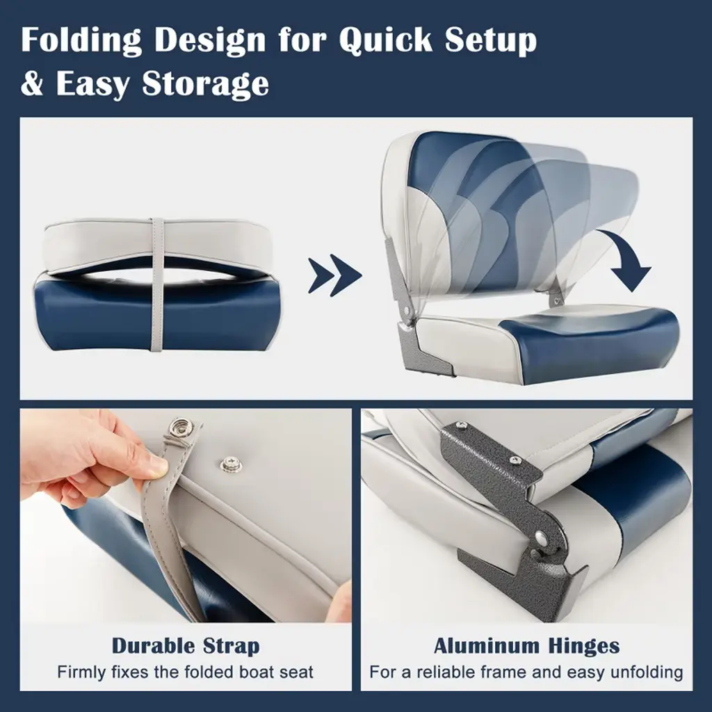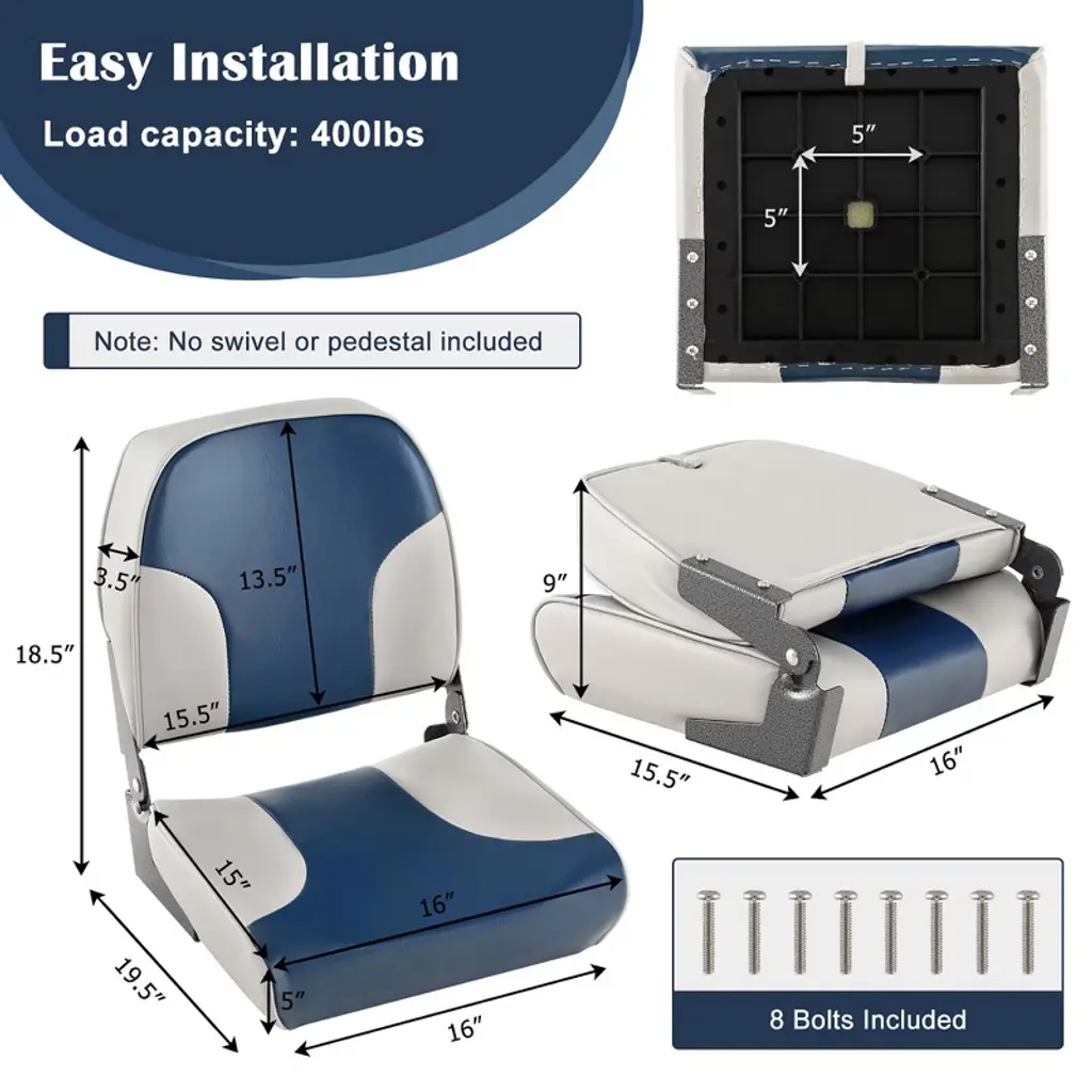 The 2-piece boat seat set is a thoughtful addition to your fishing! For comfort, each fish seat is filled with high-density sponge & covered with superior PVC leather, so you won't feel too tired during a long-time boating. Besides, PVC has great water resistance, wear resistance & fade resistance, ensuring better durability. The low back and widened seat will create a very cozy space for you, while each fish seat could be folded to free up more activity space. Especially its aluminum hinges are helpful to enhance sturdiness, approved by overall load capacity of 400lbs, and smooth folding operation. Based on reality, you can just put each fish seat on a platform or fix it on a supporter with 8 included bolts. Distance between bolt holes is 5'', which is applicable to most bases. Please note that no swivel or pedestal included.FeaturesFolding design for quick setup & easy storage Exterior PVC leather is waterproof & wear resistant Ergonomic backrest to free you from back pain 5'' thickened seat with cozy touch for comfort Interior sponge is soft & not easy to deform Aluminum hinges for a reliable frame and easy unfolding sturdy strap firmly fixes the folded boat seat Could be mounted on a supporting base or placed on a platform 5'' between bolt holes suitable for most support base Easy installation with a detailed manual and 8 bolts included Note: no swivel or pedestal includedColor: Blue & Gray Material: PVC, Sponge, Aluminum, PP Unfolded Size: 16'' x 19.5'' x 18.5'' (L x W x H) Folded Size: 16'' x 15.5'' x 9'' (L x W x H) Backrest Size: 15.5'' x 3.5'' x 13.5'' (L x W x H) Seat Size: 16'' x 15'' x 5'' (L x W x H) Load Capacity: 400lbs Net Weight: 13lbs Package Includes: 2 x Boat Seat 8 x Bolt 1 x User Guide