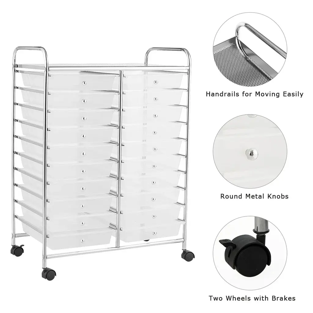 Do you want to have a storage cart which can be rolled smoothly from one place to another? Our 20-drawer rolling storage cart which will provide enough storage space for you.It is great for paper, tools, accessories, crafting, scrap booking or home office, help you to organize and make your tools in order.Constructed of industrial-strength metal tubes and finished in chrome, the cart is sturdy toserve you for a long time. Equipped with easy-to-grab handles and 4 universal wheels, it is easy to move the lightweight cart. And 2 of the wheels have simple lock for stopping easily. With our practical cart, you can store various things from art and office supplies to clean or kitchen essentials.Itis Ideal to arrange your different stuff at office, home, school and garage or just about anywhere organization is needed. Feature20removeable drawers for storage and classify Metal frame and plastic drawers,durable andcan be used for long time 4 universal wheels(2 with lock) for easymovement and fixation Drawers slide through metal channels with noresistance Drawer with handle for easy closing and opening Easy to pull or push the cart with 2 handles on the top Spacious storage space on the top of the cart Ideal drawer storage cart for home, office, garageand school Drawers are easy to clean with soap and a damp cloth Easy to assemble in short time according to instructionSpecificationColor: Multicolor/Black/White/Grey/Macaron/Pink Gradient/Mutli Color Material: iron, plastic Overall size:25''x15''x 34''(LxWxH) Inner Size of Drawer:13''x 10'' x 2.5''(LxWx H) Diameter of wheel: 1.5'' Weight of Cart: 16lbs Maximum Weight of Top: 22lbs Maximum Weight of Drawer: 3lbs Package Include: 1 x 20-drawer rolling cart 1 x instruction