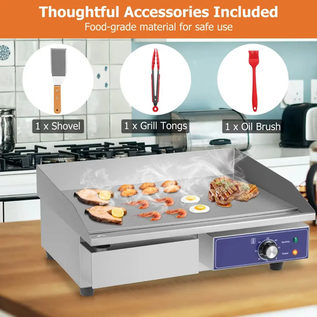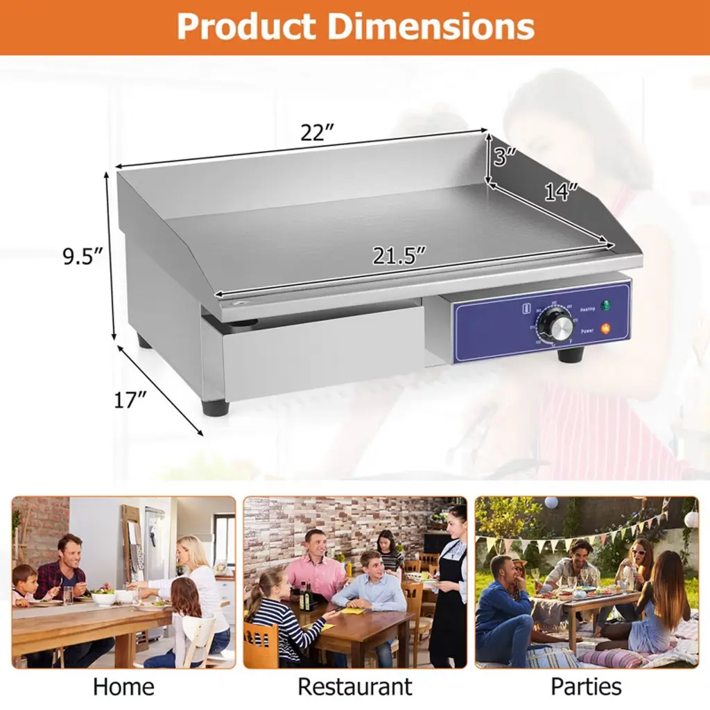 Step up your cooking game with this the electric griddle. It is equipped with 2000 W high-power annular heating tube and offers fast and uniform heating. In addition, the adjustable temperature from 122℉ to 572℉ allows you to precisely set different temperatures for different foods. Plus, the 300 sq.in. large cooking area whips up multiple dishes at once, making mealtime a breeze. The electric griddle is constructed of stainless steel with a nonmagnetic steel frame for easy maintenance. Moreover, the provided shovel, grill tongs, and oil brush simplify your cooking process. Note: it’s normal that the baking pan will turn black when heated.FeaturesEfficient 2000W output for rapid heating Spacious 300 sq.in. cooking surface for multiple dishes Adjustable temperature control from 122℉ to 572℉ Sturdy stainless steel frame for longevity Includes essential accessories for ease of use Easy maintenance with nonmagnetic steel With user-friendly details like radiating holes and rubber non-slip feet Suitable for home, restaurant, parties and moreColor: Silver Material: Cast Iron, Stainless Steel Product Dimension: 22" x 17" x 9.5" (L x W x H) Cooking Area: 21.5" x 14" (L x W) Style: All Flat Voltage: 110 V 60Hz Power: 2000W Temperature Range: 122℉-572℉ Cable Length: 5.2 ft Net Weight: 47 lbs Package includes: 1 x Electric Griddle 1 x Shovel 1 x Grill Tongs 1 x Oil Brush 1 x User Guide