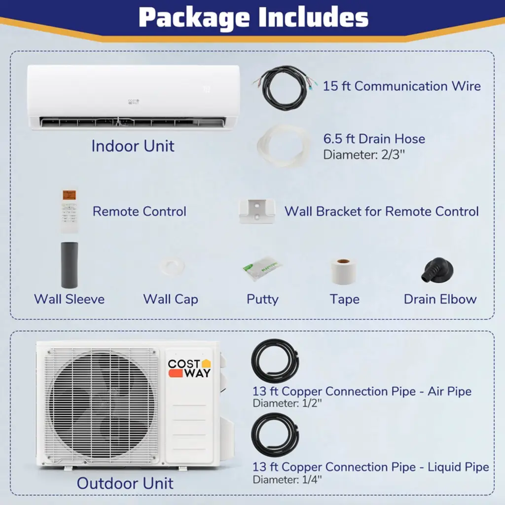 Effortlessly control your home's climate with this smart-enabled mini split AC system. Compatible with Alexa and Google Assistant, you can adjust settings via the app, remote, or voice control. With multiple mode, fan speeds, and convenient features like 24H timer and self-cleaning, our AC unit meets all-season needs. Our inverter technology provides energy-efficient and precise temperature control. The package comes with a required installation kit. Note: Professional installation is recommended for optimal performance.Features7 modes meet year-round needs 7 fan speeds: auto, low, low-mid, mid, mid-high, high, turbo Built with the inverter technology for less power consumption Allows you to enjoy sound sleep with quiet operation and comfortable wind Features 24H timer, child lock, auto swing function, and more High-temp self-cleaning at 135℉: condensation, frost, melting, sterilization Convenient maintenance with removable and washable filters Includes a remote control with a 39 ft maximum effective distance Available for app or voice control Comes with a comprehensive installation kit Note: The installation should be done only by a Licensed HVAC Installer Color: White Material: Metal, Aluminum, Copper Indoor Unit Dimensions: 30.5" x 9.8" x 8.2"/30.5" x 9.8" x 8.2"/35.8" x 11.5" x 8.9"/39.5" x 12.4" x 9.3"(L x W x H) Outdoor Unit Dimensions: 31.1" x 11.4" x 19.5"/30.9" x 11.4" x 19.7" /32.1" x 11.8" x 21.5"/34.3" x 13.8" x 23.6"(L x W x H) Diameter of Air Pipe: 3/8" / 3/8" / 3/8" / 1/2" Diameter of Liquid Pipe: 1/4" Diameter of Drain Pipe: 0.67" Max Remote Control Distance: 39 ft Voltage: 115V/ 208/230V~ 60Hz Cooling Capacity: 11500/11500/17000/23000 BTU Heating Capacity: 11500/11500/16500/22400 BTU Cooling Power: 1180/1170/1770/2365W Heating Power: 1005/1100/1440/1900W Coverage Area: 750/750/1250/1500 Sq.Ft Air Flow Volume: 276/294/412/676 CFM Dehumidifying Capacity: 66/66/81/122 Pints/Day Temperature Setting Range: 60℉~88℉ Refrigerant: R32 SEER2: 17 HSPF2: 9.5/8.3/8.5/9.5 Indoor Noise Level: 29/33/32/37 dB Outdoor Noise Level: 53/55/57/56 dB Net Weight of Indoor Unit: 20.5/20/24/29 lbs Net Weight of Outdoor Unit: 54/53.5/60.5/74.5 lbs Package Includes: 1 x Indoor Unit 1 x Outdoor Unit 1 x 13 ft Copper Connection Pipe - Air Pipe 1 x 13 ft Copper Connection Pipe - Liquid Pipe 1 x 19 ft Communication Wire 1 x 6.5 ft Drain Hose 1 x Remote Control 1 x Wall Bracket for Remote Control 1 x Wall Sleeve 1 x Wall Cap 1 x Drain Elbow 1 x Tape 1 x Putty 1 x User Guide