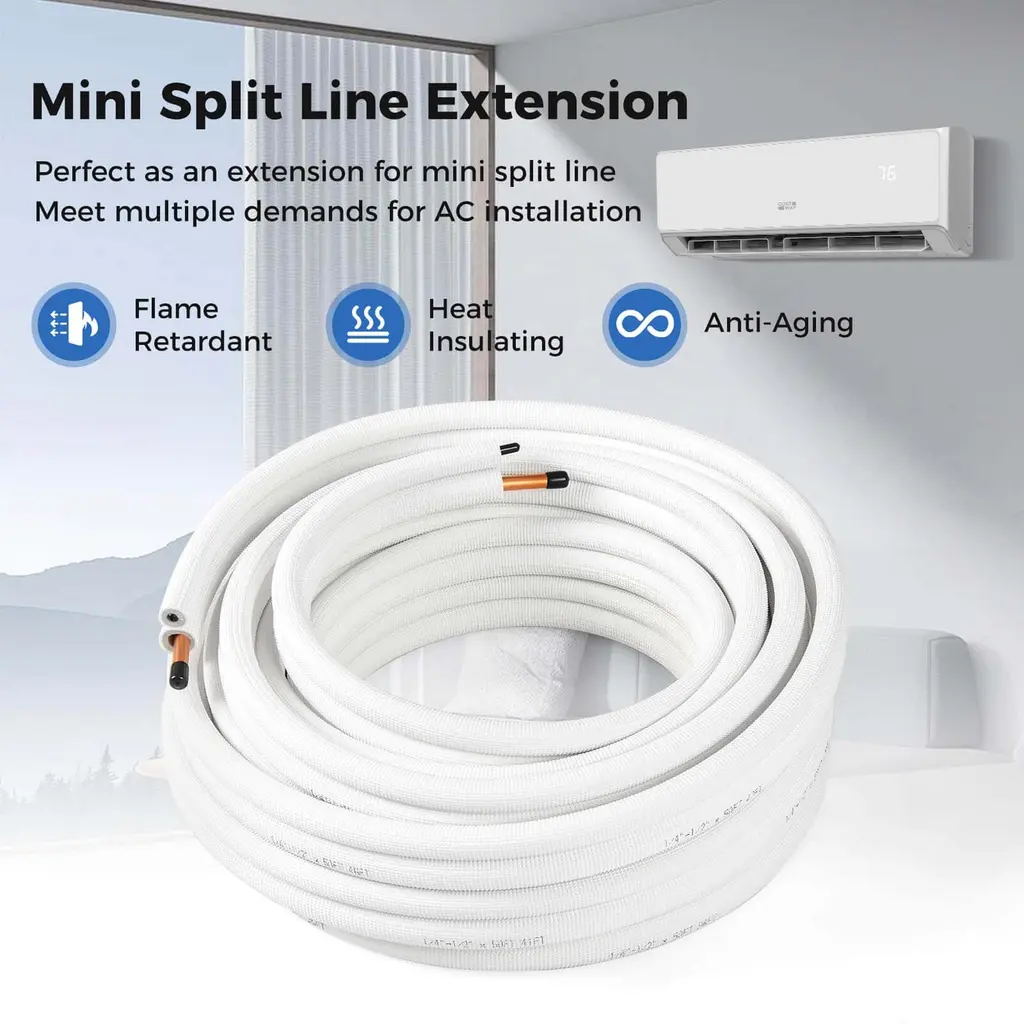 Enhance the efficiency and reach of your air conditioning systems with this robust copper tubing hose extension. Ideal for extending mini split AC systems, heating pumps, and various HVAC setups, this hose features a 1/4 inch O.D. high-pressure pipe and a 1/2 inch O.D. low-pressure pipe. The hose can be perfectly tailored for numerous applications including homes and commercial settings. The triple-layer insulated construction ensures maximum durability and thermal retention. For installation, simply unroll, cut to the desired length, and weld to the original piping. Invest in this reliable extension for a seamless and long-lasting upgrade to your air conditioning systems.Feature50 ft length for easy extension of mini split AC copper hose Includes 1/4 inch & 1/2 inch O.D. pipes Triple-layer insulated construction for durability Weatherproof exterior ensures long-lasting use Ideal for mini split AC and HVAC systems Suitable for homes, offices, and shopping malls Easy-to-install: simply unroll, cut, and weld Enhances efficiency in long-distance setups Resists corrosion and wear over time 3 layers: embossed polyethylene film, outer insulation and inner insulationSpecificationColor: White Material: Polyethylene Film, Foam,Cotton Length: 25/50 ft OD of High-pressure Pipe: 1/4" OD of Low-pressure Pipe: 1/2" Net Weight: 6/12.5 lbs Tensile Strength: ≥40 Package Includes: 2 x Copper Tubes
