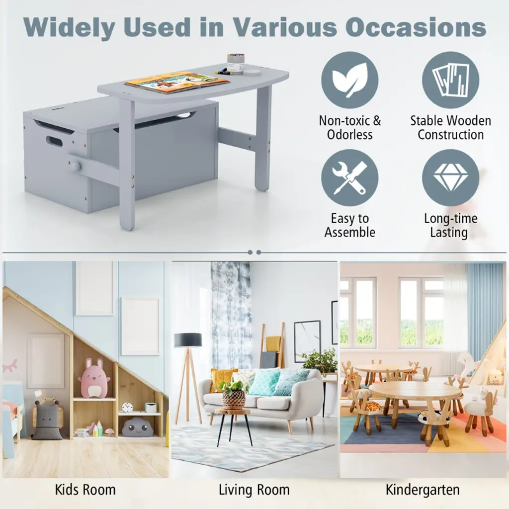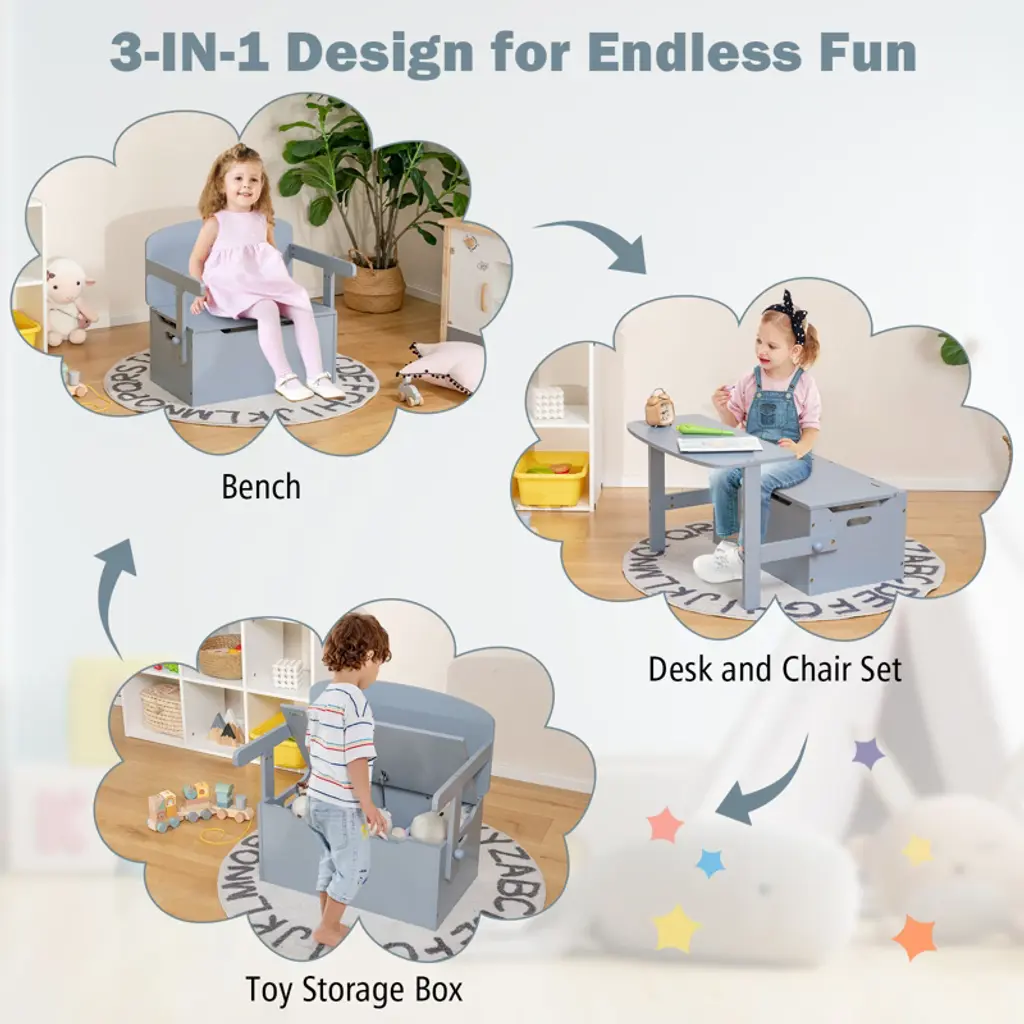 Costway 3-in-1 Kids Convertible Storage Bench Wood Activity Table And Chair Set Grey
