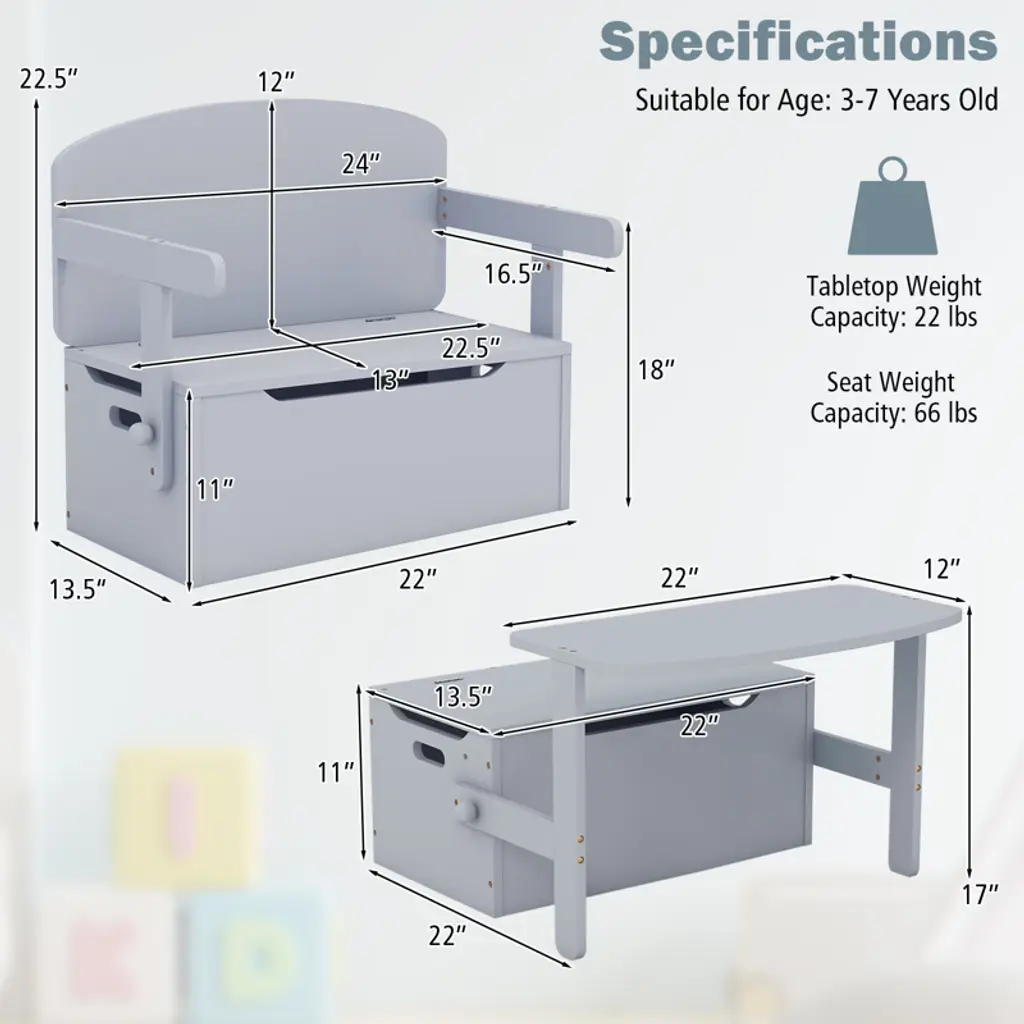 Tired of a toy covered floor? Our kids convertible storage bench is a perfect companion for your growing kids. And the large toy storage space helps to keep your home tidy and clean. This versatile bench with 3-in-1 design can be easily converted from a stool to a desk set, which is ideal for the kids room, kindergarten, art playroom and more. It can be used as a table and chair set for studying, drawing, and eating, or it can be turned into a stool for sitting and changing shoes. In addition, the safety pneumatic rod allows the storage box to open slowly and prevents the lid from shutting suddenly to avoid injury. Besides, the high quality material is stable and can be used for a long time.FeaturesAmple internal storage space for toys, books, clothes and helps keep clean It can also help your kids develop a good habit of organizing 3-in-1 design makes this activity chair a versatile companion for your kids Safe and odorless wooden structure is sturdy for long service time Offers comfortable seating experience due to the ergonomic backrest Safety pneumatic rod prevents the lid from shutting suddenly Safety groove at front edge for finger-pinch prevention The rounded corner design and armrests improve kids’ safety Simple to convert by rotating the switch bolt on the side of the chair 2 built-in handles on each side of the activity chair for easy movement The smooth surface is easy to clean and maintain Easy to assemble with detailed instruction Color: White/Natural/Grey Material: MDF Net Weight: 20.5 lbs Chair Size: 24'' x 16.5'' x 22.5'' (L x W x H) Desk Size: 22'' x 22'' x 17'' (L x W x H) Toy Box Inner Size: 21.5'' x 12'' x 8'' (L x W x H) Weight Capacity of Tabletop: 22 lbs Weight Capacity of Seat: 66 lbs Recommended Age: 3 – 7 years old Package Includes: 1 x 3-in-1 Kids Convertible Bench 1 x Instruction