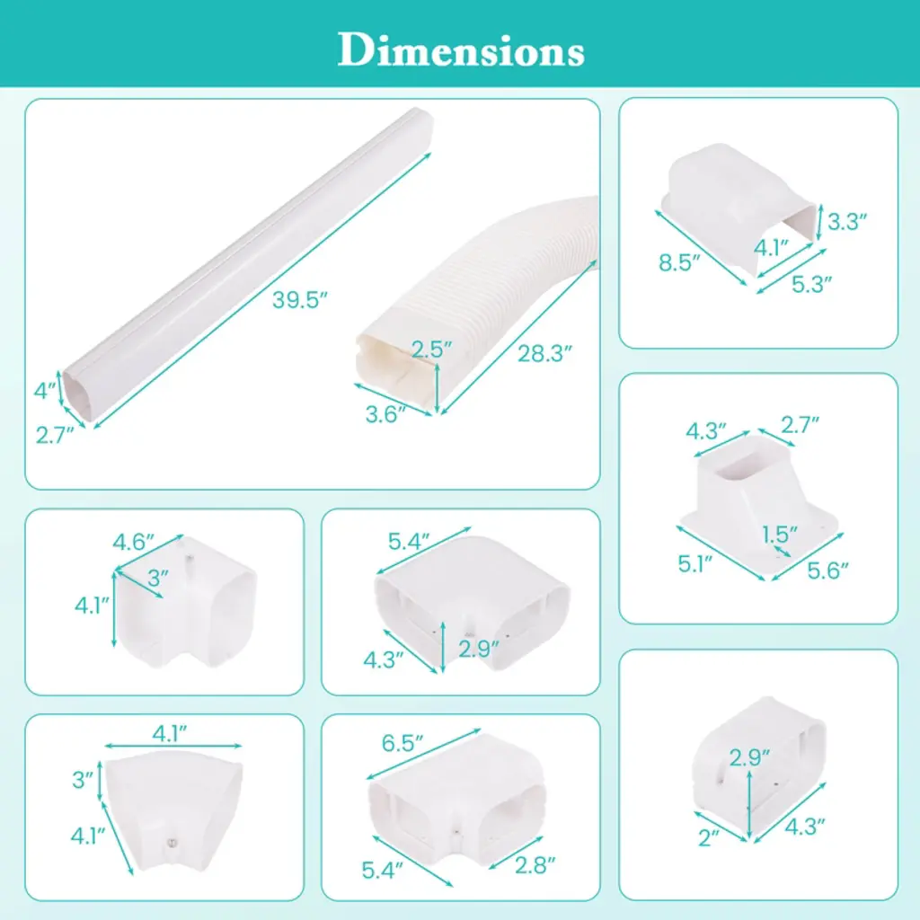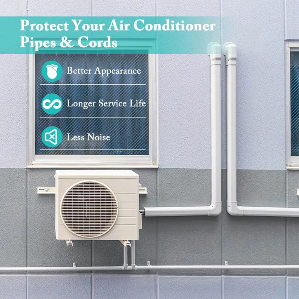 Enhance and protect your HVAC systems with our mini split line set cover! This line set cover kit is crafted from all-weather PVC that withstands various outdoor conditions, ensuring a longer service life. Included in this kit are a 28.3" flexible duct cover, two 39.5" straight duct covers and multiple connecters, designed to help route and conceal lines efficiently and attractively. The snap-in design and cuttable straight ducts allow for hassle-free DIY installation. The covers are compatible with systems from 7000 to 24000 BTU, making them a versatile choice for mini split ACs, central air conditioners, and heat pumps. Moreover, the paintable surface allows for a perfect integration into your outdoor or indoor environment.FeaturesProtect AC pipes from the elements to maintain efficiency Hide the split lines for better appearance and less noise Made of all-weather PVC, fearless of any weather Straightforward installation for quick setup Same total length, but fewer joints Can be painted to match building exterior Applicable to split & central AC Suitable for indoor & outdoor useColor: White Material: PVC Straight Duct Dimensions: 39.5"x2.7"x 4" (L x W x H) Flexible Duct Dimensions: 28.3"x 3.6"x 2.5"(L x W x H) Inside/Outside Corner Dimensions: 4.6"x 4.6" x 4.1" (L x W x H) 90° Elbow Dimensions: 5.4"x 5.4" x 4.3" (L x W x H) 45° Elbow Dimensions: 4.1"x 4.1" x 3"(L x W x H) Tee Dimensions: 6.5"x 5.4"(L x W) Wall Cover Dimensions: 8.5"x 5.3"x 3.3" (L x W x H) Inlet Dimensions: 5.6"x 5.1"(L x W) Connector Dimensions: 4.3"x2"x 2.9" (L x W x H) Total Net Weight: 10 lbs Package Includes: 4 x Straight Duct Cover 1 x Flexible Duct Cover 1 x Inside/Outside Corner 1 x 90° Elbow 1 x 45° Elbow 1 x Tee 1 x Wall Cap 1 x Inlet 1 x Coupling 1 x Screw Kit 1 x User Guide