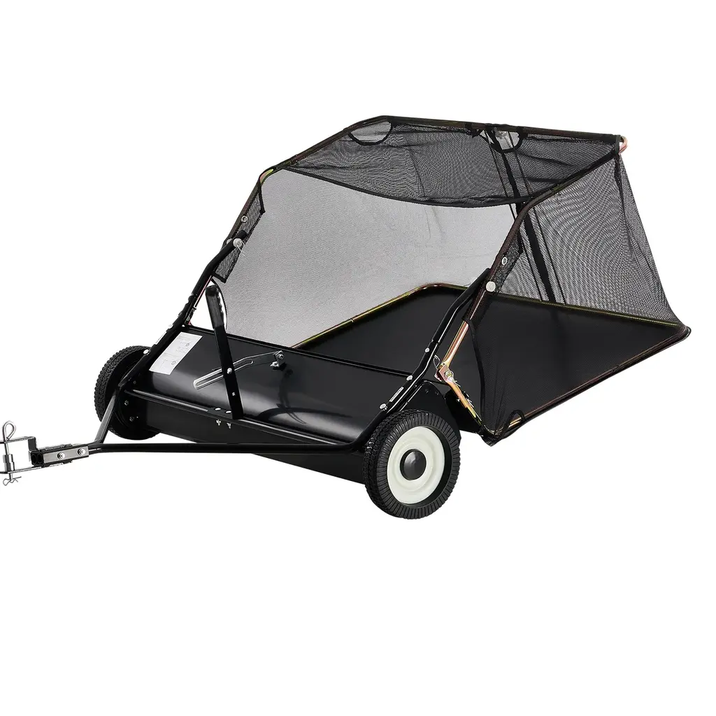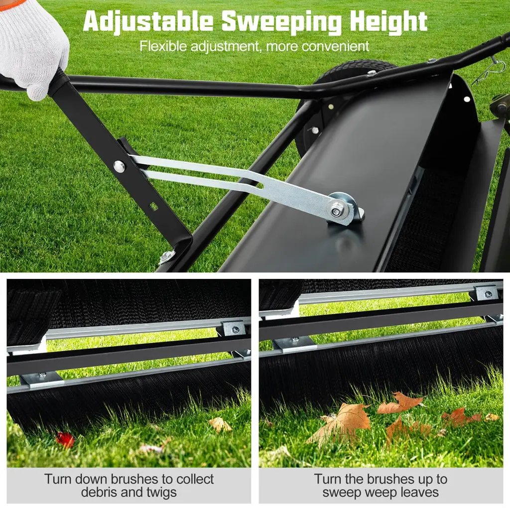 Effortless Maintain a Tidy Lawn! Our tow-behind lawn sweeper is a versatile tool that has been designed to achieve a clean, debris-free environment with minimal effort required. Featuring 4 sweeping brushes with 42" width and adjustable height, it ensures that large areas are covered quickly and is perfect for different kinds of surfaces and debris types, from grass clippings to fallen leaves. Moreover, it comes with a large-capacity hopper bag, capable of holding up to 26 FT³ of garden debris, making your cleaning process much more efficient. When the bag is full, easy to dump it by pulling the included rope. After your sweeping task is completed, the foldable design of the sweeper makes it effortless to store. Designed to attach quickly to any standard lawn tractor, ATVs, or UTVs via a universal fit hitch, this lawn sweeper is a must-have for those looking to complete their yard chores with efficiency and ease.Feature4 sweeping brushes increase sweeping areas, provide optimal sweeping power Adjustable sweeping height, flexible adjustment, more convenient Turn down brushes to collect debris and twigs, turn the brushes up to sweep weep leaves Adopts a robust non-woven mesh bag, tear-resistant, non-aging, built to last The hopper bag provides a large capacity of 26 FT³ for collecting garden debris Equipped with a convenient dumping rope, easy and effortless to empty the bag Comes with a universal fit hitch, convenient to attach your tractor hitch Ideal for various vehicles such as lawn tractors, ATVs, and UTVs The 10.5" large wheels provide better mobility for stabler and smoother sweeping Easy and effortless to fold for space-saving storage when not in use Foldable design, no tools requiredSpecificationColor: Black Material: Metal, Nylon, Mesh, Fabric Product Dimensions: 50" x 66" x 25" (L x W x H) Width of the Brushes: 42" Diameter of Wheels: 10.5" Hopper Capacity: 26 FT3 Net Weight: 59.5 lbs Package Includes: 1 x Lawn Sweeper 1 x Dumping Rope 1 x User’s Manual