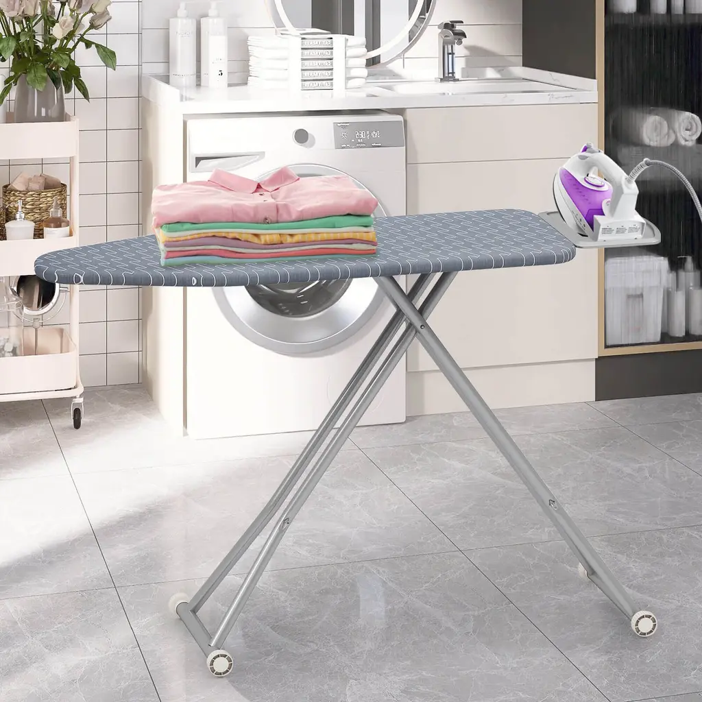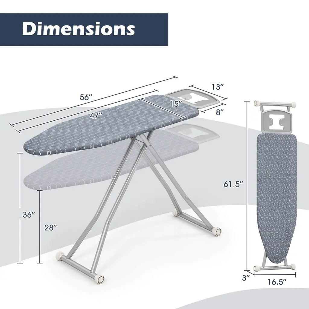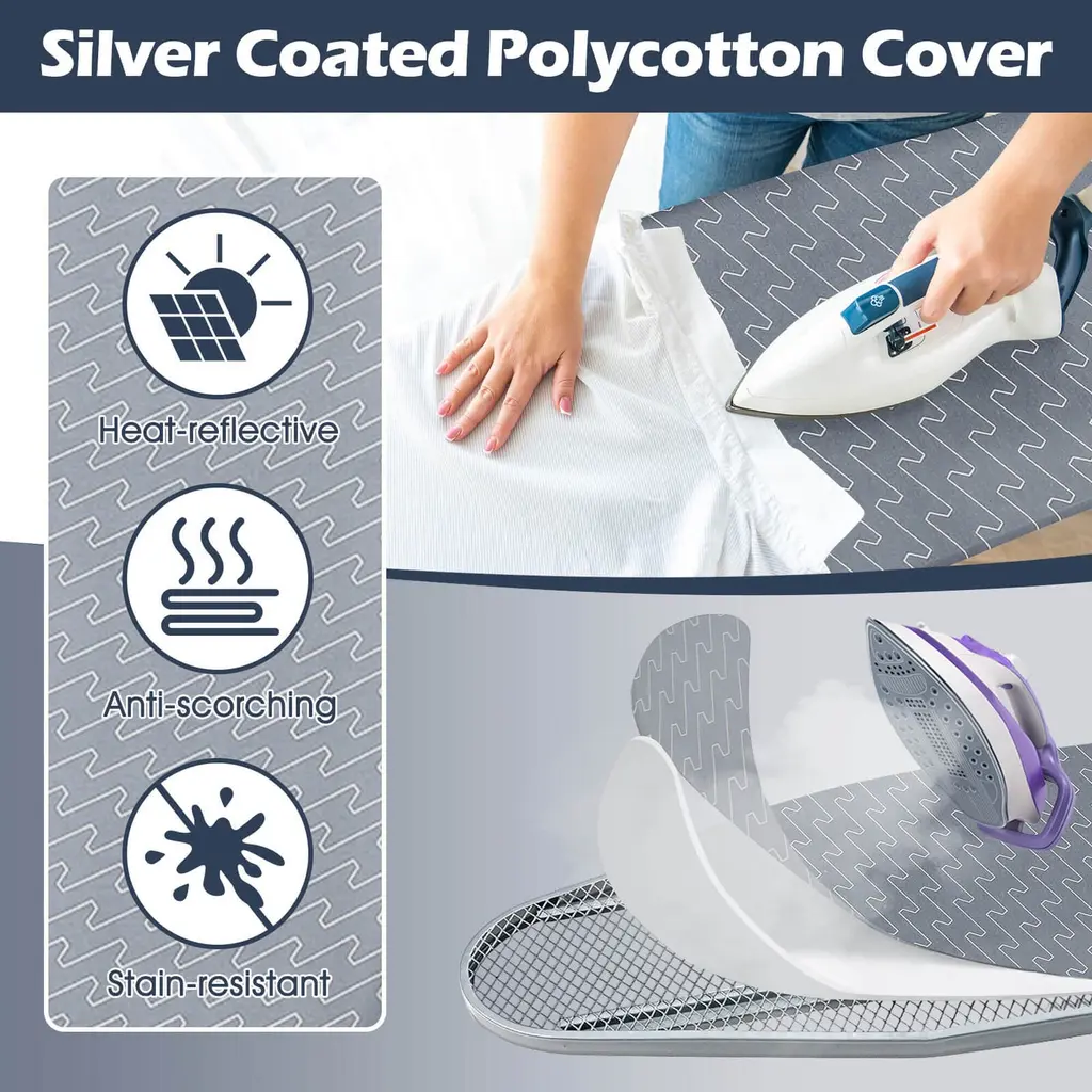 Elevate your ironing game instantly! Our deluxe ironing board will turn tedious chores into a breeze! with its silver-coated padded cover that speeds up ironing and shields your clothes from damage, you’re set for a seamless experience. Tired of backaches? Adjust this ironing stand to your preferred height from 7 available options - goodbye, discomforts! Plus, worry less with our secure iron rack that keeps mishaps at bay. Spacious yet convenient, our full-size board folds neatly away after breezing through any voluminous laundry batches. Engineered for rock-solid stability and equipped with floor-friendly foot pads, it’s the reliable, must-have tool every household deserves!FeatureSilver-coated cover for a heat-reflective, anti-scorching and stain-resistant surface Space-saving foldable design for laundry room and closet Ready out of box, no assembly required Handy iron rest is compatible with most irons Angled rest position to prevent accidental burns or damage Heavy-duty carbon steel frame ensures a high load capacity Stable T-shaped legs and sturdy X-shaped frame for added stability Non-slip foot pads to prevent unsightly floor scratches Removable fabric cover for easy maintenanceSpecificationColor: Grey Material: Polycotton Fabric, Carbon Steel, Foam Overall Dimensions: 56" x 16.5" x 23"-30" (L x W x H) Folding Dimensions: 61.5" x 16.5" x 3" (L x W x Thickness) Dimensions of Ironing Board: 47" x 15" (L x W) Dimensions of Iron Rack: 13" x 8" (L x W) Maximum Weight: 110 lbs Maximum Weight of Iron Rest: 10 lbs Net Weight: 10 lbs Package Includes: 1 x Iron Board