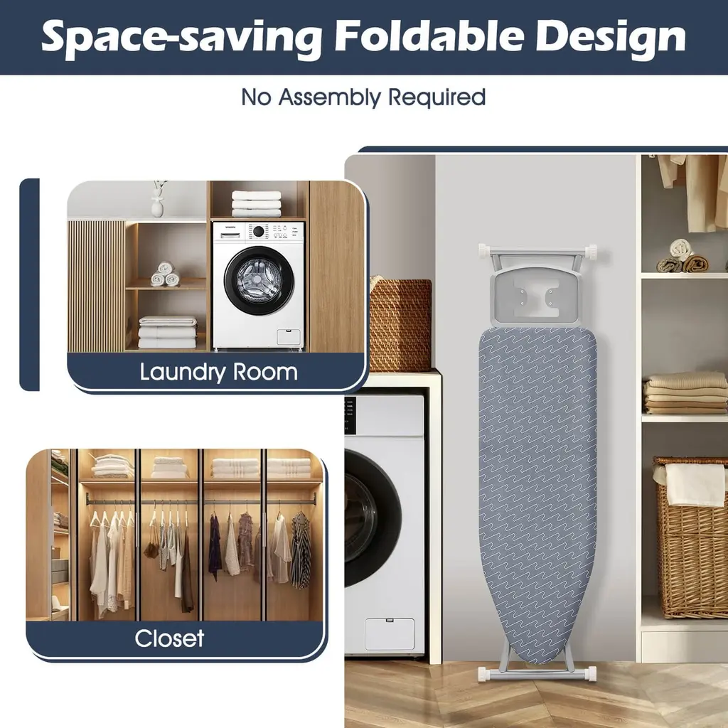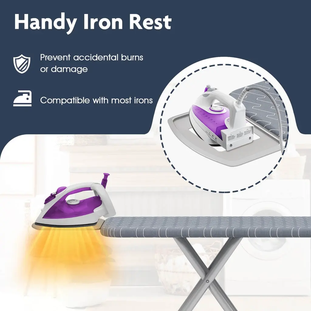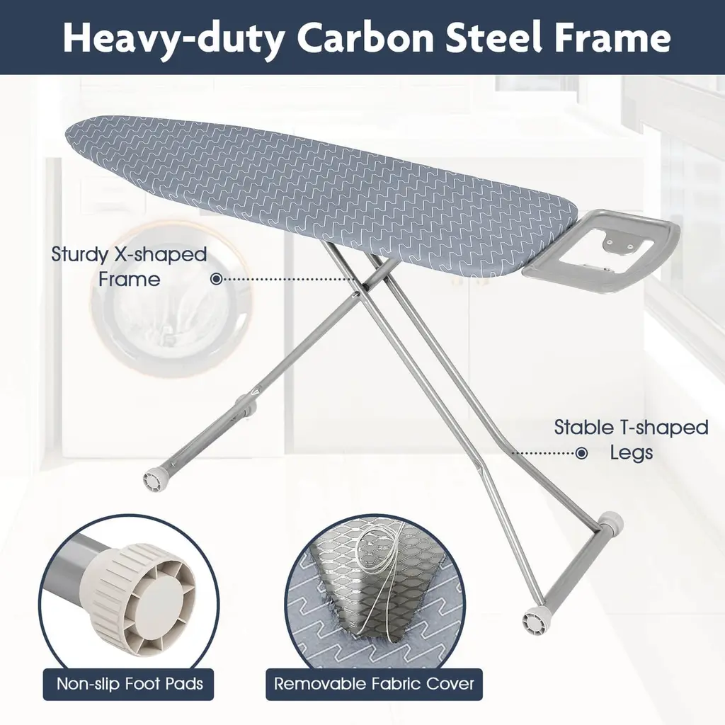 Elevate your ironing game instantly! Our deluxe ironing board will turn tedious chores into a breeze! with its silver-coated padded cover that speeds up ironing and shields your clothes from damage, you’re set for a seamless experience. Tired of backaches? Adjust this ironing stand to your preferred height from 7 available options - goodbye, discomforts! Plus, worry less with our secure iron rack that keeps mishaps at bay. Spacious yet convenient, our full-size board folds neatly away after breezing through any voluminous laundry batches. Engineered for rock-solid stability and equipped with floor-friendly foot pads, it’s the reliable, must-have tool every household deserves!FeatureSilver-coated cover for a heat-reflective, anti-scorching and stain-resistant surface Space-saving foldable design for laundry room and closet Ready out of box, no assembly required Handy iron rest is compatible with most irons Angled rest position to prevent accidental burns or damage Heavy-duty carbon steel frame ensures a high load capacity Stable T-shaped legs and sturdy X-shaped frame for added stability Non-slip foot pads to prevent unsightly floor scratches Removable fabric cover for easy maintenanceSpecificationColor: Grey Material: Polycotton Fabric, Carbon Steel, Foam Overall Dimensions: 56" x 16.5" x 23"-30" (L x W x H) Folding Dimensions: 61.5" x 16.5" x 3" (L x W x Thickness) Dimensions of Ironing Board: 47" x 15" (L x W) Dimensions of Iron Rack: 13" x 8" (L x W) Maximum Weight: 110 lbs Maximum Weight of Iron Rest: 10 lbs Net Weight: 10 lbs Package Includes: 1 x Iron Board