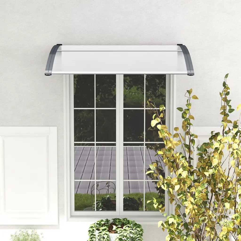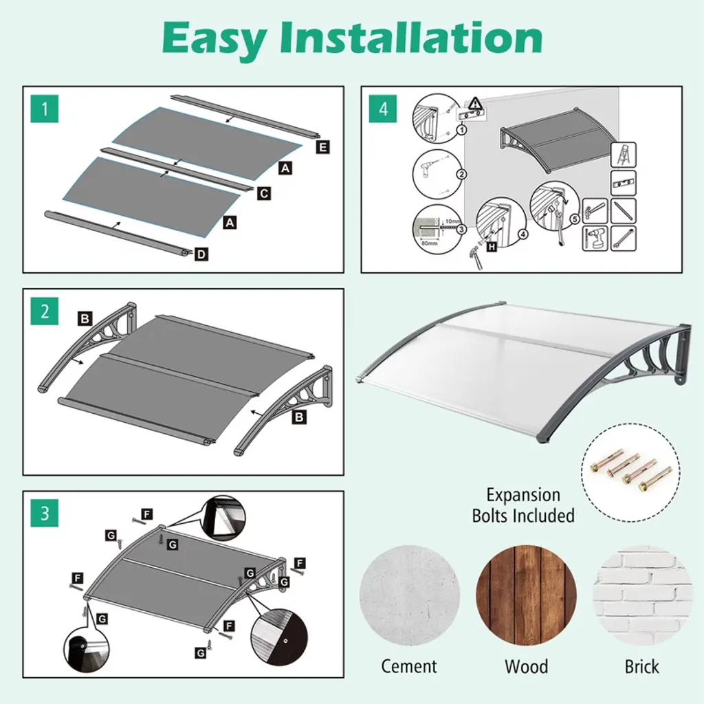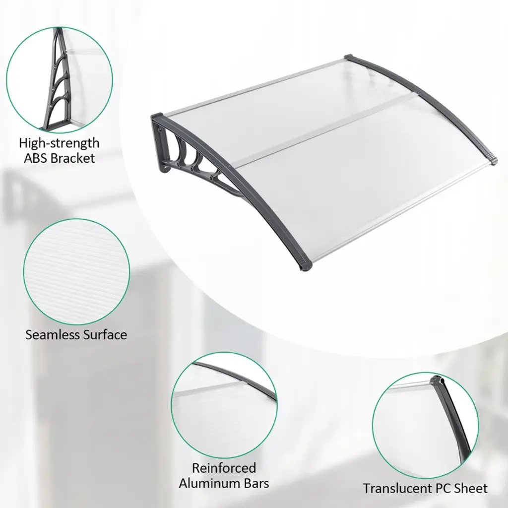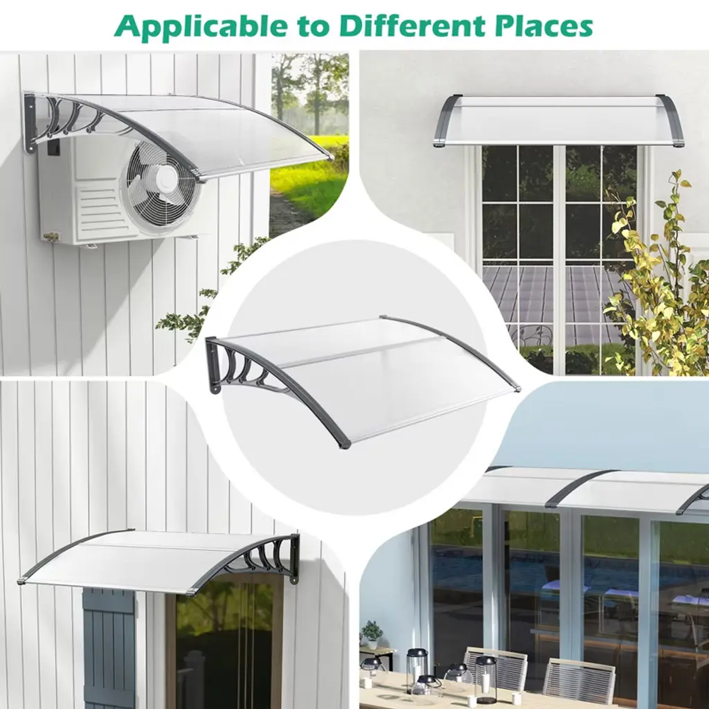 This is our brand new patio awning canopy. Not only does it add modern appeal to your home, it also protects your windows and doors from the sun, rain and other outdoor elements. Premium PC sheets are weather resistant and sturdy. The anti-UV layer provides increased protection against harmful UV rays. Furthermore, ABS brackets and aluminum bars ensure a strong and long lasting support. This awning exterior can be easily installed on brick, wood or concrete walls, ideal for residential and commercial applications. Decorate your living space with this window awning!FeaturesAble to withstand sunlight, rain, wind and snow Load capacity up to 44 lbs, safe and reliable use Thick PC sheet guarantees quality and durability ABS bracket and aluminum bars reinforce support The seamless surface ensures no water leaking A curved design to prevent water accumulation Easy to install on the wall with 4 expansion bolts Ideal for 3 different walls: cement, wood or brick A great addition to porch, patio, yard, shop, etc.Color: Black/Grey Material: Polycarbonate, Aluminum, ABS Overall Dimensions: 48" x 40" x 11" (L x W x H) Weight Capacity: 44 lbs Net Weight: 6.5 lbs Package Includes: 2 x PC Sheet 2 x Bracket 3 x Fixing Bar 4 x Expansion Bolt 1 x User's Manual