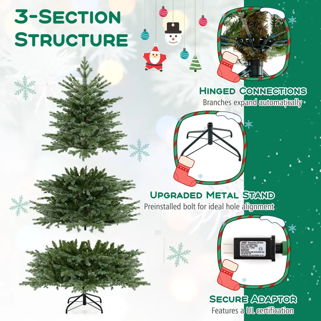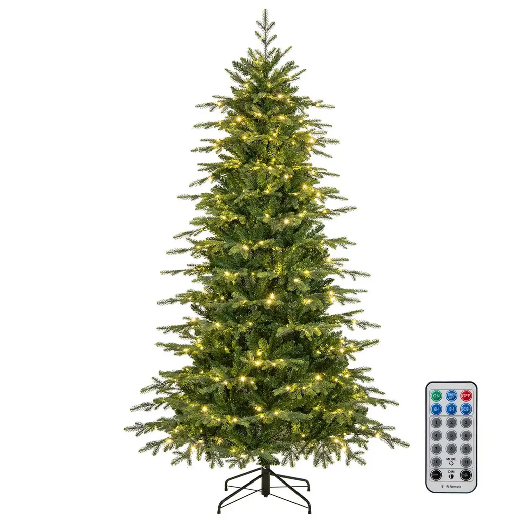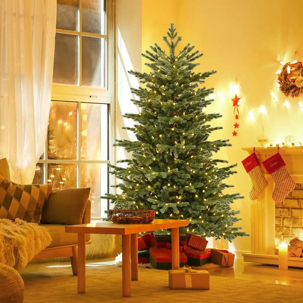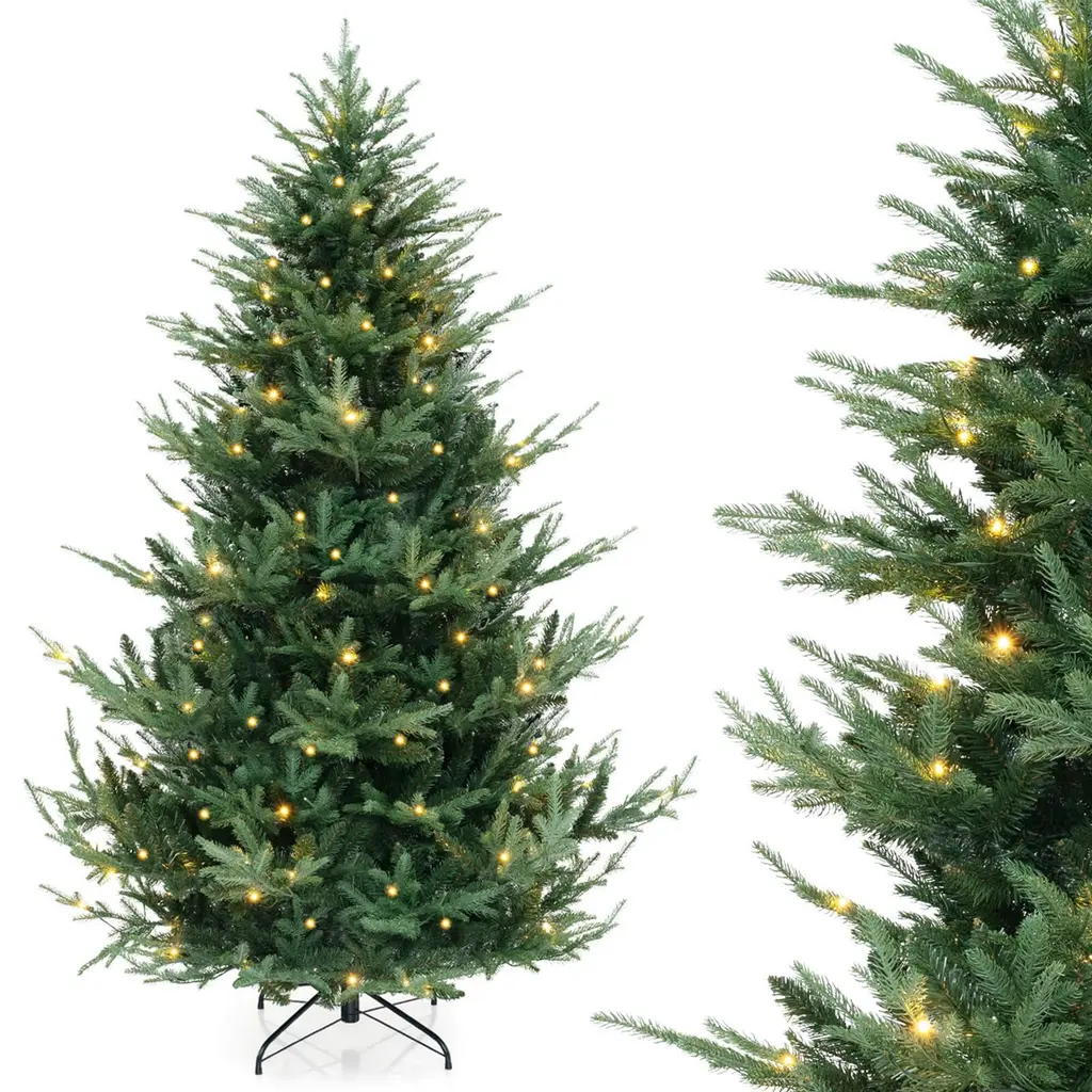 Transform your space into a spruce celebration with a 5/6/7 ft Xmas tree featuring 1426/2116/3156 branch tips for a full and vibrant look. Crafted from premium PE and PVC materials, this Christmas tree is safe, enduring, and smell-free. The 200/300/400 energy-saving LED lights offer a warm white, cozy glow. The Xmas tree is easy to assemble with a hinged design and a sturdy metal stand, while this tree has 2 pairs of gloves to protect your hands. Celebrate the season with the elegance of the vivid Xmas tree!FeatureLuxuriant decoration tree comes with up to 1426/2116/3156 branch tips Made of high-quality material that is safe for kids and pets 200/300/400 warm white LED lights illuminate your heart with festive cheer Each LED light features a special light shape for an adorable design Boasts a 2/3-section structure for convenient disassembly and easy storage Hinged connections ensure branches expand automatically Upgraded metal stand with a preinstalled bolt for ideal hole alignment Equipped with a secure adaptor that features a UL certification Wide use for your home, office, shop, school, and moreSpecificationColor: Green Material: PVC, PE, Metal Tree Height: 5/6/7 ft Tree Width: 3.6/4/4.5 ft Diameter of the Metal Base: 16/18/20" Number of Branch Tips: 1426/2116/3156 Number of LED Lights: 200/300/400 Number of Sections: 2/3 Net Weight: 11/16.5/25 lbs Package Includes: 1 x Pre-Lit Artificial Christmas Tree 2 x Pairs of Gloves 1 x User’s Manual