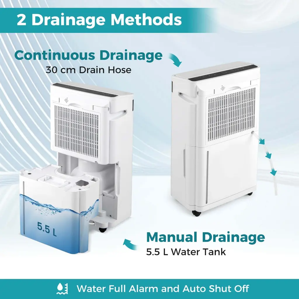 This dehumidifier is an ideal companion for maintaining a comfortable humidity level at your home! The dehumidifier is able to remove up to 57 pints of excess water per day, perfect for maintaining comfort in spaces up to 4500 sq. ft. 120° auto swing allows for even air distribution, improving dehumidification efficiency. This dehumidifier operates quietly and comes with 4 dehumidification modes and 2 fan speeds to cater to your specific needs. The intuitive touch panel ensures easy operation and the 3-color indicator offers immediate feedback about the current humidity level. Adding to its functionality, the dehumidifier features a 24-hour timer, a child lock, air clean function, sleep mode, etc. As for drainage, you can connect the included drain hose for continuous operation or manually empty the water tank when needed. Plus, the recessed handles and bottom wheels make it easy to move around. FeaturePowerful dehumidification for spaces up to 4500 sq.ft 4 dehumidification modes cater to varied humidity requirements 120° auto swing for enhanced dehumidification efficiency 24h timer permits setting operating times according to your schedule Touch panel with LED display allows for simple operation 3-color humidity indicator allows for easy monitoring Large water tank with visible water level and convenient handle 2 drainage options: manual drainage or auto drainage Sleep mode for better comfort during nighttime Low noise≤42 dB ensures a peaceful environment Removable and washable filter for easy maintenance Water full alarm and auto shut off for added safety Power cord organizer helps reduce clutter Air clean function to improve air quality With auto defrost, auto restart and child lock Effortlessly move from room to room with 4 wheelsSpecificationColor: White Material: ABS Product Dimensions: 14" x 8" x 24" (L x W x H) Voltage: 115V Frequency: 60Hz Rated Input Power: 240 W Rated Input Current: 2.9 A Dehumidification Capacity: 19 Pints/Day (65℉, 60% RH) 50 Pints/Day (86℉, 80% RH) 57 Pints/Day (95℉, 90% RH) Water Tank Capacity: 1.5 Gallon Humidity Setting Range: 30% - 80% Coverage Area: 4500 sq.ft Drain Hose Length: 12" Power Cord Length: 5.9 ft Noise Level: ≤42 dB Net Weight: 30 lbs Package Includes: 1 x Dehumidifier 1 x Drain Hose 1 x Instruction
