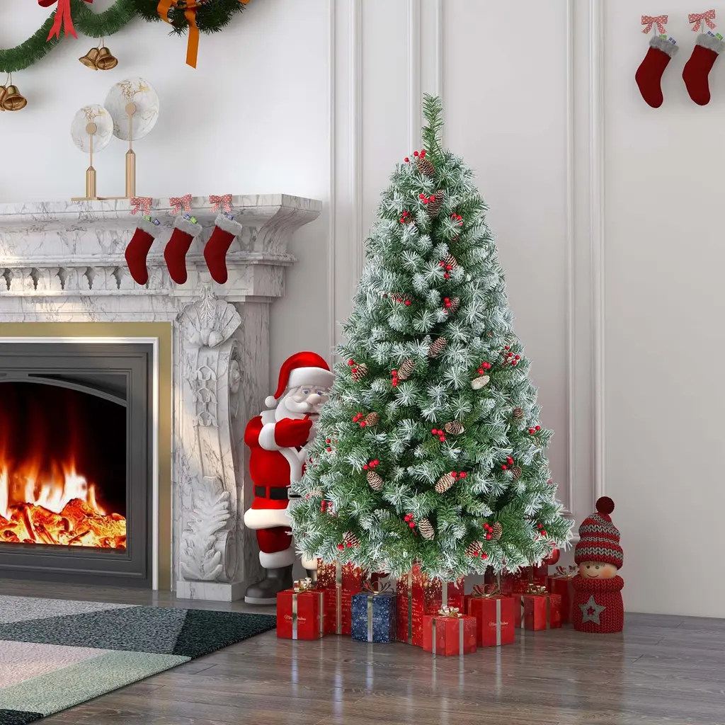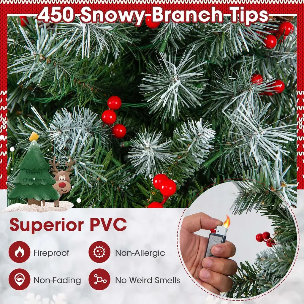 Create a rustic & elegant holiday atmosphere with this lifelike 5ft/6.5ft/7.5ft/9ft Xmas tree. It will imitate real trees down to the finest details. With 450/909 mixed branch tips, it mimics the natural shape & texture of real trees, while 42/69/89/103 pine cones & 126/207/267/309 red berries add a charming touch. Illuminate your festivities with 200/420/560/650 LED lights that emit a warm white glow, creating a magical ambiance without consuming too much energy or overheating. Choose from 8 different lighting modes (like combination, sequential, chasing/flash, etc), with the tree remembering the last mode used. Made from safe & sturdy PVC material, it is fireproof, non-fading & non-allergic, while remaining vibrant & has no weird smells. The hinged design allows for hassle-free setup, while the folding metal stand ensures stability. Perfect for homes, offices, malls, or even carnivals, the Xmas tree is a versatile & captivating addition to your holiday decorations. Feature450/909/1368/1740 snowy branch tips to perform a luxuriant tree shape With lush mixed leaves to achieve perfect simulation 42/69/89/103 natural pine cones as presents from the nature 126/207/267/309 vivid red berries make the Xmas tree more adorable Superior PVC with fire resistance, fade resistance & allergic resistance 200/420/560/650 warm white LED lights with 8 dynamic modes, like in waves, slo-glo or slow fade Memory function will restore previous mode upon startup Hinged connections make the 2/3-section frame easy to assemble Folding metal stand with anti-slip foot pads for great stability Safe adaptor with a button to change the lighting mode Deliver your best wishes in the office, home, shop, mall and more Please note that ornaments are not includedSpecificationColor: Green & White Material: PVC, Pine Cones, Metal Tree Height: 5 ft/6.5 ft/ 7.5 ft/9 ft Tree Width: 2.7 ft/3.5 ft/4 ft/4.3 ft Diameter of Stand: 16”/18”/ 22”/26” Number of Sections: 2/3/4/4 Number of Branch Tips: 450/909/1368/1740 Number of LED Lights: 200/420/560/650 Number of Pine Cones: 42/69/89/103 Number of Red Berries: 126/207/267/309 Net Weight: 10 lbs/19 lbs/ 29 lbs/40 lbs Package Include: 1 x Artificial Xmas Tree 1 x User Guide