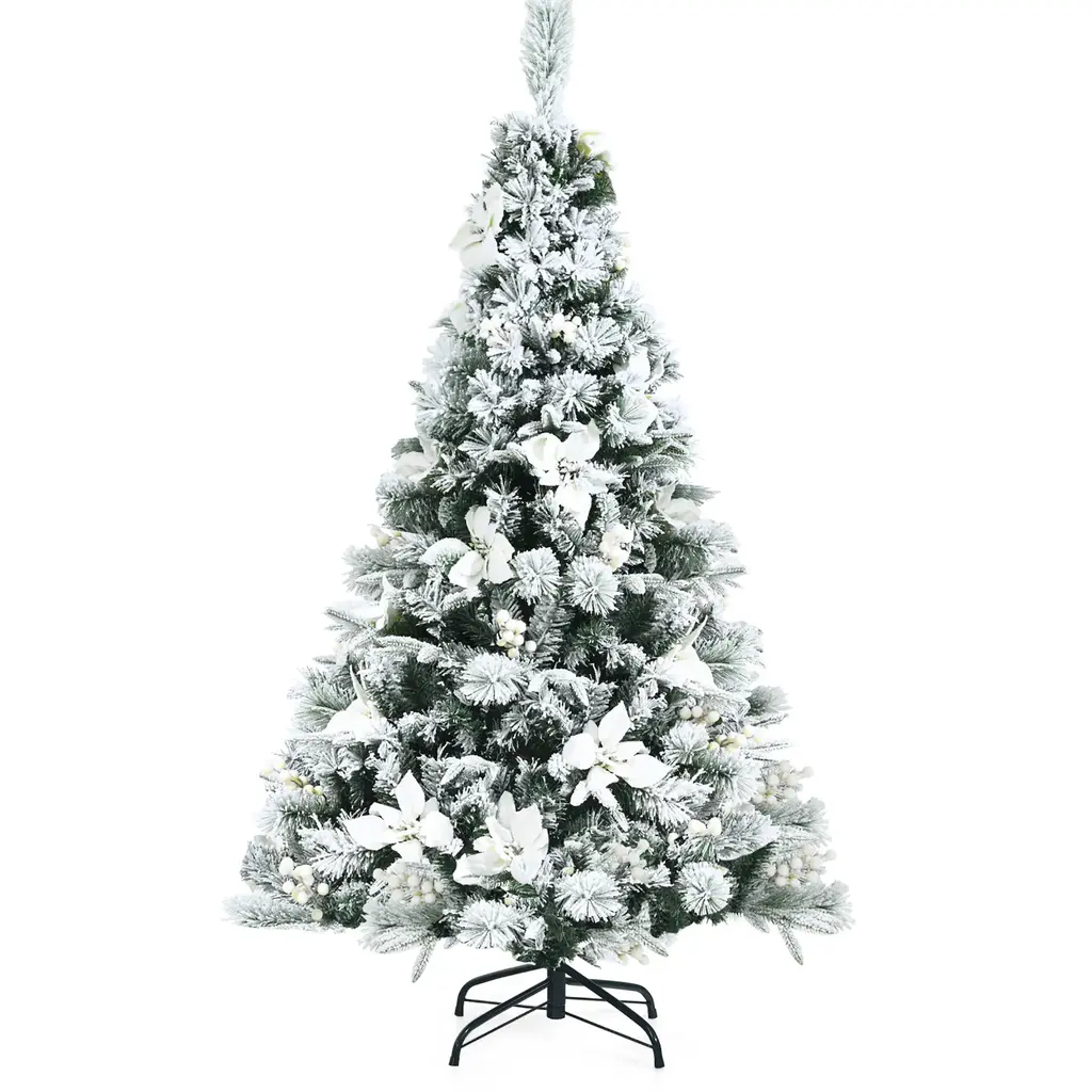 Born to Christmas decoration for any senses! This upgrades Christmas tree is plumper and bigger,which allows you to decorate various kinds of items and put many gifts below the tree. The high-quality natural leaves are fire-resistant, non-allergic, and non-odor, which ensure safe touch for your kids and pets. And the snow-flocked tree is pre-decorated with viarious white berries and lily-white poinsettia flowers, adding a luxurious and elegant look. And the metal stand offers high stability and sturdiness to help the tree stay straight. The Christmas tree will accompany you and your family for many happy Christmases!FeatureWhite berries and poinsettia flowers add a luxurious and elegant look Various branch tips for leafy and realistic appearance Come in 2-3 tree trunks with hinged design for quick assembly and easy storage Sturdy metal stand with antiskid foot caps to ensure stability and balance Fire-resistant and non-allergic PVC & PE leaves ensure safety Snow flocked leaves create a unique wintry feel Ideal for home, office, shops, wedding, party,etcSpecificationColor: White Material: PVC& PE& Metal Package includes: 1 x Snow Flocked Christmas Tree 1 x Metal Stand Height: 5FT Net Weight: 10.5lbs Number of Tips: 405 Height: 6FT Net Weight: 16lbs Number of Tips: 631 Height: 7FT Net Weight: 24.5lbs Number of Tips: 919 Height: 8FT Net Weight: 32lbs Number of Tips: 1239