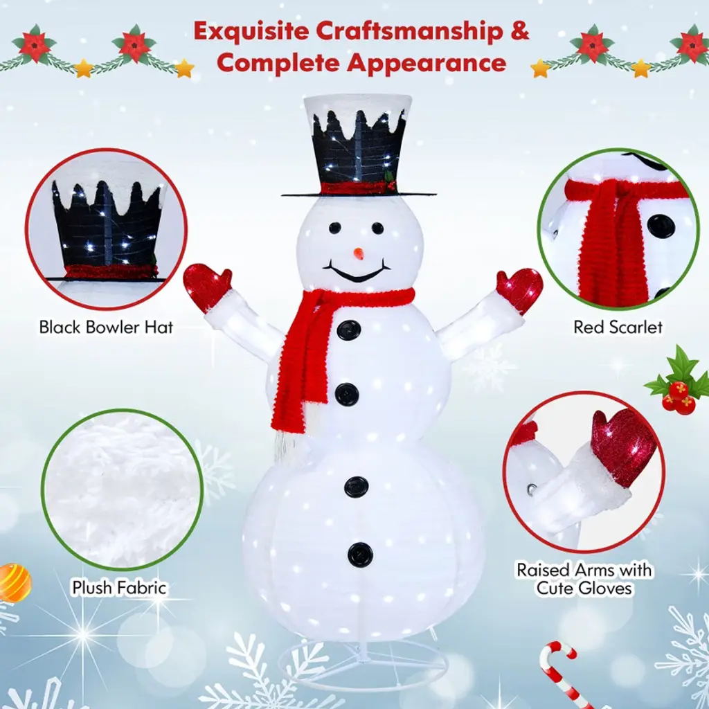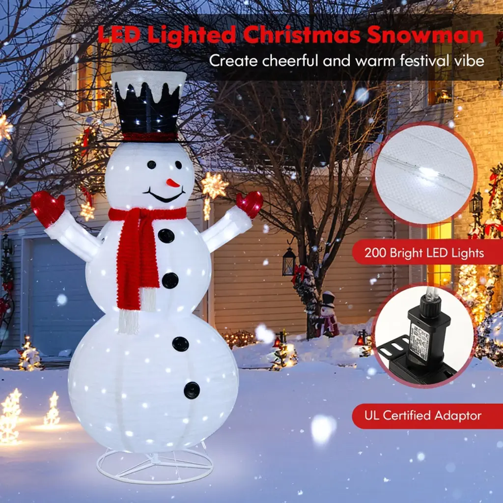 Accompany You & Your Family to Have a Wonderful Christmas! Our 6 ft pop-up lighted Christmas snowman is perfect for winter decoration, Christmas Eve events, and wonderland-themed parties, adding charm and joy to your holiday. It is decorated with a gentleman’s hat, a cute nose, a chic red scarf, red gloves, and black buttons, which add a happy ambiance for your holiday time. Moreover, there exist 200 cool-white LED lights to enhance nighttime visibility while bringing a beautiful festival glow. Thanks to the pop-up design, our artificial Christmas tree is easy to set up, all you need to do is connect the upper rod to the lower rod, then pull up the snowman and hook up the bottom rings and hooks for fixation. Also, it can be folded into a compact size for convenient storage when not in use. Besides, this pre-lit Christmas decoration features IP44 waterproof rating, which can be a perfect addition to any indoor and outdoor area! FeaturesThe lovely snowman with multiple decorations makes it look more vivid and vibrant The bright 200 LED lights emit cool-white lighting, brightening your home or yard All lights are certified by UL588 and the adapter is UL-certified The pop-up Xmas tree is easy and quick to set up and take down, requires no tools Can be folded into a compact size, would not take up much floor space for storage Made of premium plush fabric, providing soft touch while ensuring great durability The metal frame is constructed of sturdy powder-coated steel, not easy to rust Equipped with 4 ground stakes for fixation, ensuring stability and wind resistance With IP44 waterproof rating, suitable for placing indoor and outdoor areasColor: White Material: Plush Fabric, Steel Overall Dimensions: 4.1 x 2.5 x 6 ft (L x W x H) Diameter of the Base: 1.9 ft Number of LED Lights: 200 Voltage: 120 V, 60 Hz Net Weight: 7.5 lbs Package Includes: 1 x Lighted Christmas Snowman 4 x Ground Stake 10 x Zip Tie 1 x User’s Manual