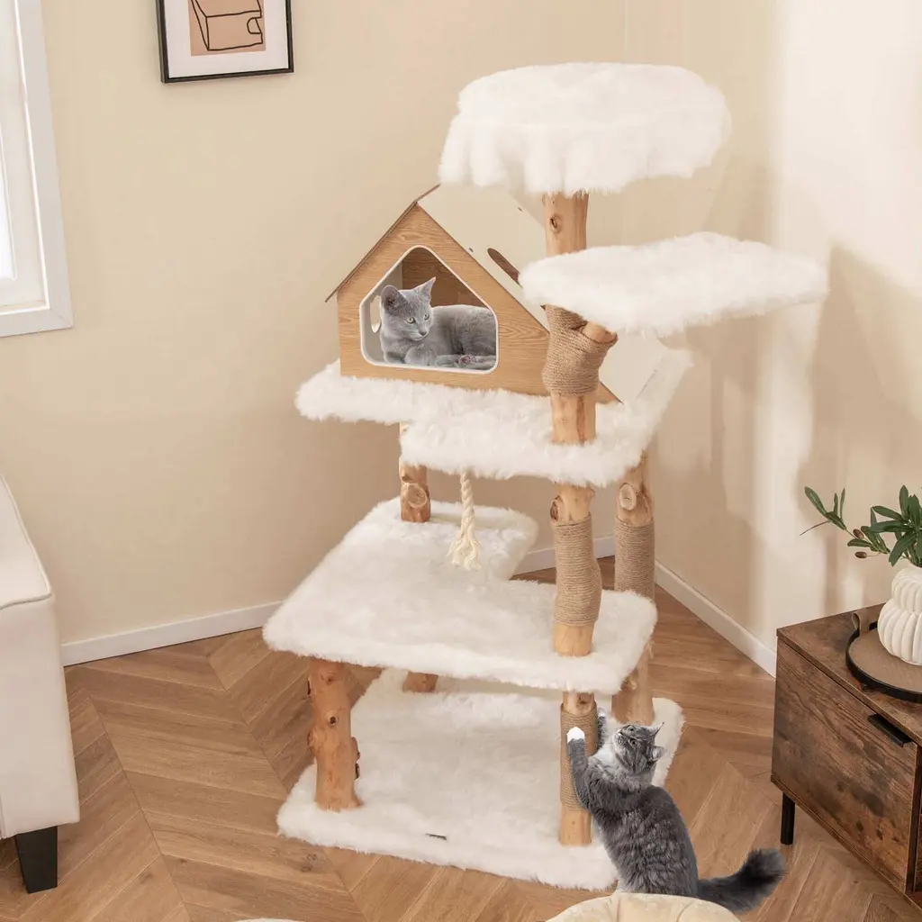 Indulge Your Beloved Feline in the Wonders of Nature! This exquisitely crafted cat tree features natural pear wood trunks that exhibit unique grain patterns, which not only enhance the aesthetic appeal but also ensure a stable and secure structure for your cat to explore and play on. It comes with a house-shaped cat condo for private napping, 2 perches for observing the surroundings, and 2 spacious platforms for stretching out and lounging. For encouraging healthy scratching habits, our cat tree boasts natural jute scratching posts and a hanging sisal rope, which could also keep your cats engaged and entertained. Other than that, each platform is covered with 800 G/M2 high-quality long plush fabric, offering unparalleled softness and comfort for your cat's relaxation. Give your beloved pet the gift of a natural and fun-filled sanctuary with this solid wood cat tree!FeatureEach natural pear wood trunk is unique in shapes and patterns The solid wood trunks provide excellent durability and sturdiness Comes with 2 cozy top perches for cats to relax and overlook Comes with 5 tiers and 2 large platforms, provide multi-layer fun Comes with a large cat condo for your furry friends to hide, play, and sleep The jute scratching posts allow kittens to release the scratching urge The posts are covered by natural jute ropes, safe, reliable, pet-friendly The hanging sisal rope encourages playfulness and exercise Covered with long plush fabric, pamper your cat with its softness and warmth The condo roof features a ventilated design, make the inside breathable and comfy The top perch features a removable cushion, easy to maintainSpecificationColor: Natural+White Material: Long Plush Fabric, Jute, Engineered Board Product Dimensions: 27" x 27" x 60" (L x W x H) Condo Size: 24.5" x 15" x 18.5" (L x W x H) Condo Entrance Size: 10.5" x 9.5"(L x H) Diameter of the Round Top Perch: 16" Rectangular Perch Size: 15.5" x 11.5" (L x W) Weight Capacity of Each Layer: 33 lbs Net Weight: 72.5 lbs Package Includes: 1 x Solid Wood Cat Tree 1 x User’s Manual