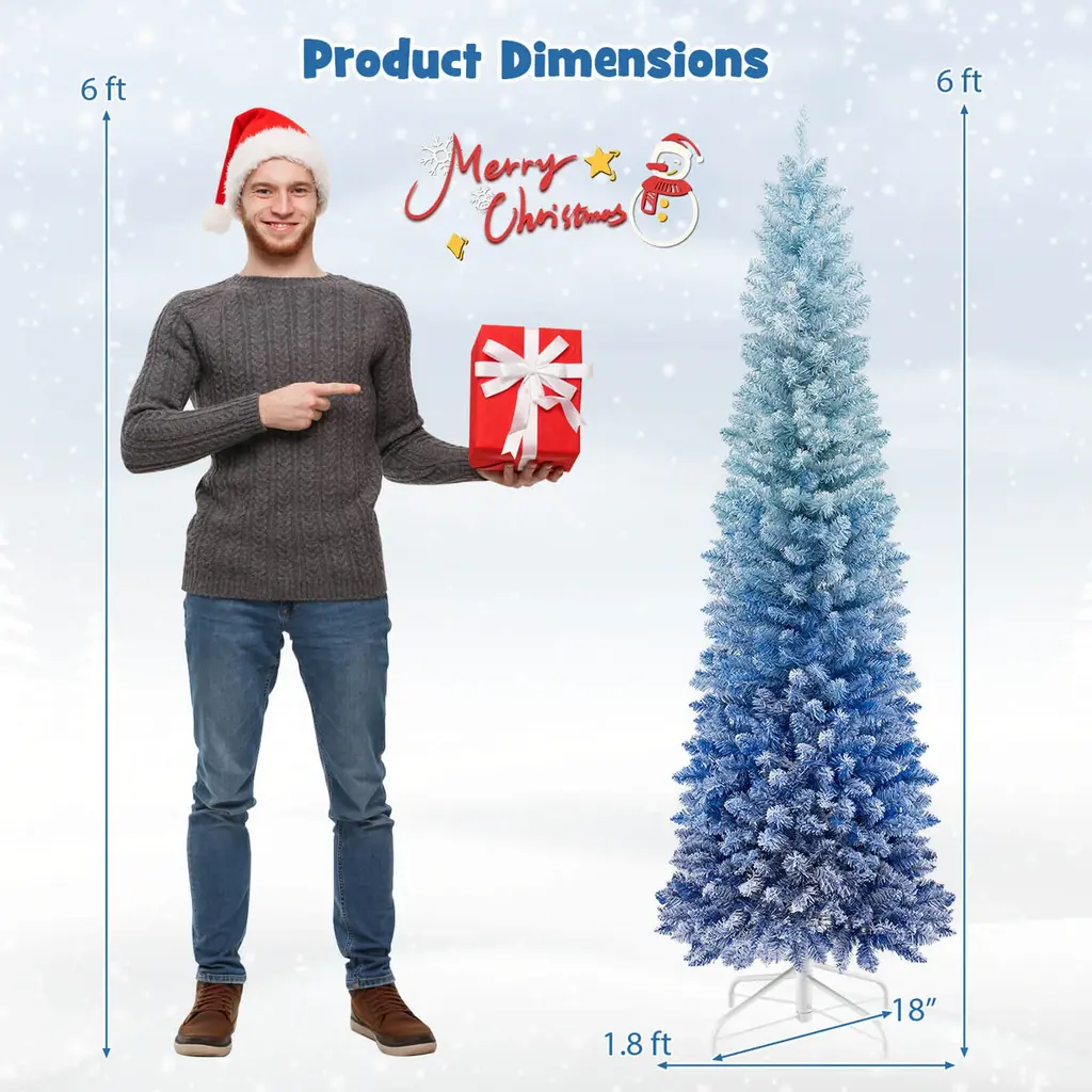 Experience the magic of Christmas with a 6/7 ft Xmas tree. With 435/725 flocked branch tips creating a lush, full-bodied design, this Christmas tree is the perfect backdrop for your holiday decorations. Crafted from 100% new PVC, it is fireproof, non-allergic, anti-fading, and smell-free. Its hinged structure and 3-section design make setup and storage a breeze. Supported by a sturdy metal stand with anti-slip foot pads, this Xmas tree stands tall and secure. Adorned in a stunning gradient blue design, the secure choice brings elegance to any occasion and leaves a lasting impression on guests at the holiday party. Merry Christmas! FeatureFull-bodied design ensures an adorable appearance with bullet-shaped branches Features 435/725 flocked branch tips that are colored in dreamy gradient blue Made of 100% new PVC material that is fireproof, non-allergic, and anti-fading Hinged connection ensures convenient auto expanding of branches Folding metal stand will protect the floor with the anti-slip foot pads Easily divided into 3 sections for space-saving storage Attractive holiday decoration for your home, office, shop, school, and more Please note that ornaments are not includedSpecificationColor: Blue Gradient Material: PVC, Metal Tree Height: 6/7 ft Diameter of the Metal Base: 18/22" Number of Branch Tips: 435/725 Number of Sections: 3 Net Weight: 9/13 lbs Package Includes: 1 x Artificial Christmas Tree 1 x User’s Manual