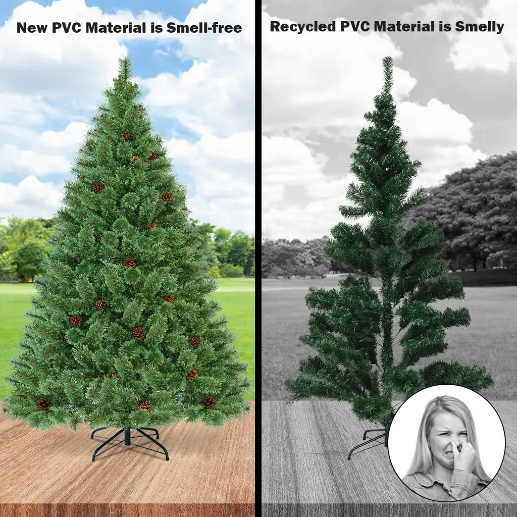 Add a touch of nature to your holiday decor with our 6 ft Pre-Lit PVC Artificial Carolina Pine Tree. Crafted with 484 branch tips and adorned with 49 pine cones, this tree offers a leafy and realistic appearance. The tree comes pre-installed with 260 warm LED lights, saving you the trouble of hanging them up. Made of eco-friendly and non-flammable PVC material, this tree is durable and long-lasting. The hinged construction allows for easy assembly and storage, while the foldable X-shaped iron stand provides stability. Perfect for homes, offices, and shops, this eye-catching tree will add a festive holiday atmosphere to any space.Features:Specification:Package Includes: