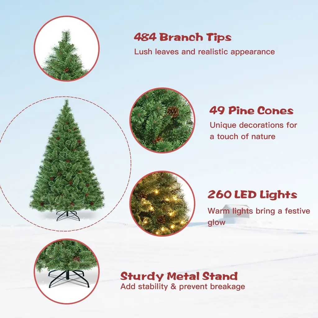 Costway 6Ft Pre-Lit Pvc Artificial Carolina Pine Tree Flocked Cones - 6 Ft - Green - 6 Foot