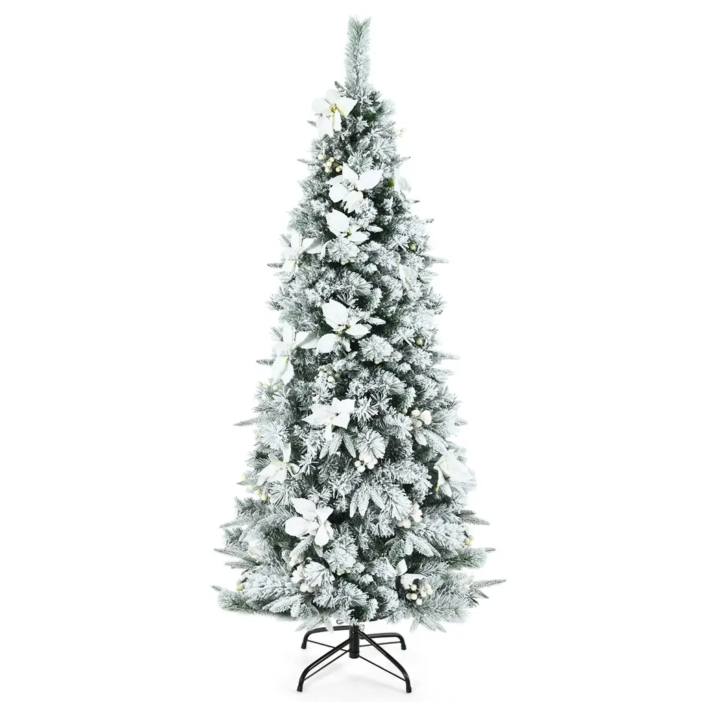 Costway 6Ft Snow Flocked Christmas Pencil Tree W/ Berries & Poinsettia - See Details - White - 6 Foot