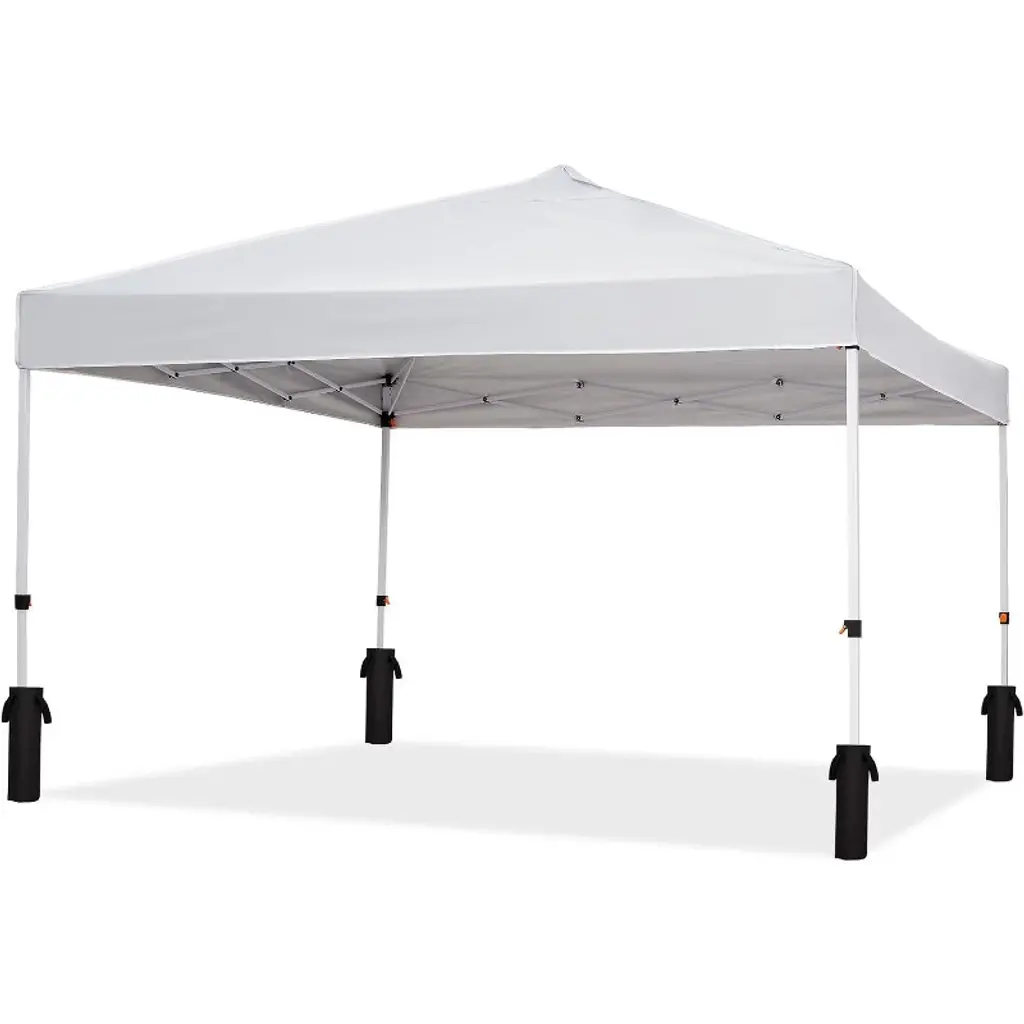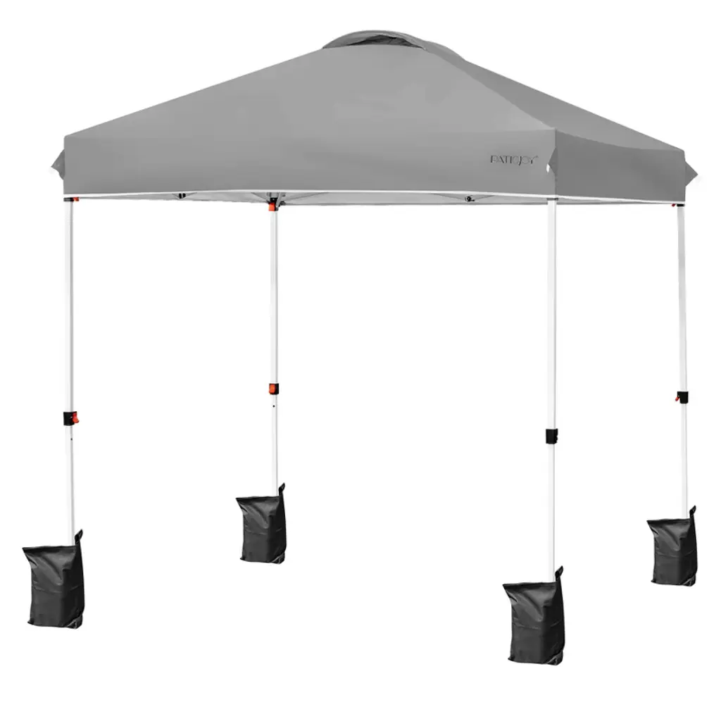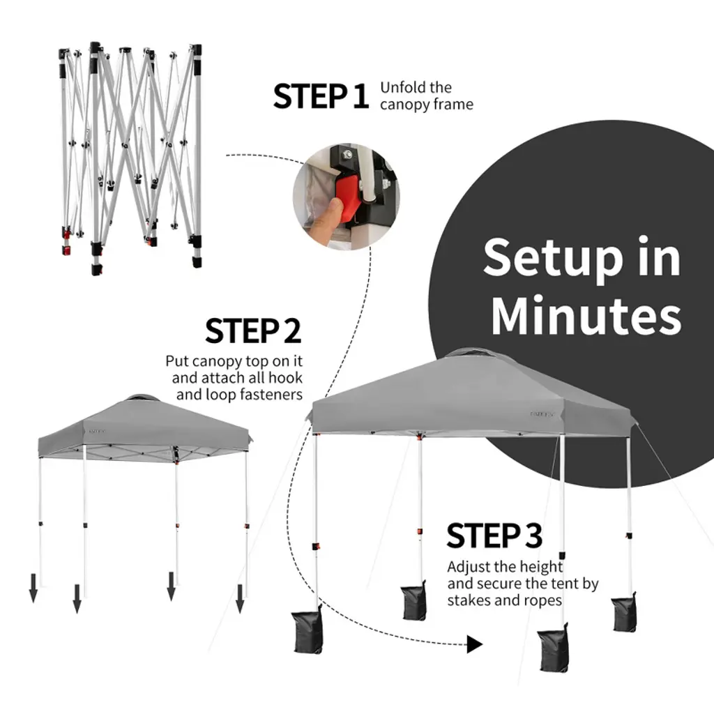 Our 6' x 6' folding canopy tent will be your best choice! The canopy is made of oxford cloth, which can protect you from the sun and rain. The metal frame is sturdy and not easy to rust to withstand long-term use. This folding canopy is suitable for picnics, parties, trade shows and other outdoor activities. It's worth mentioning that this canopy has 3-level height adjustment to satisfy various requirements. Equipped with a storage bag, this folding canopy can be carried to the beach, park, tailgate, etc. Features6x6 FT create large shade outside 8 ground stakes, 4 tie-down ropes and 4 weight bags for further strengthen its stability Very effective in blocking out sunlight or rain Fully assembled canopy frame is convenient to use Height can be adjusted between 90.5’’ and 98.5'' Oxford cloth is wear-resistant and fade-resistant to support long time use Coated with PU to ensure its excellent rainproof performance Frame of canopy is preassembled by factory Portable bag also included in the packageMaterial: Oxford cloth, Iron, Plastic Color: Blue/Gray/White/Pink Overall Dimensions: 79'' x 79'' x 90.5''-94.5''-98.5'' (L X W X H) Net Weight: 26.5lbs Package includes: 1 x Canopy 8 x Ground Stakes 4 x Ropes 4 x Weight Bags 1 x Roller Bag 1 x User’s Manual