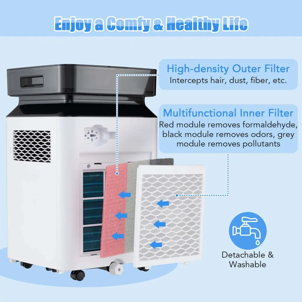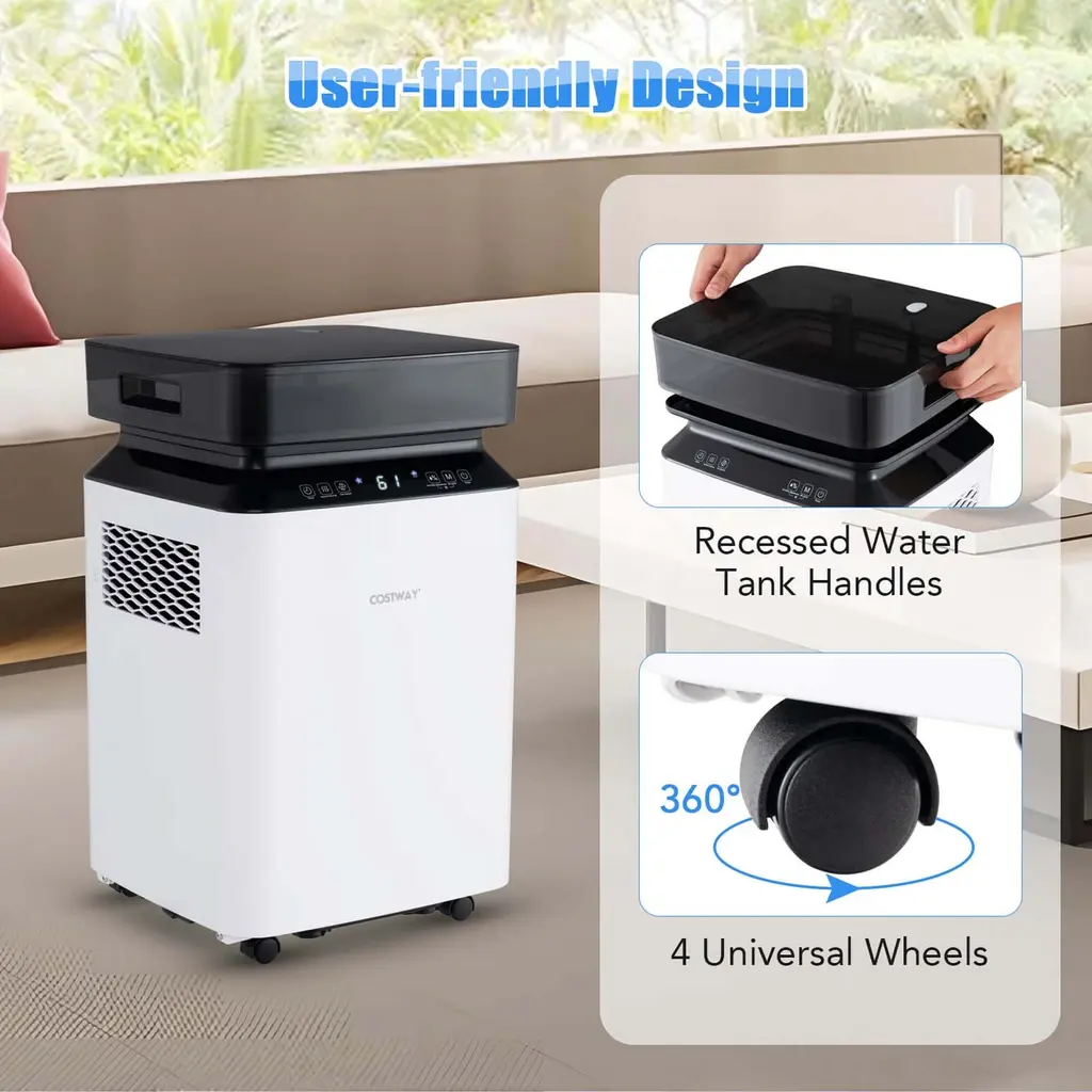 Enjoy a comfy & healthy life with this 70 pint dehumidifier! Capable of removing up to 70 pints of excess water per day, this dehumidifier is an ideal solution for maintaining optimal humidity levels in large spaces up to 4500 sq.ft. It is equipped with continuous mode and auto mode for versatile humidity control. And the humidity setting ranges from 30%- 80%. The 2.2-gallon water tank minimizes the frequency of tank emptying, while the 3 drainage options with 2 included drain hoses offer great flexibility. Air quality is significantly enhanced through the 2-stage filtration system. Moreover, the intelligent touch panel with LED display allows you to easily set the mode, 0-24h timer, high/low fan speed, humidity adjustment, power and so on. FeatureEfficient dehumidification with an adjustable humidity range of 30% - 80% 3 drainage options: manual drainage, gravity drainage and pump drainage Continuous/auto mode allows for precise control over indoor humidity 24-hour timer for added convenience and energy saving Touch panel with LED display allows for simple operation Auto defrost and internal drying function for prolonged performance Suitable for home, bedroom, basement, bathroom or garage 2-stage filtration system improves indoor air quality Detachable and washable filters for easy maintenance Overflow protection and child lock enhance safety Enduring ABS material ensures a long service life 4 universal wheels make it easy to move aroundSpecificationColor: White Material: ABS Product Dimensions: 13" x 12" x 21.5" (L x W x H) Voltage: 115V Frequency: 60Hz Power: 290 W Total Input Current: 3.8 A Dehumidify Capacity: 24 Pints/Day (65℉, 60% RH) 30 Pints/Day (86℉, 80% RH) 70 Pints/Day (95℉, 90% RH) Water Tank Capacity: 2.2 Gallon Humidity Setting Range: 30% - 80% Coverage Area: 4500 sq.ft Drain Hose Length: 2 ft, 6.5 ft Power Cord Length: 6 ft Noise Level: ≤41 dB Net Weight: 32 lbs Package Includes: 1 x Dehumidifier 2 x Drain Hose 1 x Instruction