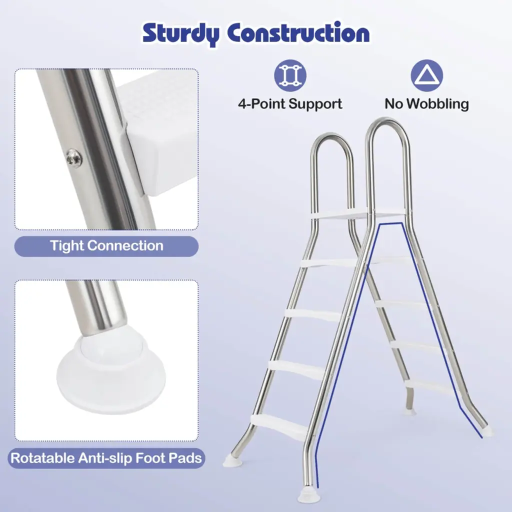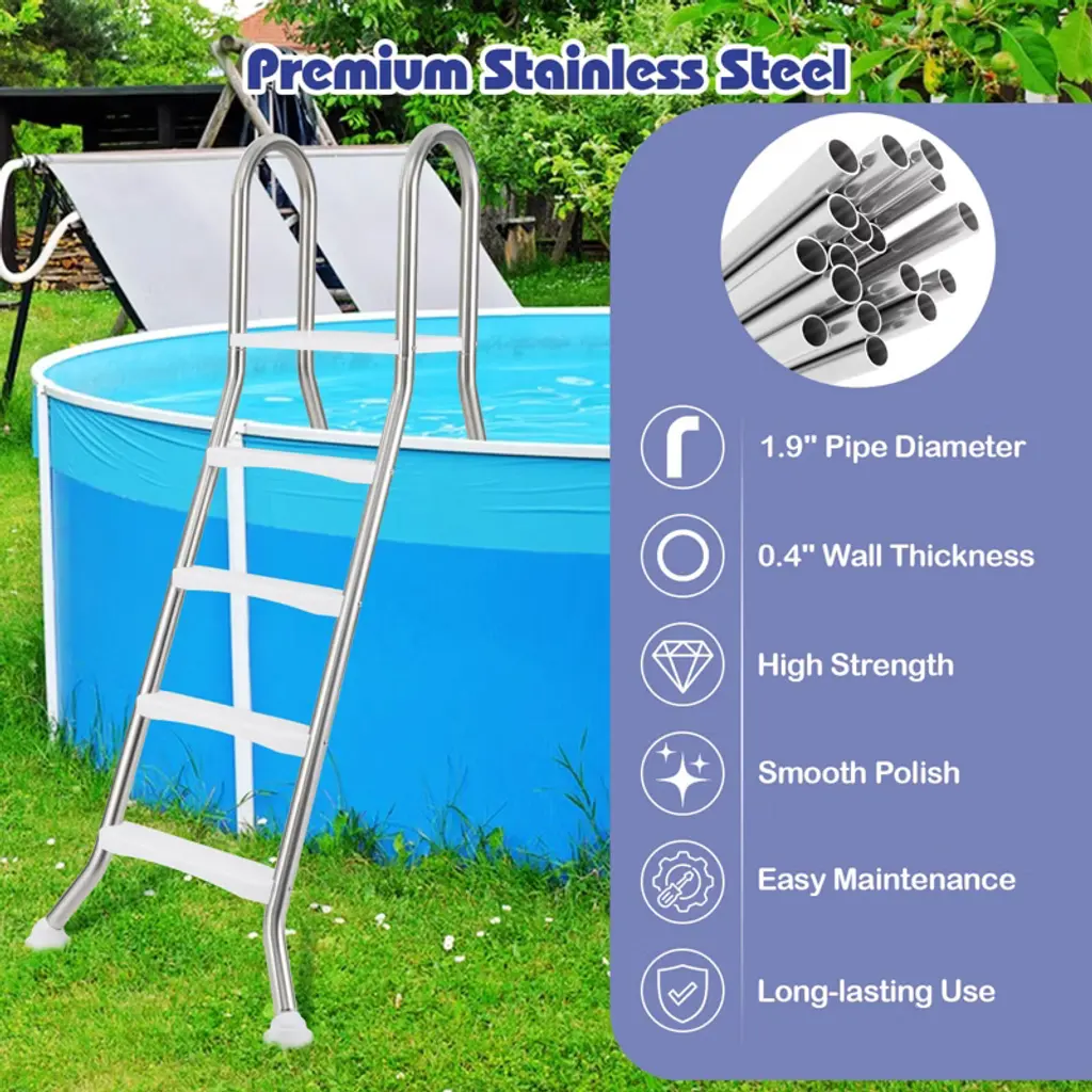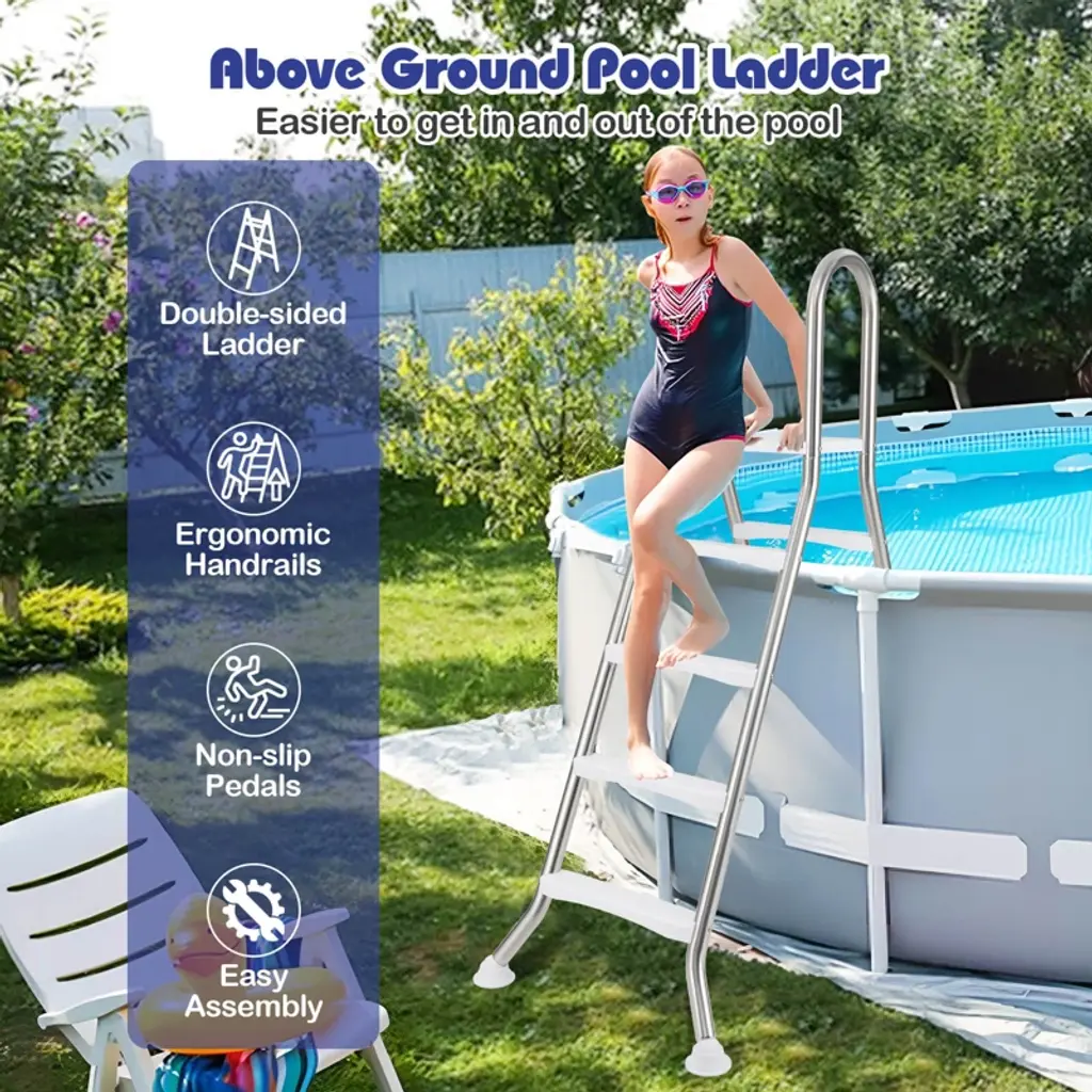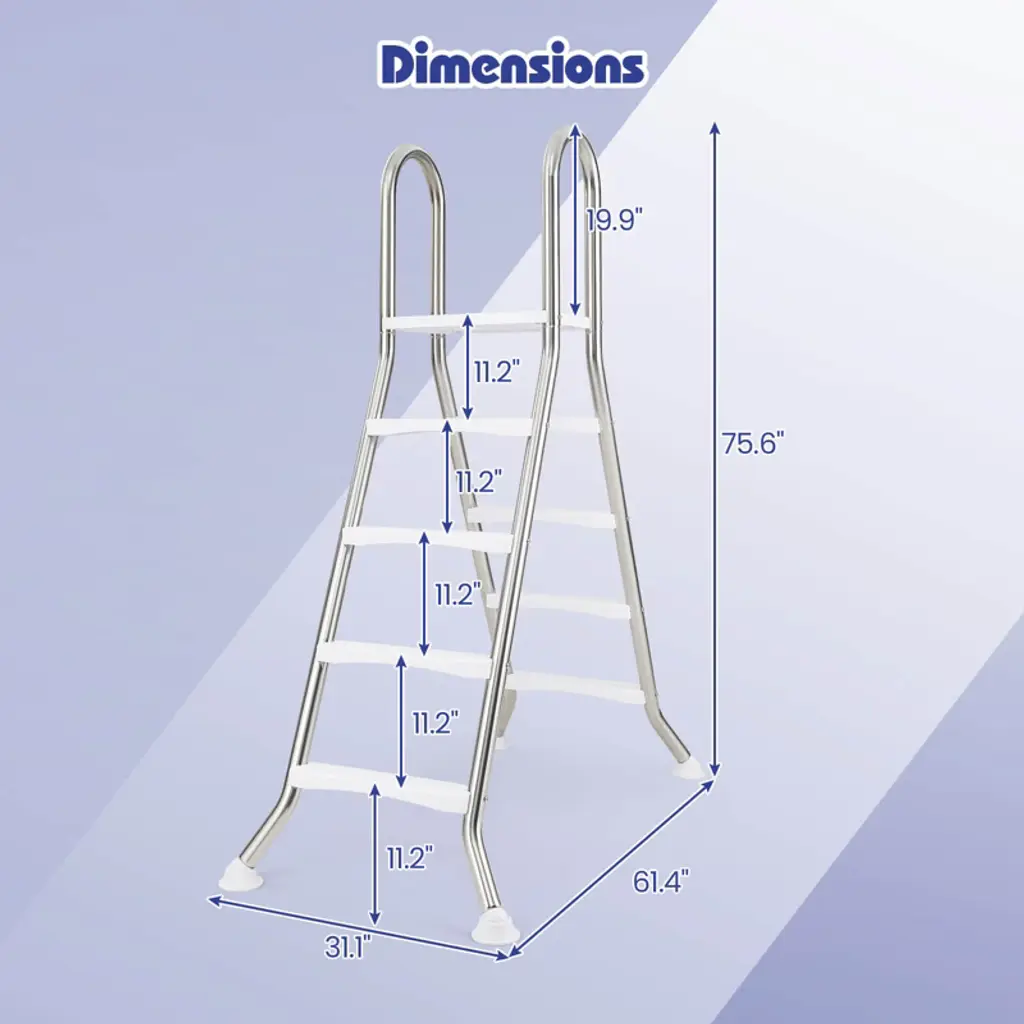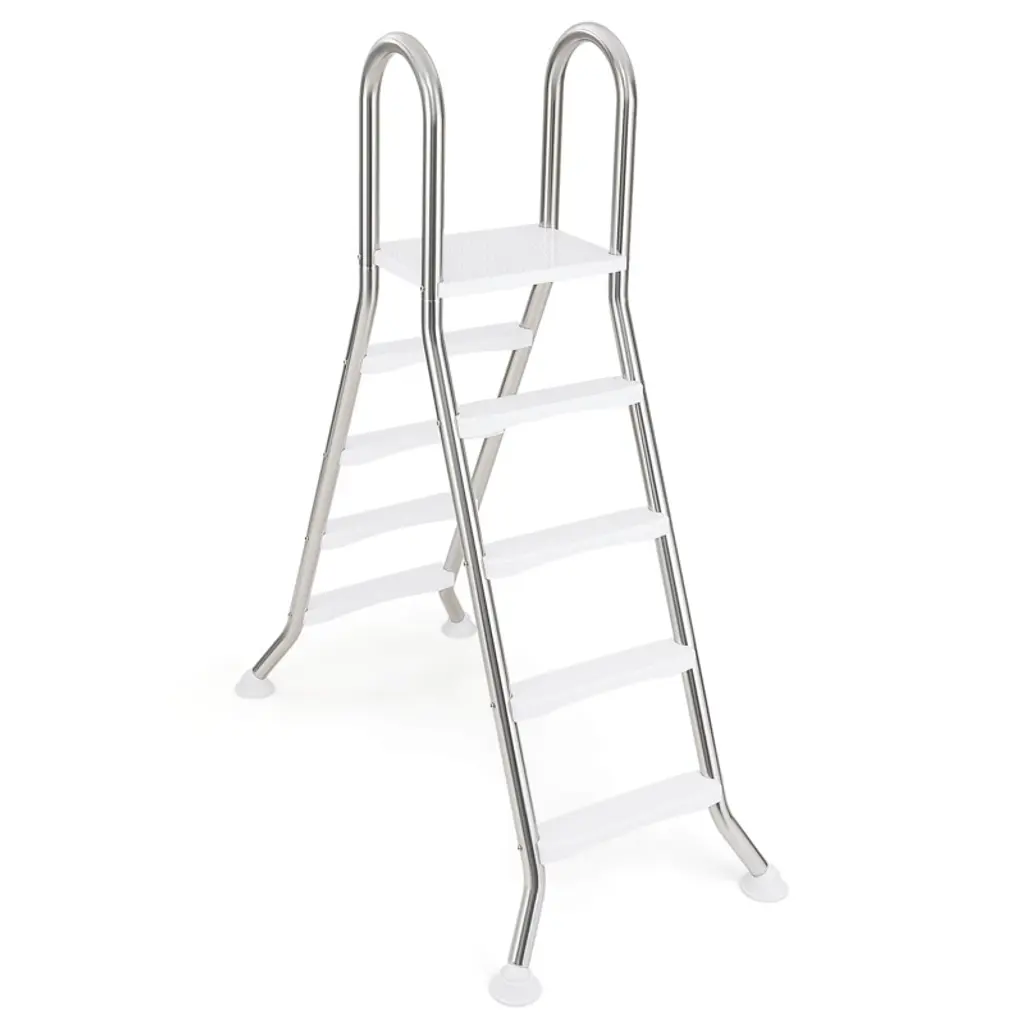 Step into your pool with ease and confidence with this above ground pool ladder. This A-Frame ladder is designed to accommodate above ground pools with wall heights of up to 55". Made from high-quality stainless steel tubes, it is built to withstand the rigors of frequent pool use. Featuring a large top platform and widened & non-slip pedals, this pool ladder allows you to enter or exit from the water securely. Besides, the ergonomic handrails offer additional security, providing a reliable grip that helps maintain balance. FeaturesHeavy-duty stainless steel construction for long-term use Fit above ground pools with wall height up to 140 cm/55" Non-slip steps and rounded handrails for added safety Wide top platform provides a temporary rest area No wobbling thanks to the stable A-frame design Smooth polished surface for easy maintenance Rotatable anti-slip foot pads enhance stability Easy to assemble with clear instructionsColor: Sliver Material: Stainless Steel, ABS, PVC Product Dimensions: 61.4" x 31.1" x 75.6" (L x W x H) Pedal Dimensions: 17.7" x 3.74" (L x W) Platform Dimensions: 19.5" x 14.8" (L x W) Height between Steps: 11.2" Pipe Diameter: 1.9" Wall Thickness: 0.4" Net Weight: 36.5 lbs Weight Capacity: 265 lbs Package Includes: 1 x Swimming Pool Ladder 1 x Instruction