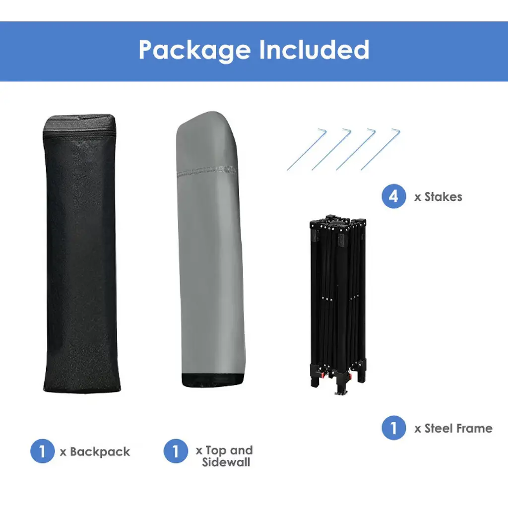 Are you finding a foldable canopy to provide shelter for some outdoor activities? Our folding tent which can be conveniently stored in a portable bag to carry and perfect for many outdoor activities like parties, camping, flea markets etc. Constructed of powder-coated solid steel, the frame of the tent is rust-resistant and can provide long time service. And the stakes which come with tent can also add stability of tent. Whether the weather is rain or shine, this outdoor shelter is sure to make your outdoor gathering pleasant. Under the canopy, there is enough space for you to place furniture like deck chair, table and loveseat to enjoy leisure time with your family or friends.FeaturesMaterial: Steel, Fabric Color: White/Grey/Blue Overall Dimension: 7'L x 7'W x 7'H Weight of Canopy: 17 lbs Package include: 1 x Folding Canopy 1 x Backpack 4 x Stakes 1 x Instructions