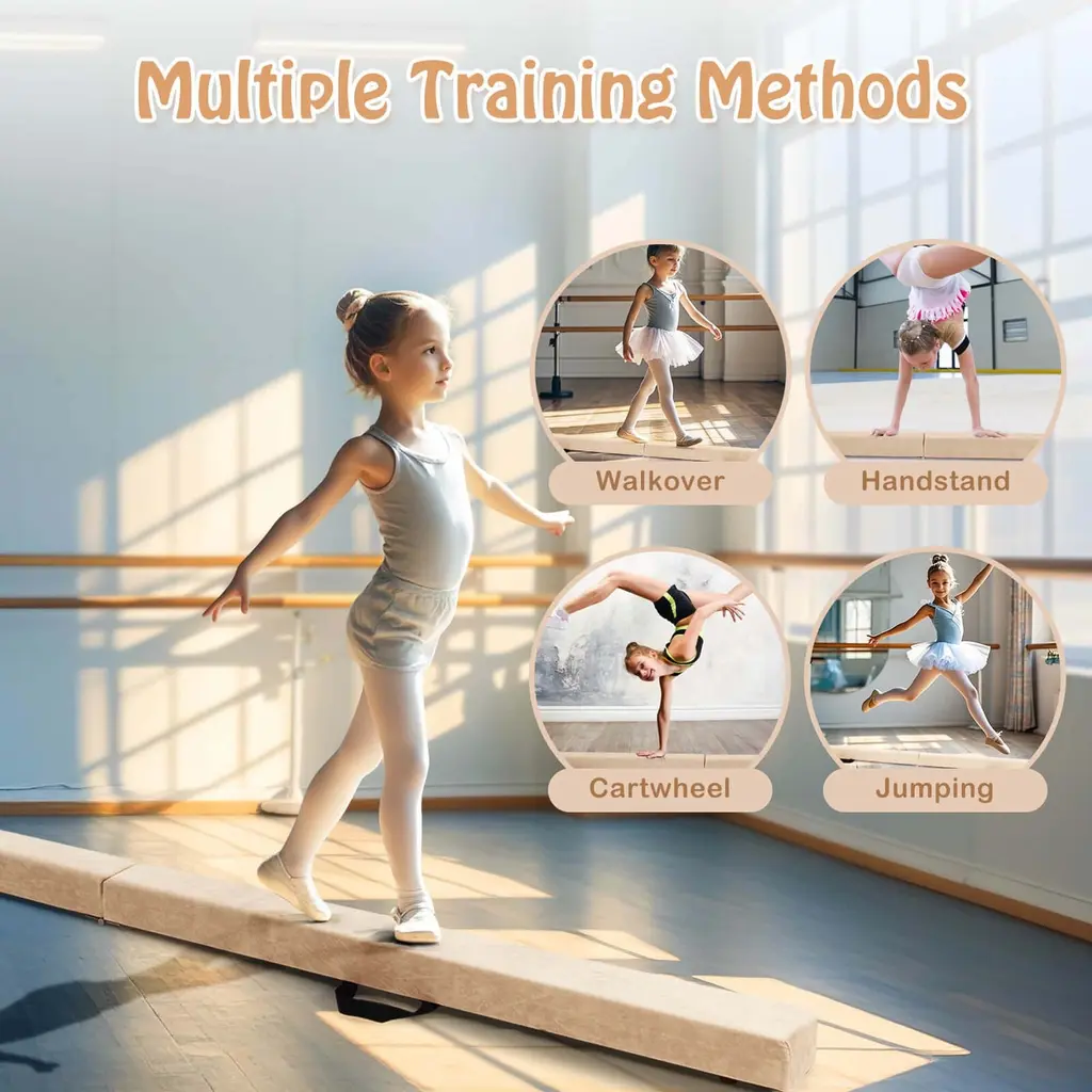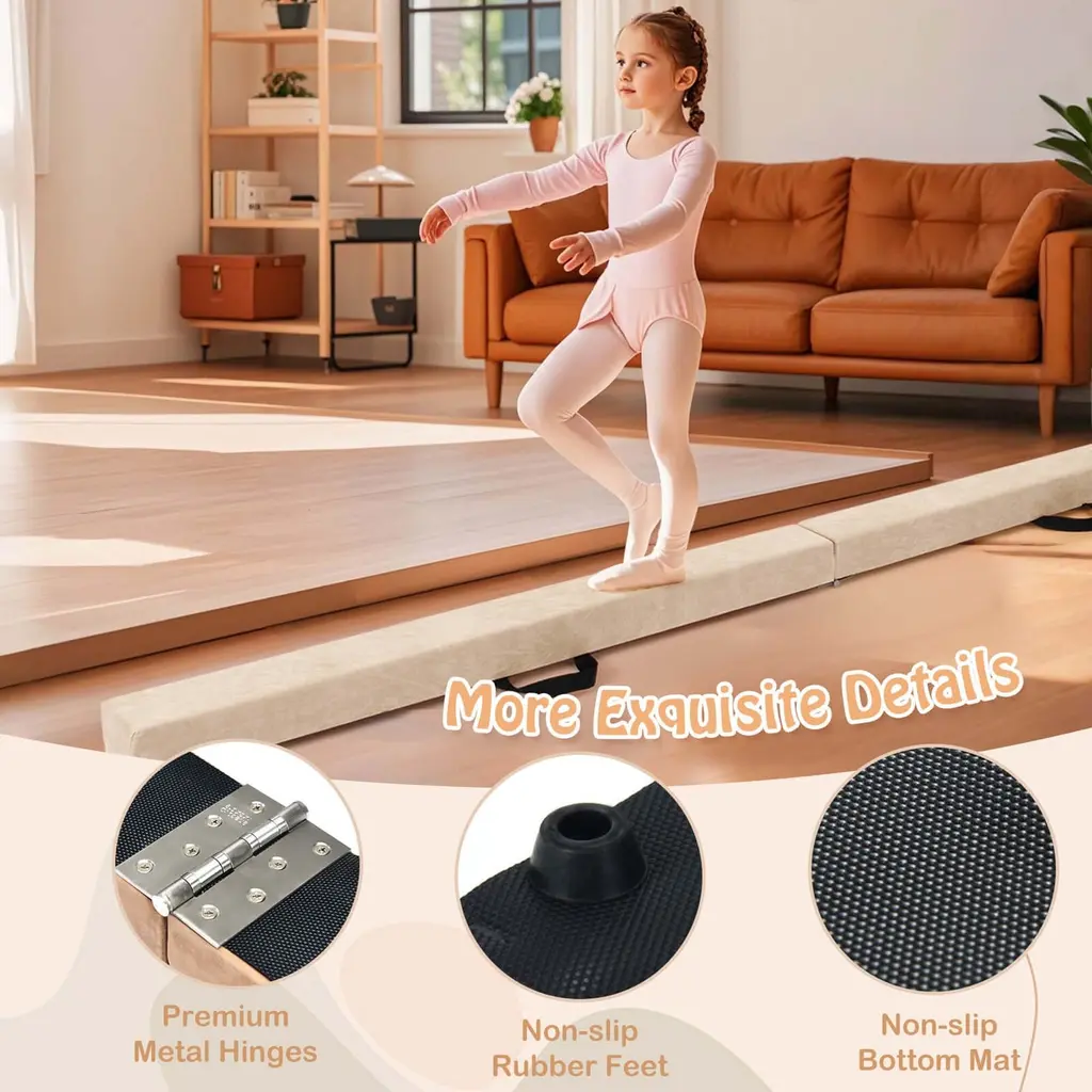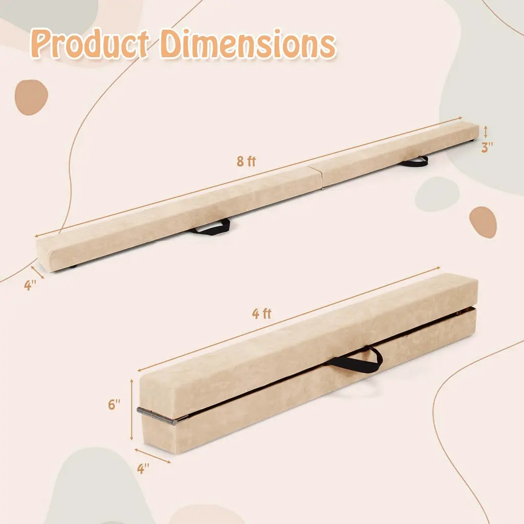Are you looking for a comfortable and safe balance beam? Look no further! Our balance beam is padded with high-density EPE foam for cushioning, while the non-slip bottom mat guarantees stable usage. Besides, equipped with a stable and sturdy natural pine wood base, this beam bar can support up to 220 lbs, providing a secure platform for kids to enjoy their gymnastics activities without worry. This gymnastics equipment is easy to store and transport. Fold it into a compact size and carry it with the convenient handle provided. Its versatility allows for various training methods like balance training, gymnastics, cartwheels, and jumping practice, enhancing your child's skills. FeatureHigh-density EPE foam padding for super comfort cushioning Non-slip bottom mat for stability and safety Sturdy natural pine wood base ensures overall stability Accommodate up to 220 lbs weight capacity for reliable support Enhance balance skills through versatile training options and gymnastics Portable and foldable design for easy storage and carrying Non-slip rubber feet for added safety Stylish mix-color design for a visually appealing look SpecificationColor: Blue/Beige/Pink/Dark Purple/Purple/Multicolor Material: Suede, EPE Foam, Pine Wood, PVC Overall Dimensions: 8 ft x 4" x 3" (L x W x H) Folding Dimensions: 4 ft x 4" x 6" (L x W x H) Net Weight: 10 lbs Weight Capacity: 160 lbs Suitable Age: 3-10 Years Old Package Includes: 1 x Folding Balance Beam 1 x User Manual