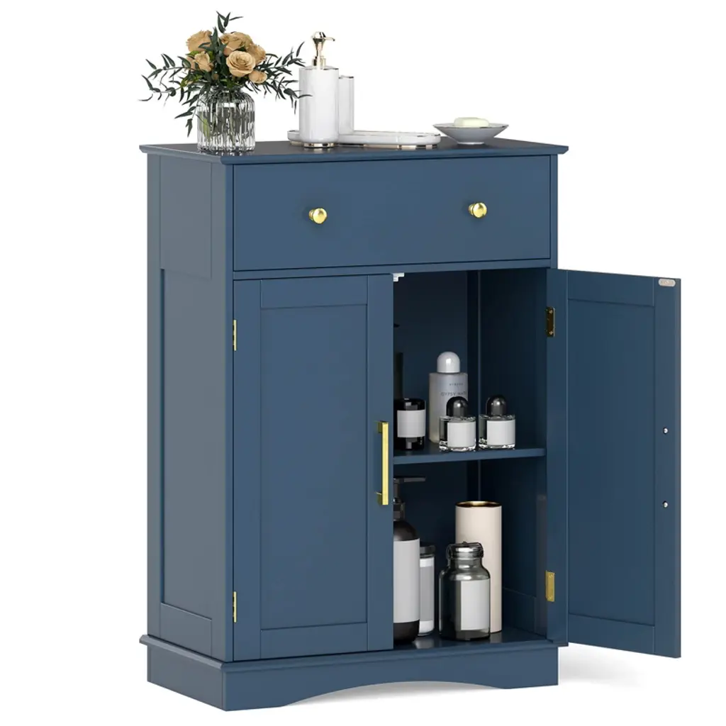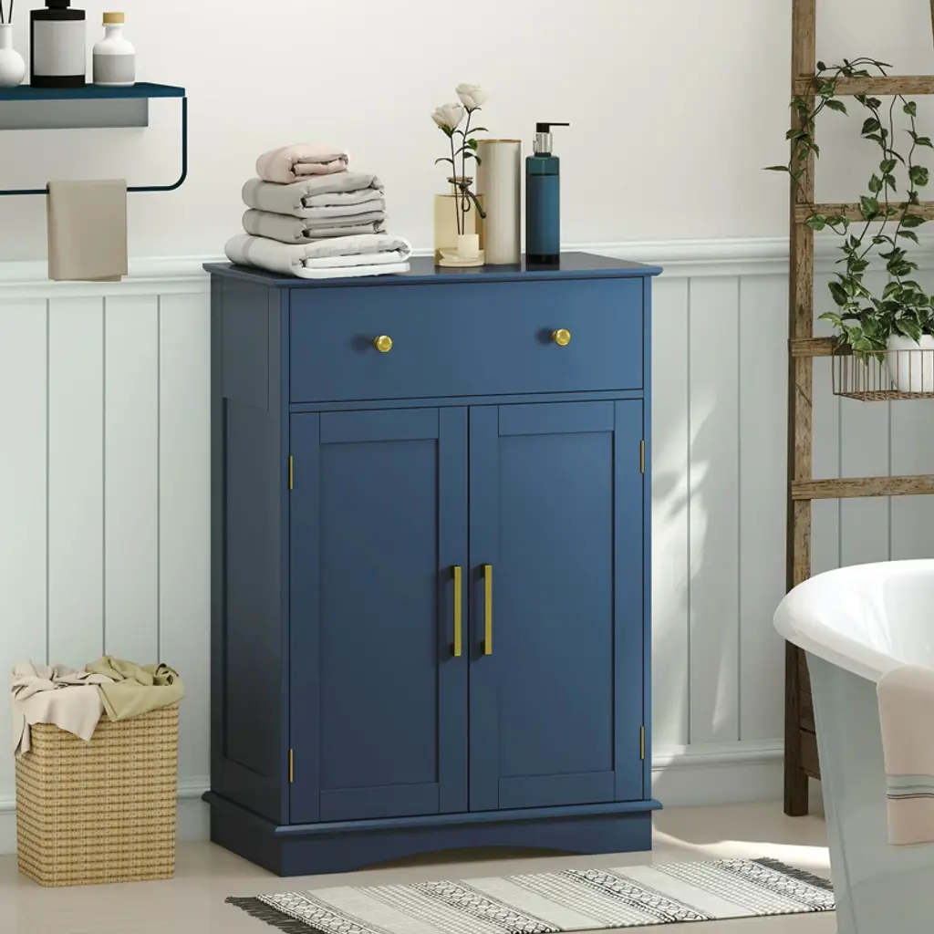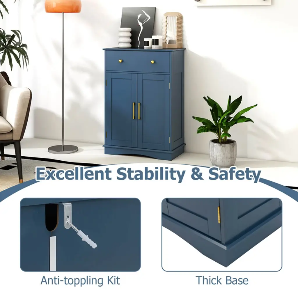 Elevate your home's style and functionality with the bathroom floor cabinet. It has ample storage options, including a pull-out drawer and 2-door cabinet with a 3-level adjustable shelf. Moreover, with the robust construction supported by an anti-toppling kit, you can enjoy peace of mind knowing things are secure. Plus, the thoughtful inclusion of user-friendly components like round knobs, smooth slide rails, and a magnetic catch ensures that accessibility and safety are never compromised. Whether you're looking to declutter your kitchen, organize your dining room, or add stylish storage to your living room, the freestanding storage cabinet is a perfect choice.FeaturesSpacious top, large drawer and cabinet keep various items well-organized Customizable storage with adjustable shelf Anti-toppling kit included for added safety Easy access via smooth slide tracks Secure closure with magnetic door catch Elegant round knobs for a subtle style accent Wooden construction for long-lasting use Fits various decorations with contemporary design Suitable as buffet, sideboard, or cupboard Ideal for kitchens, living rooms, dining areas, and entryways Assembly neededColor: Navy Blue Material: MDF + Engineered Wood Overall Dimension: 22" x 12" x 31.5" (L x W x H) Drawer Inner Dimension: 18.5" x 9.5" x 4" (L x W x H) Total Weight Capacity: 155 lbs Net Weight: 28 lbs Package includes: 1 x Floor Cabinet 1 x User Guide