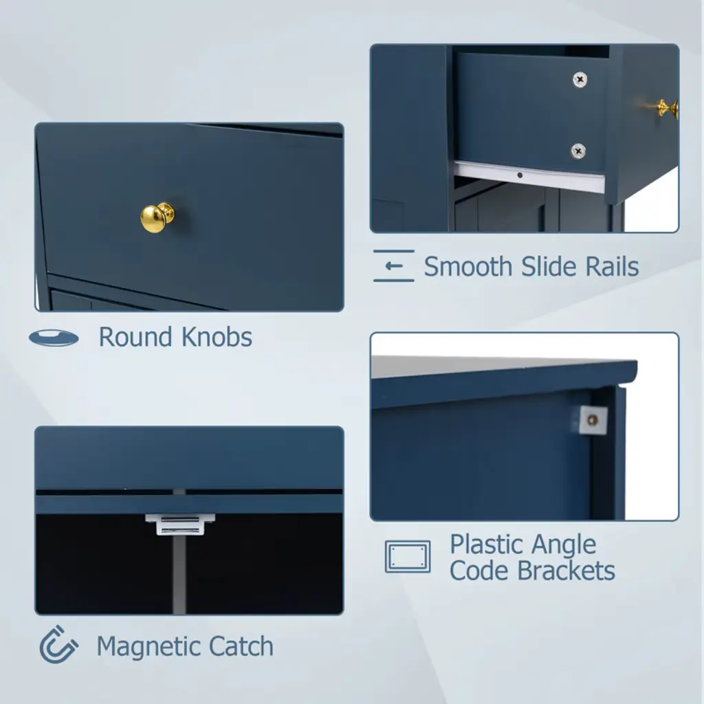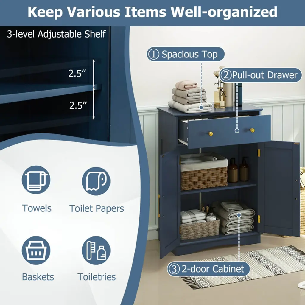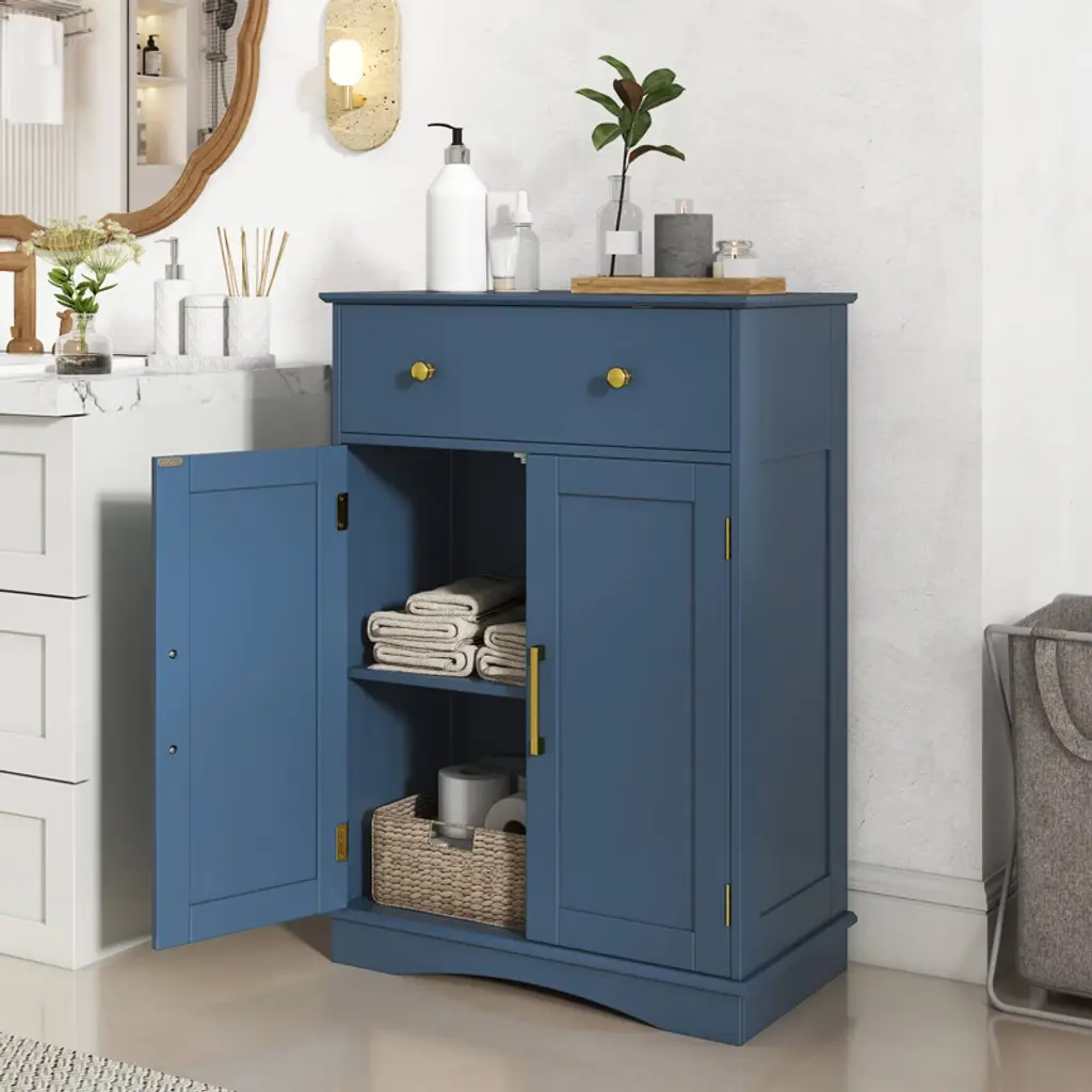 Elevate your home's style and functionality with the bathroom floor cabinet. It has ample storage options, including a pull-out drawer and 2-door cabinet with a 3-level adjustable shelf. Moreover, with the robust construction supported by an anti-toppling kit, you can enjoy peace of mind knowing things are secure. Plus, the thoughtful inclusion of user-friendly components like round knobs, smooth slide rails, and a magnetic catch ensures that accessibility and safety are never compromised. Whether you're looking to declutter your kitchen, organize your dining room, or add stylish storage to your living room, the freestanding storage cabinet is a perfect choice.FeaturesSpacious top, large drawer and cabinet keep various items well-organized Customizable storage with adjustable shelf Anti-toppling kit included for added safety Easy access via smooth slide tracks Secure closure with magnetic door catch Elegant round knobs for a subtle style accent Wooden construction for long-lasting use Fits various decorations with contemporary design Suitable as buffet, sideboard, or cupboard Ideal for kitchens, living rooms, dining areas, and entryways Assembly neededColor: Navy Blue Material: MDF + Engineered Wood Overall Dimension: 22" x 12" x 31.5" (L x W x H) Drawer Inner Dimension: 18.5" x 9.5" x 4" (L x W x H) Total Weight Capacity: 155 lbs Net Weight: 28 lbs Package includes: 1 x Floor Cabinet 1 x User Guide