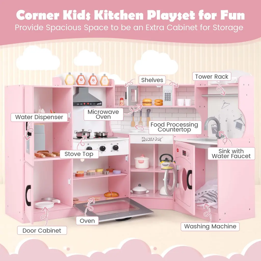 Allow your child to enjoy the fun of cooking with our wooden corner play kitchen! Designed with multiple simulated areas, kids can enjoy hours of fun role-playing. The ice maker works and here are the operation steps: ① Put in the ice cubes. ② Press to get ice cubes. ③ Enjoy it. Besides, the 180° rotatable faucet can be turned on/off with a switch. There is sweet cookware included and they are the chef hat, apron, cup & ice cubes, pot, pan, plates, spoon, spatula, knife and cruets. With top shelves, hanging hooks, towel rack and 4 open compartments, all the accessories can be stored, which helps kids to develop a good organizing habit. More importantly, the unique corner design makes full use of the corner space, making this wooden kids kitchen an ideal addition to families with children.FeatureMultiple kitchen features for a more realistic cooking experience Classified storage space holds the equipped accessories and other items Larger playing space allows up to 4 kids to play at the same time Extra hanging hooks and towel rack for more storage options A variety of cookware included for convenient use Wide and stable base contributes to overall stability Magnetic door catches keep the doors closed firmly Convenient handles for easy opening or closing Space-saving corner design suits any corner space A perfect gift for kids to improve their hands-on abilitySpecificationColor: White/Pink Materials: Density Board, Beech Wood, Plastic, Polyester Dimension of Each Part: 11"/12.5"/15.5"/16.5" x 11.5" x 37"(W x D x H) Counter Height: 18.5"/20" Net Weight: 66 lbs Suitable Ages: 3-10 Years Old Package Includes: 1 x Corner Play Kitchen 1 x Chef Hat 1 x Apron 1 x Pot 1 x Pan 1 x Spoon 1 x Spatula 1 x Knife 1 x Cup 2 x Ice Cubes 2 x Plates 2 x Cruets 1 x Instruction
