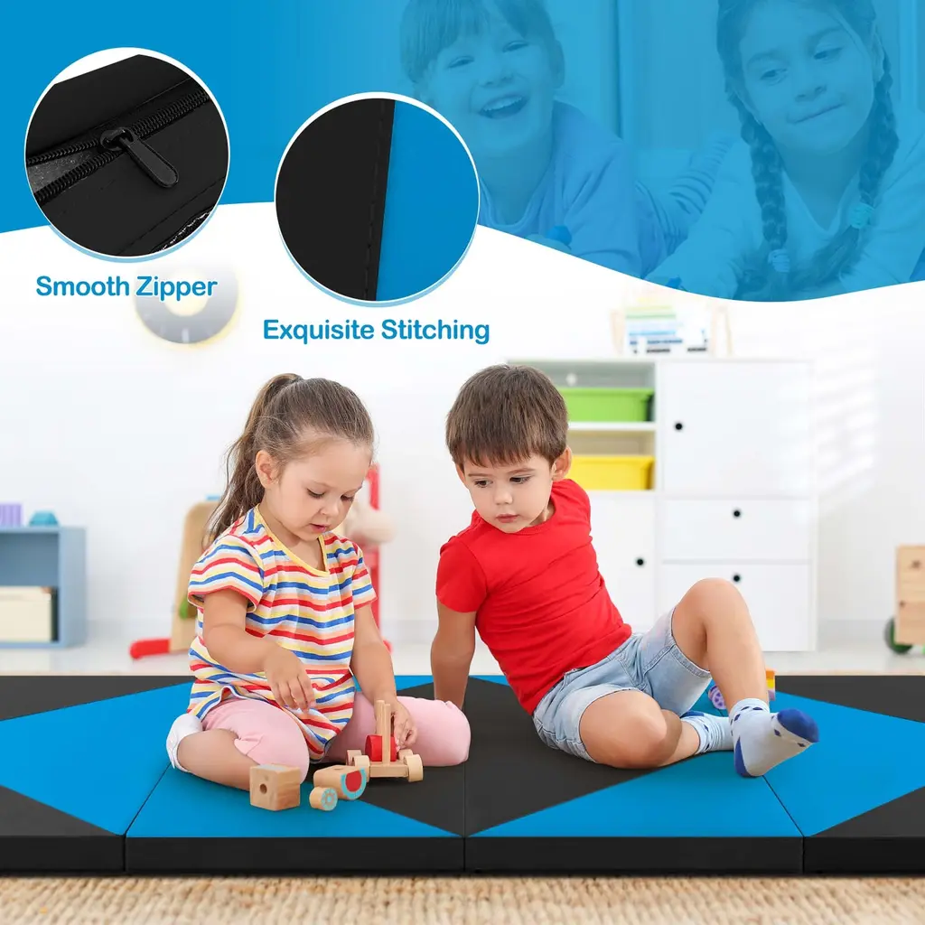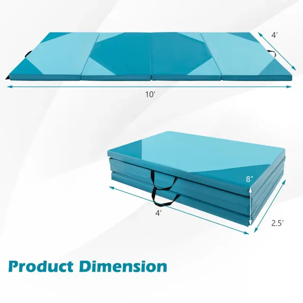 Our exercise mat consists of premium PU leather cover and high density EPE foam padding, which brings comprehensive protection to the whole body, including wrists, back, elbows, knees and more. The waterproof PU leather is quick to clean, and the zippered design allows for easy detachment for deep cleaning. For convenient storage and transport, this foldable mat is equipped with carry handles. This four-fold exercise mat is suitable for wide applications, such as yoga, gymnastics, aerobics and kids playing.FeaturePadded with high density and comfortable EPE foam Protects your body and gives ample support Available to connect more mats together with hook and loop fasteners Covered with soft and tear resistant PU leather cover Effortless to wipe down thanks to a waterproof surface Removable cover with smooth zipper Foldable and portable with carry handles Suitable for fitness, stretching, cheerleading and kids playingSpecificationColor: Light Pink+Black/Blue+Black/Pink+Purple/Pink+Black/Pink+Blue/Pink Material: PU + EPE Foam Unfolded Dimension: 8' x 4' x 2'' (L x W x H) Folded Dimension: 4' x 2' x 8'' (L x W x H) Net Weight: 11 lbs Package Includes: 1 x Folding Gymnastics Mat