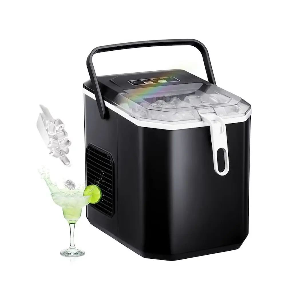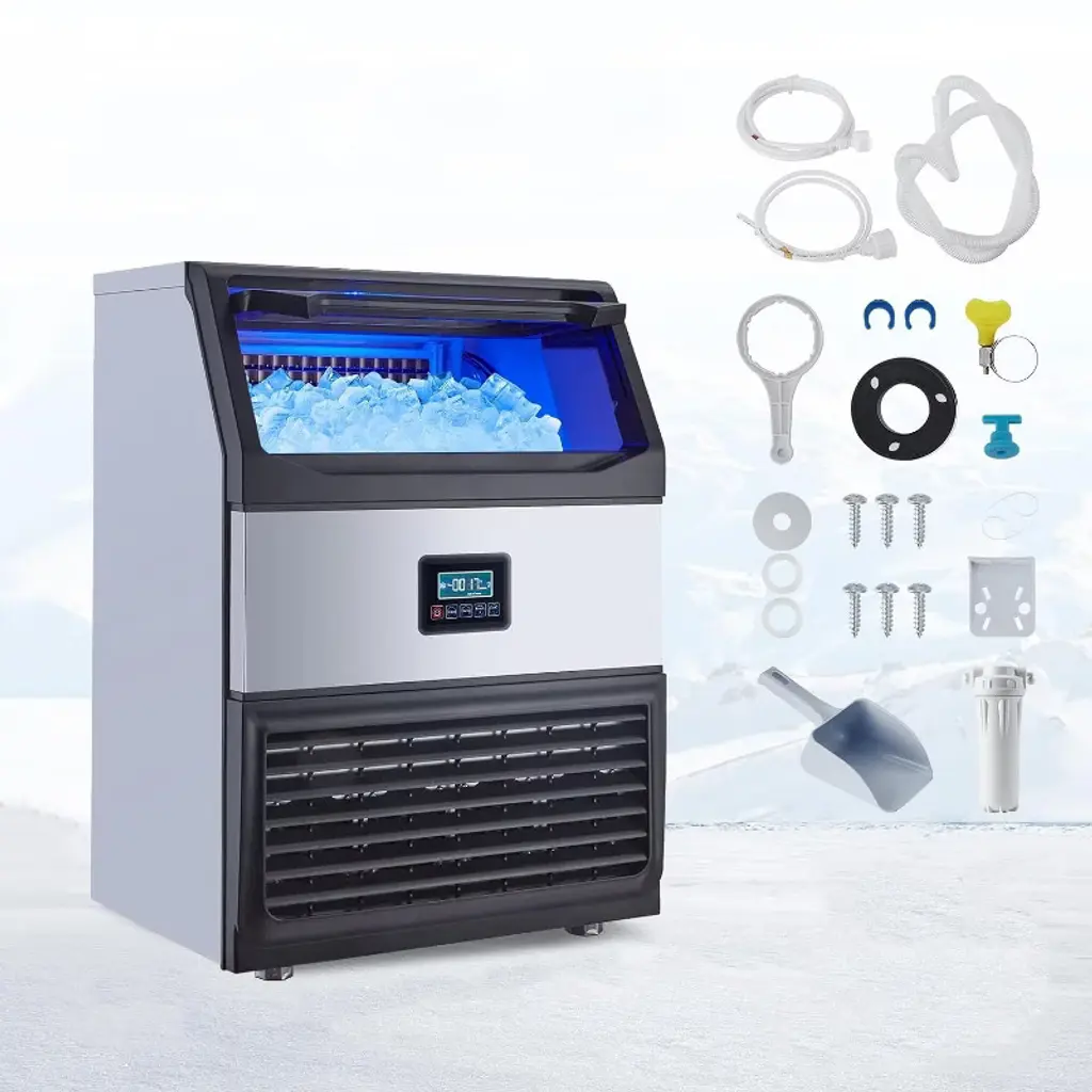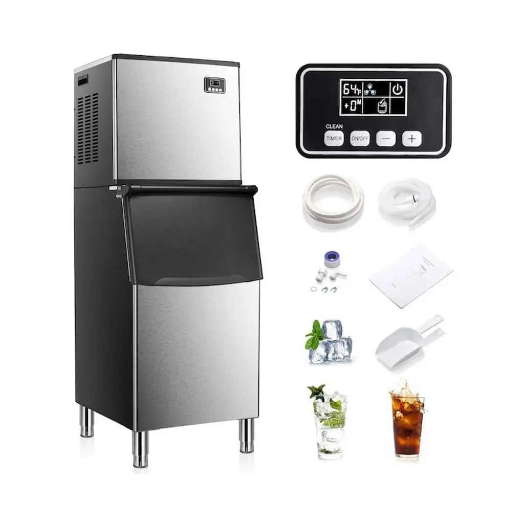 Get your ice ready every day with our freestanding lab ice maker! Our ice make fits under the standard kitchen countertop or stands on your game room, den, basement, bar, garage for a space-saving solution. The stylish appearance can be changed with a reversible door to open in the left or right direction. You can fetch your ice cube after 11-20mins and will have 80 lbs of ice produced every day. The extra ice will be stored in the removable ice bin and preserved for the next 6 hours at room temp of 68 °F thanks to a 3-layer cold insulation shell. It is easy to clean and use with self-clean & deicing, 24 h timer, hand-free water inlet system, no-water & ice-full reminders, ice thickness set-up, an LED light, and can switch between 2 temp units. To enjoy the ice at its freshest, please use up ice in the basket or put it in the fridge to avoid melting around.FeaturesSquare drop/cut ice sheet, crystal-clear, slow-melting, taste-free Adjustable legs for keeping balance, LCD display for better informing, LED light Side spoon slots for neat storage, removable ice bin for storing ice cube Freestanding & Under-counter ice maker as a space-saving solution Stylish appearance with a reversible stainless steel door for practical use Features self-clean and self-deicing functions, 24h timer, short-water & ice full indicators 11-20mins ice-making circle, 12 ice thicknesses, 3.2L water tank, 80 lbs daily yield Includes ice spoon, water inlet & outlet hose, quick faucet connector Cold insulation for 6 hours with 3-layer shell, safe to use with auto-stop Fahrenheit (°F) to Celsius (°c) switch for a user-friendly experienceColor: Stainless Steel Door +Black Cabinet Material: Stainless Steel, PP, Zinc-Plate Sheet, ABS Product Dimension: 15 x 20.3 x 33.5 inch (L x W x H) Ice Bin Dimension: 12 x 12 x 13.5 inch (L x W x H) Power: 115V 60 Hz Ice Making Capacity (24H): 80 LBS Max Ice Storage Capacity: 24 LBS Timer: 24 H Power Cord: 71.5'' Water Inlet Hose: 10 FT Water Outlet Hose: 6.5 FT Net Weight: 62 LBS Package Included: 1 x Freestanding Ice Maker 1 x Water outlet hose 1 x Ice scoop 1 x Handle 1 x Water quick-connector 1 x Water inlet hose 1 x Removable ice bin 1 x Instruction