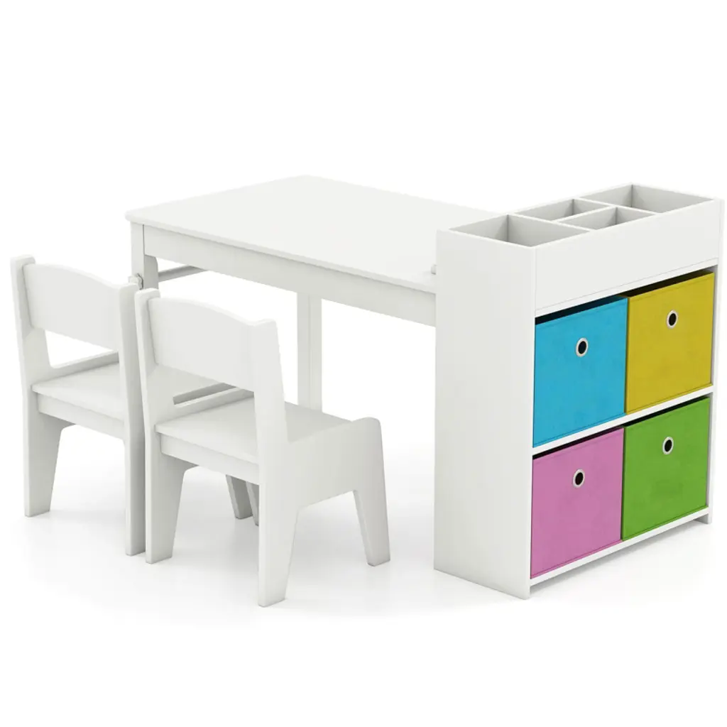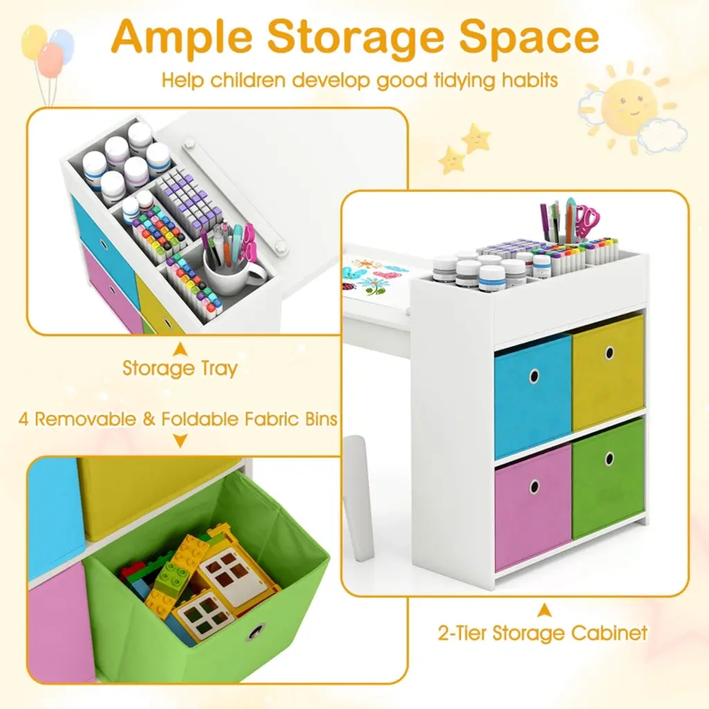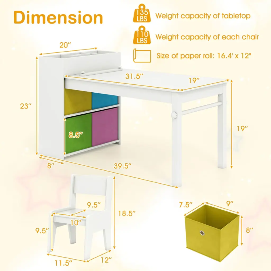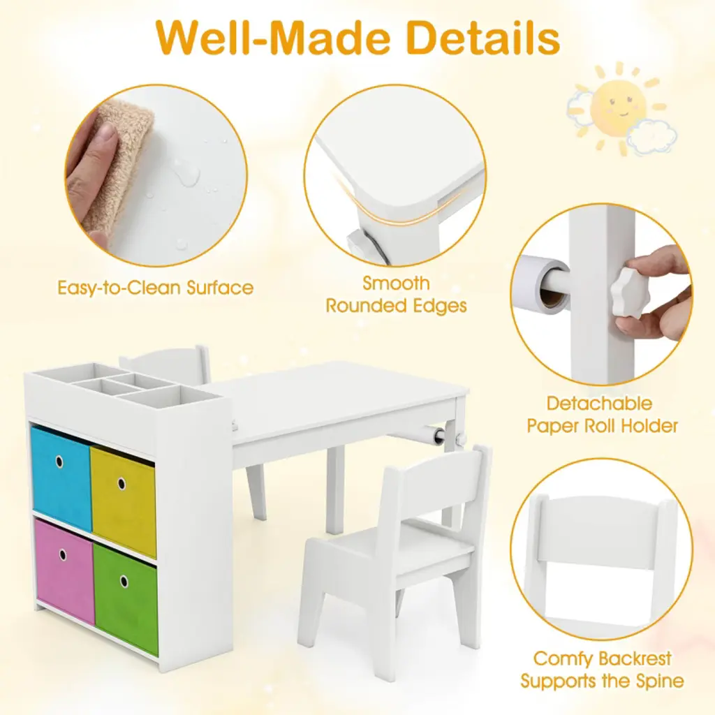 Create a dynamic and engaging space for your child with this versatile kids table and chairs set. Designed for various activities like drawing, crafting, and learning, it features a detachable paper roll holder and comes with a paper roll for continuous creativity. The ample storage space, including a storage tray and 2-tier cabinet with 4 removable bins, keeps art supplies organized. Safety is paramount with the sturdy construction and kid-friendly materials.FeaturesIntegrated with a paper roll holder and pressing rods with knobs Ready to use with an included paper roll Large storage capacity with a tray, a cabinet and foldable fabric bins Convenient maintenance with an easy-to-clean surface Avoids injuries with smooth rounded edges Includes 2 matching chairs with comfy backrest Suitable for painting, crafting, studying, dining, etc. Great gift for kids for birthday, Christmas and other events Easy to assemble with step-to-step user guideColor: Gray + White/Natural Material: MDF + Metal Dimensions of Table: 39.5" x 20" x 23" (L x W x H) Dimensions of Each Chair: 12" x 11.5" x 18.5" (L x W x H) Size of Tabletop: 31.5" x 19"(L x W) Tabletop Height: 19" Size of Backrest: 10" x 5.5" (L x W) Size of Seat: 10" x 9.5" (W x D) Seat Height: 9.5" Size of Paper Roll: 16.4' x 12" (L x W) Applicable Age: 3+ Years Old Weight Capacity of Tabletop: 135 lbs Weight Capacity of Each Chair: 110 lbs Net Weight: 38.5 lbs Package Includes: 1 x Kids Art Table 2 x Chairs 1 x Paper Roll 4 x Fabric Bins 1 x User Manual