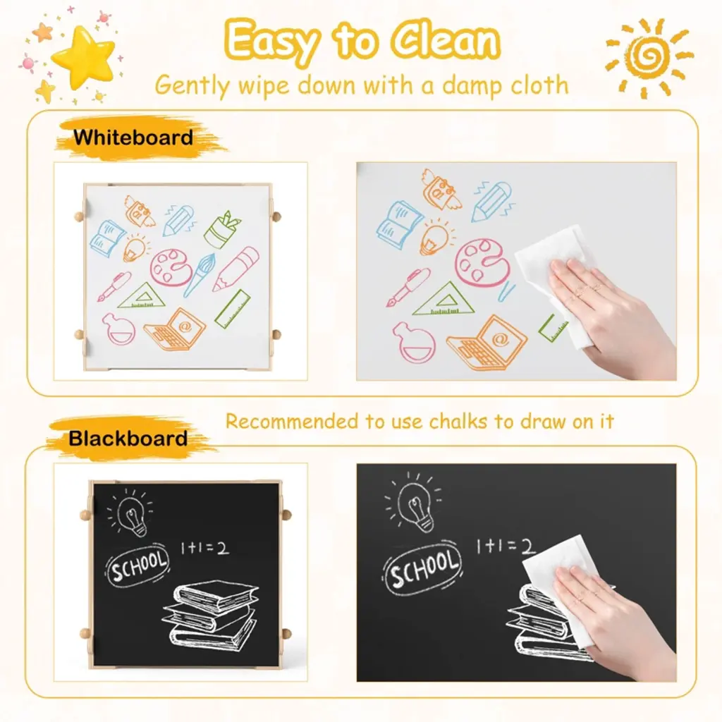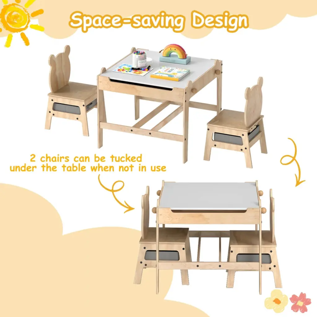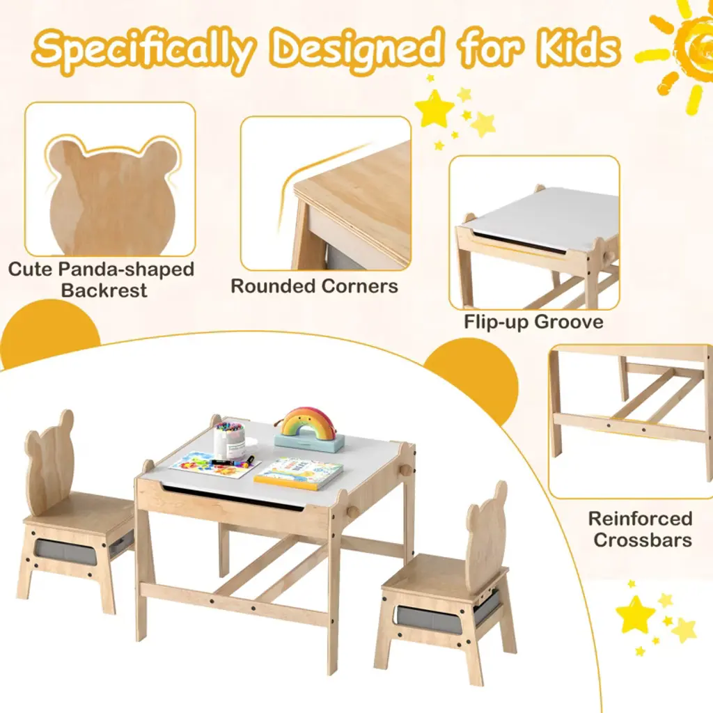Introduce your kids to a world of creativity and fun with our versatile kids table & chairs set. The activity table features a reversible tabletop that allows kids to transition between a smooth whiteboard and a classic chalkboard surface. Beneath the table is a large hidden storage compartment for stashing toys, art supplies and books, keeping the play area tidy. Additionally, 2 removable and foldable fabric drawers offer extra space to store items. Adding further convenience, 2 solid wood sticks are positioned inside the desk - serving dual roles as paper roll holders and handy hooks. Crafted from solid wood composite board, this kids table and chair set is built to last. Moreover, the lovely panda-shaped backrest adds a playful touch to any playroom or nursery.Features4 In 1 design with double-sided tabletop encourages creativity Perfect for drawing, reading, crafts, dining, playing and more Spacious compartment under the desktop to create a tidy play area 2 removable fabric drawers provide large storage space 2 wooden sticks can be used as paper roll holders and hooks Delightful panda-shaped backrest sparks joy for kids Tuck chairs under the table to maximize your playroom space Solid wood frame ensures superior stability and durability Reinforced crossbars also serve as comfortable footrests Rounded corners minimize the risk of bumps and scratches Easy to clean, just gently wipe down with a damp clothColor: Gray+Natural/Orange+Natural Material: MDF, Solid Wood Composite Board, No-woven Fabric Table Dimensions: 23.5" x 23.5" x 20.5" (L x W x H) Chair Dimensions: 13" x 10.5" x 20" (L x W x H) Drawer Dimensions: 9.5" x 8.5" x 2" (L x W x H) Seat Dimensions: 11" x 10.5" (L x W) Seat Height: 10" Net Weight: 25 lbs Weight Capacity of Table: 165 lbs Weight Capacity of Chair: 220 lbs Suitable Age: 3+ Years Old Package Includes: 1 x Table 2 x Chairs 2 x Storage Boxes 1 x Instruction
