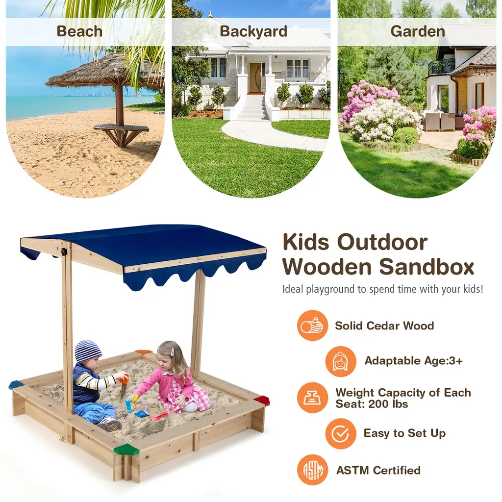 Set up an ideal playground for your kids with this kids' sandpit! It is made of sturdy Oxford fabric and solid cedar wood to ensure a lasting playground. The canopy is water-proof, sunlight protection. It has a 180-degree tilting design & 35.5-inch height adjustable function which can be taken down and closed as a lid to prevent animals, debris and more. This kids' sandbox encloses a large playing area for 2-4 kids to play and socialize. And there are bench seating surrounded box to provide resting spots. It can intake 670 lbs of sand and with the ability to keep a drained and ventilated storage thanks to a bottomless structure. The multi-color corner caps reinforce the stability and also give the sandbox a beautiful outlook This kids' outdoor wooden sandbox is an ideal playground to spend time with your kids! FeatureHeight adjustable canopy roof doubles as sandbox cover to prevent debris, animals and weather 180° rotatable canopy to cast shading in all directions Quality made construction with solid cedar wood and PVC Oxford fabric Bottomless structure designed to facilitate drainage and ventilation Large playing area for 2-4 kids, loads up to 670 lbs of sand Raised bench seats for resting spots, maximum capacity for each bench is 200 lbs Adaptable age over 3 years old and elder, easy to install Corner caps with multiple colors to create beautiful outdoor kids' furniture SpecificationColor: Natural Material: Cedar Wood, PVC Oxford Fabric Product Dimension: 47.64 x 47.56 x 47.24 inches (L x W x H) Maximum Capacity of Each Bench: 200 lbs Net Weight: 22 lbs Package Includes: 1 x Wooden Kids' Sandbox 1 x Instruction
