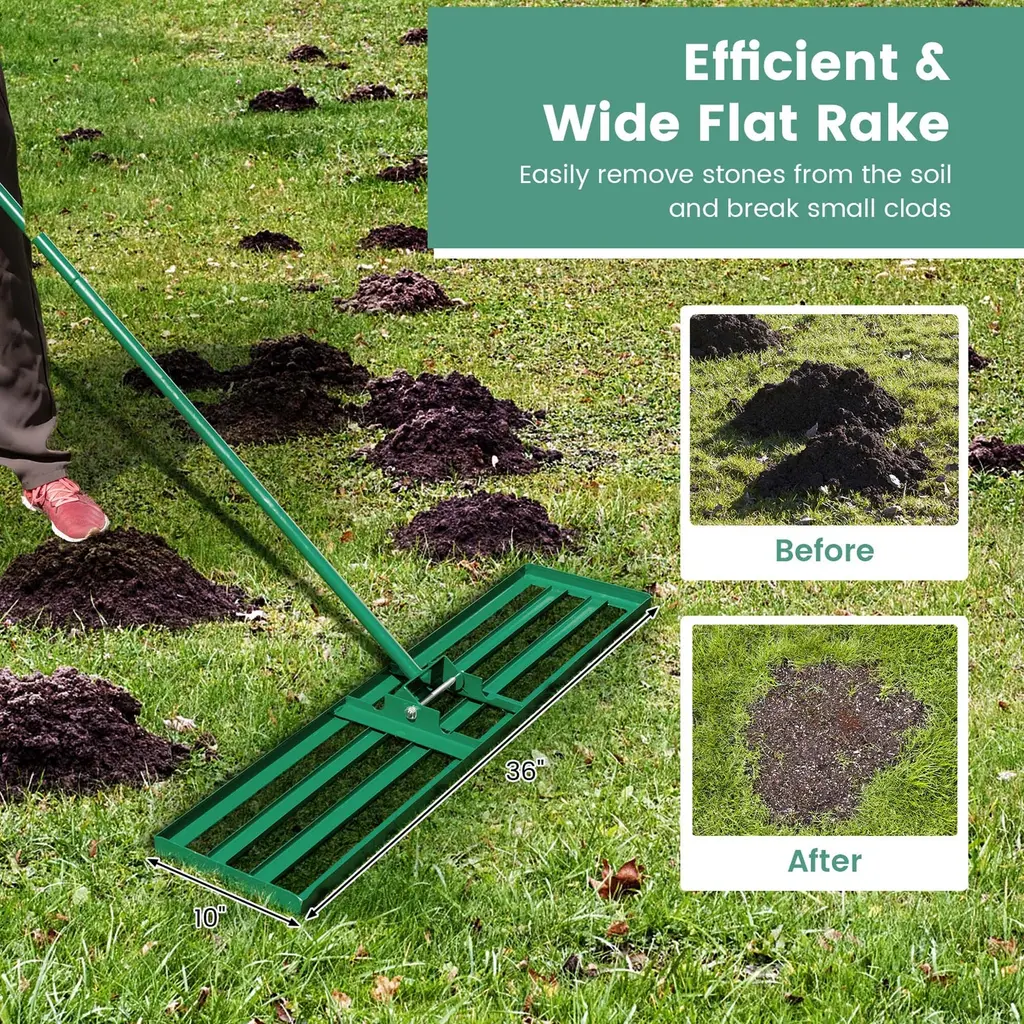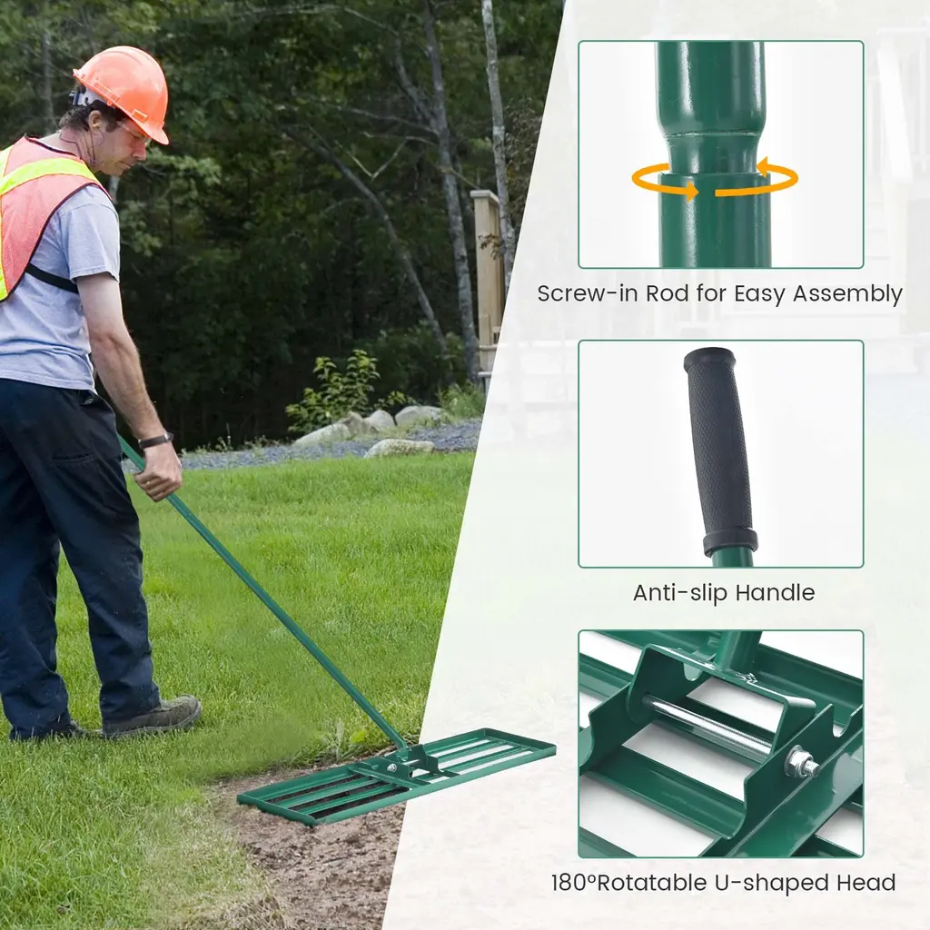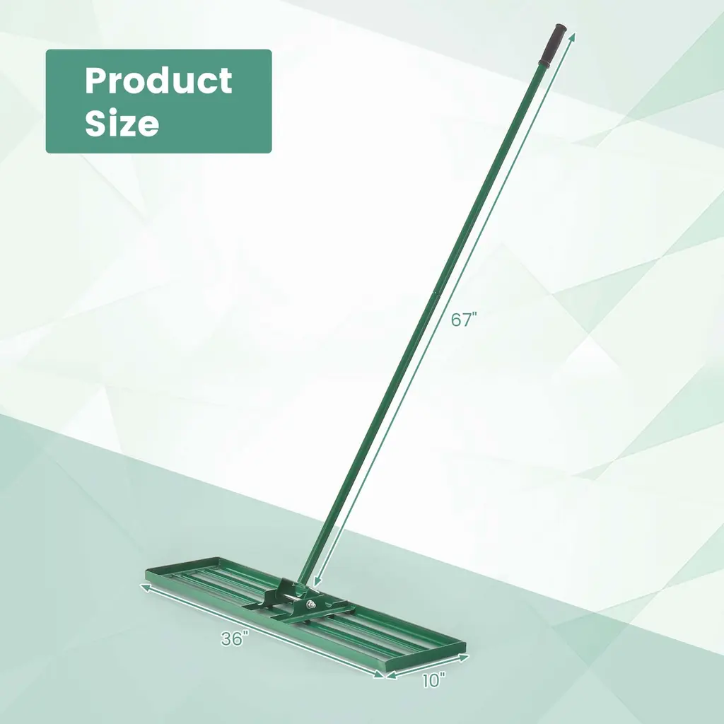Creating a level lawn for you with our lawn level too! The garden leveling rake comes with a large 36'' x 10'' plate, enabling you to easily keep your lawn flat and beautiful. Besides, 2 detachable rods are long enough to allow you to work effortlessly without bending over. And you can easily disassemble them for storage when not in use. Besides, the rubber grip makes you comfortable at work. Compared others metal with 0.8mm thickness, we use 1.8mm thickened metal, which features excellent durability & sturdiness. And the powder coating on its surface can prevent rust. In addition, the lawn rake only needs easy assembly before use. Hence, this user-friendly lawn leveling tool will be a great choice to level your backyard, garden, and golf course lawn.FeatureLong handle allows you to work without back pain Anti-slip handle ensures firm grip Large plate evenly level your lawn surface Powder-coated metal pipes are rustproof and sturdy 180°rotatable U-shaped head promotes efficient operation Equipped with screw-in rod for easy assembly Detachable rod allows for easy storage Ideal for any grass types at backyard, garden and golf course SpecificationColor: Green Material: Metal, PVC Plate Dimension: 36'' x 10'' (L x W) Handle Length: 67'' Net Weight: 12.5 lbs Package includes: 1 x Lawn Leveling Rake 1 x Instruction