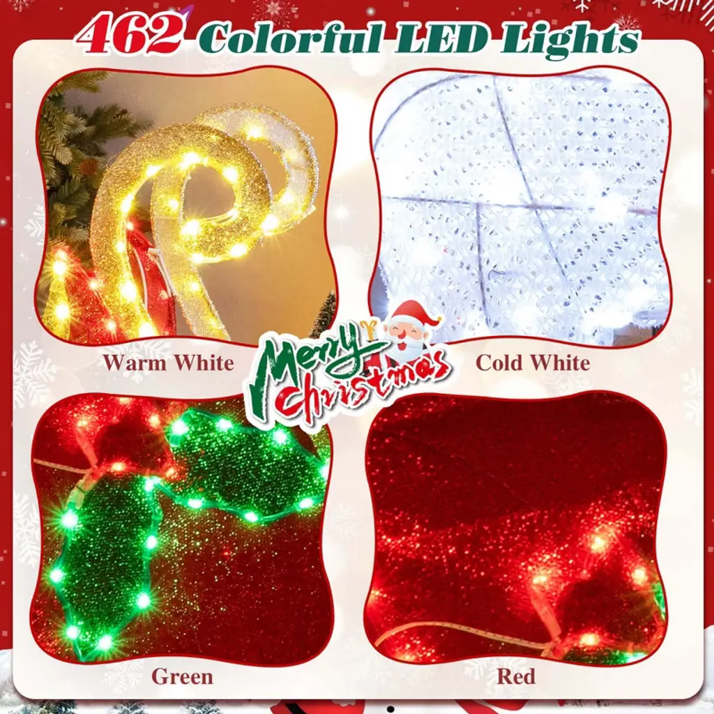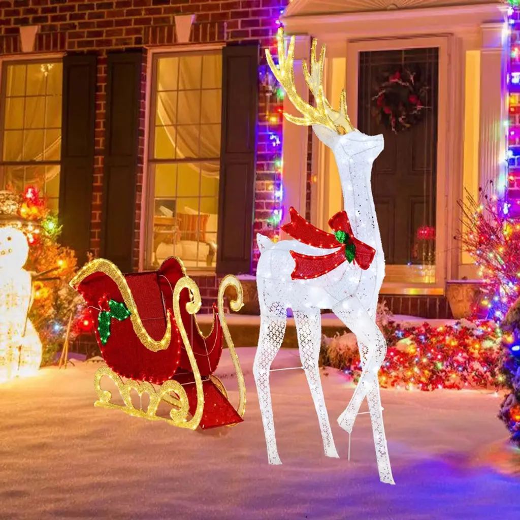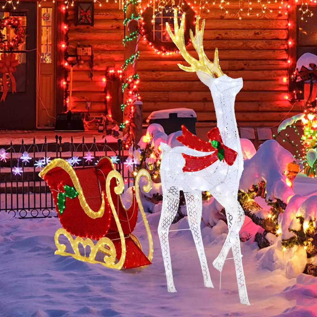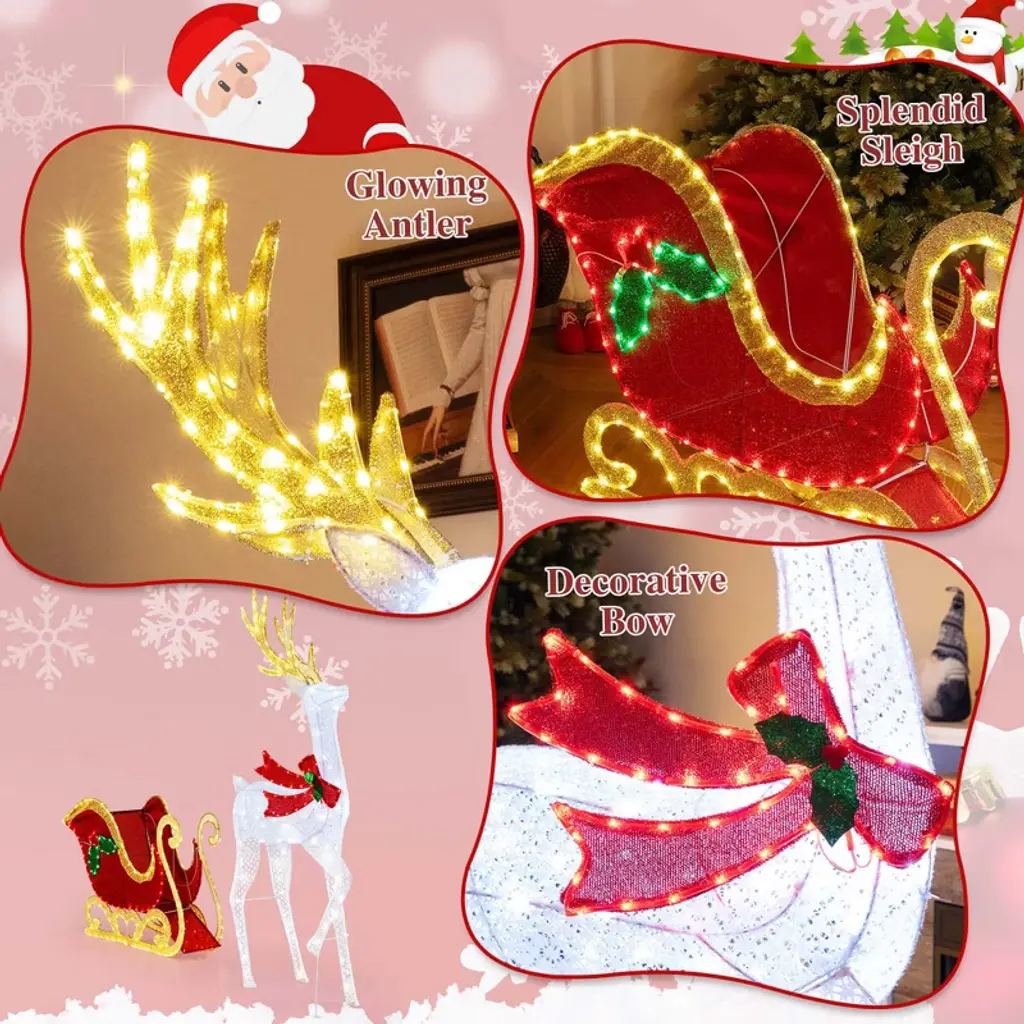 Bring the magic of Christmas to life with our pre-lit reindeer and sleigh set! Adorned with 462 vibrant LED lights, the Christmas reindeer and sleigh will bring a touch of festive joy to your holiday setting. Crafted from all-weather materials, they are designed to withstand outdoor conditions with ease. Setting up these pre-lit Christmas decorations is a breeze thanks to the sturdy zip ties for secure fastening and metal ground stakes for firm anchoring. Standing at 5.4 ft for the deer and 2.4 ft for the Santa sleigh, this delightful display set is sure to elevate your holiday display. Whether placed in your living room, garden, or backyard, the pre-lit deer and sleigh will captivate your guests and passersby with their charming presence.Features462 colorful LED lights to provide a visual feast Weather-resistant materials for long-lasting reliability Sturdy fixing ties to ensure secure attachment Metal ground stakes for better outdoor performance Glowing antlers and decorative bow make the deer more attractive Splendid sleigh with an exquisite appearance for a touch of elegance Fantastic Christmas decoration for both indoor and outdoor settingsColor: White + Red + Green Materials: Mesh Fabric, PVC, Metal Dimensions of Reindeer: 31" x 12" x 5.4 ft (L x W x H) Dimensions of Sleigh: 39" x 19" x 2.4 ft (L x W x H) Net Weight: 11 lbs Number of LED Lights: 462 Package Includes: 1 x Lighted Reindeer & Sleigh 1 x Adapter 20 x Zip Ties 12 x Ground Stakes 1 x Instruction