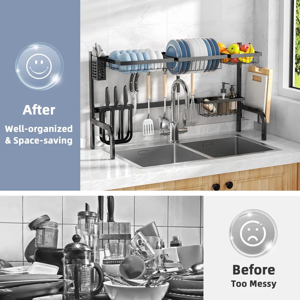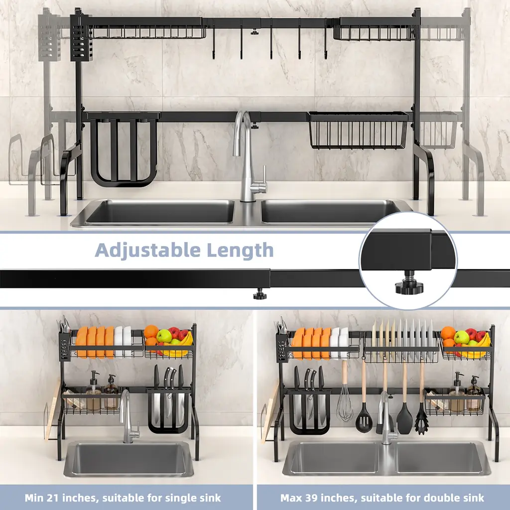 Keep your kitchen clean and tidy with our Costway Over Sink Dish Drying Rack. This 2-tier adjustable rack provides additional storage space without taking up valuable countertop space. With separate baskets and holders, you can neatly arrange bowls, dishes, utensils, chopping boards, and more. The rustproof steel structure, L-shaped support, and strong suction cups ensure long-lasting use and stability. The adjustable length of 21''-39'' makes it compatible with both single and double sinks. Plus, the over-the-sink design saves space and allows for automatic water drainage.Features:Specifications: