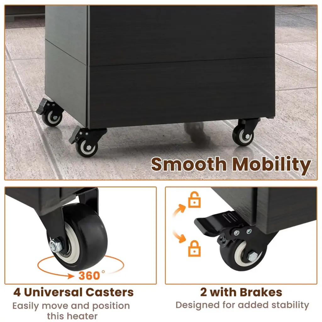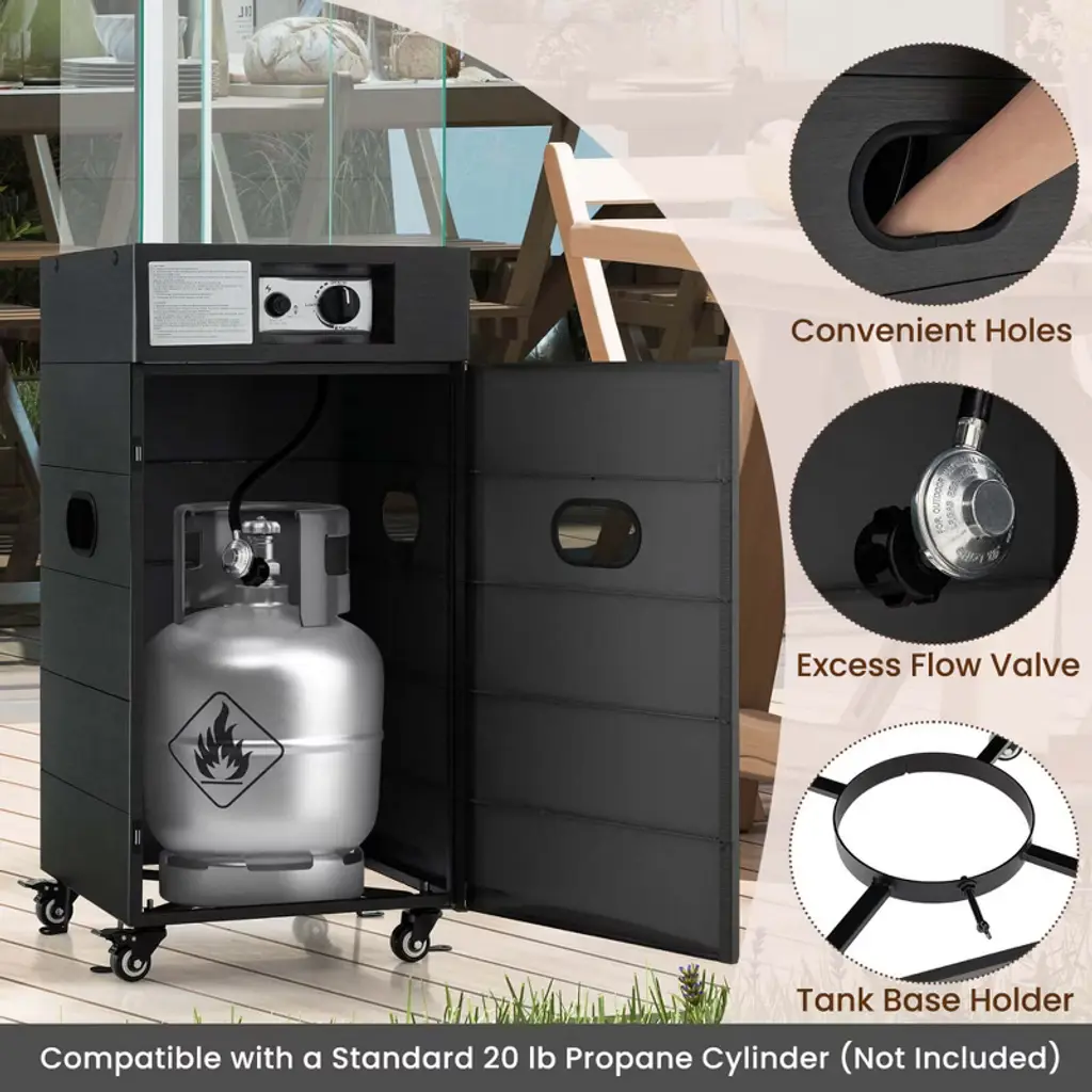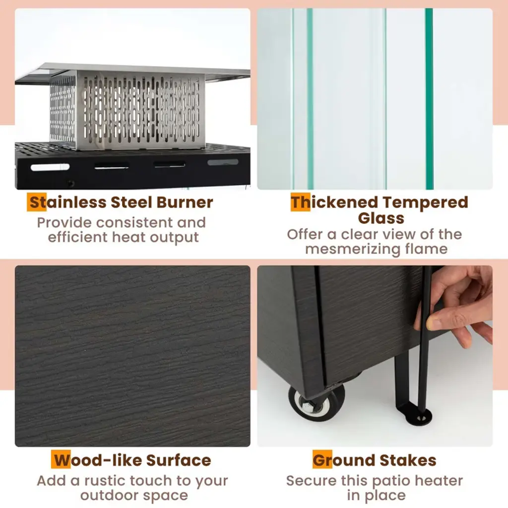 Embrace the warmth with our propane patio heater. This 40,000 BTU outdoor heater is designed to heat up quickly with its impressive 1-minute fast heating capability and extensive 360° surround heating that comfortably warms a 10 ft range. This patio heater combines both style and functionality, featuring a striking tempered glass tube and robust stainless steel burner along with a protective 300D polyester oxford cloth protective cover. Ensuring your mobility and stability, it comes equipped with 4 universal casters, 2 with brakes and additional ground stakes and fixing devices. Safety is also paramount, provided by advanced tip-over and flame-out protections.Note:Please do not use the cover until the burner has cooled down.Features40,000 BTU heat output and 1 min fast heating for sufficient warmth Cover a 10 ft heat range and heat for 6-8 people with 360° surround heating Offer a clear view of the mesmerizing flame with thickened tempered glass The stainless steel burner provides consistent and efficient heat output The wood-like surface adds a rustic touch to your outdoor space Shield it to ensure prolonged service time with an included protective cover Fix the protective cover in place thanks to its drawstring 4 universal casters (2 with brakes) for smooth mobility and safe stability The ground stakes and fixing devices secure this patio heater in places Allow you to stay warm and secure with enhanced safety The tip-over protection automatically shuts off the gas supply if the heater is tilted more than 40° The flame-out protection ensures the heater turns off if the flame is accidentally extinguished CSA certification for additional securityColor: Black Material: Galvanized Metal, Stainless Steel, Tempered Glass Overall Dimensions: 17" x 17" x 68" (L x W x H) Net Weight: 77 lbs Heat Output: 40,000 BTU Heat Coverage: 10 ft Package Includes: 1 x Patio Heater 1 x Protective Cover 4 x Ground Stakes 4 x Fixing Devices 1 x Instruction
