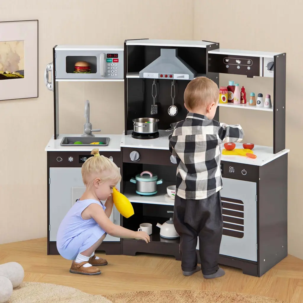 Bring the Joy of Cooking and Imaginative Play into Your Child’s World! Step into a world of culinary wonder with our kids pretend play kitchen, a captivating playset that sparks creativity and endless fun for your little chef. It features a range hood that lights up and makes sounds, dual stoves with illuminating burners and cooking sounds, and rotary knobs with click sound, creating a dynamic and engaging play environment. Complete with a sink and faucet for washing, a cooking preparation area with cutting, a pot and pan for cooking, a coffee maker for drinking, a refrigerator with an ice maker, an oven, microwave, and even a telephone for taking orders, the fun and learning never stop. When not playing, this wooden cabinet can also be used for storage, keeping tidiness while offering convenient access to play accessories. Engage your child in learning and development through interactive playtime with this enriching toy.FeatureThe range hood features LED lights and vivid sounds, add a touch of realism The stove top lights up to simulate cooking with realistic sounds 3 rotary knobs "click" as they are turned, more lifelike and immersive Features a sink and faucet for washing and a large tabletop with food preparation Features a coffee maker and a refrigerator with an ice maker for enjoying drinks Comes with a microwave oven for heating and an oven for baking Kitchen accessories included: pot, pan, 3 kitchen utensils, cup, 3 ice cubes Features a microwave cabinet, refrigerator cabinet, oven cabinet, and 2-tier open compartment The perfect gift for boys and girls, watch as they explore, learn, and grow SpecificationColor:Brown/White Material: MDF Product Size: 44" x 17" x 36.5" (L x W x H) Recommended Age: 3+ Years Old Net Weight: 38.5 lbs Package Includes: 1 x Pretend Play Kitchen 1 x Pot 1 x Pan 3 x Kitchen Utensil 1 x Cup 3 x Ice Cube 1 x User’s Manual