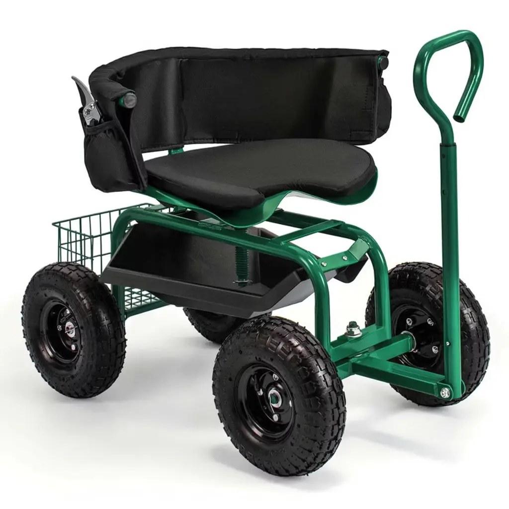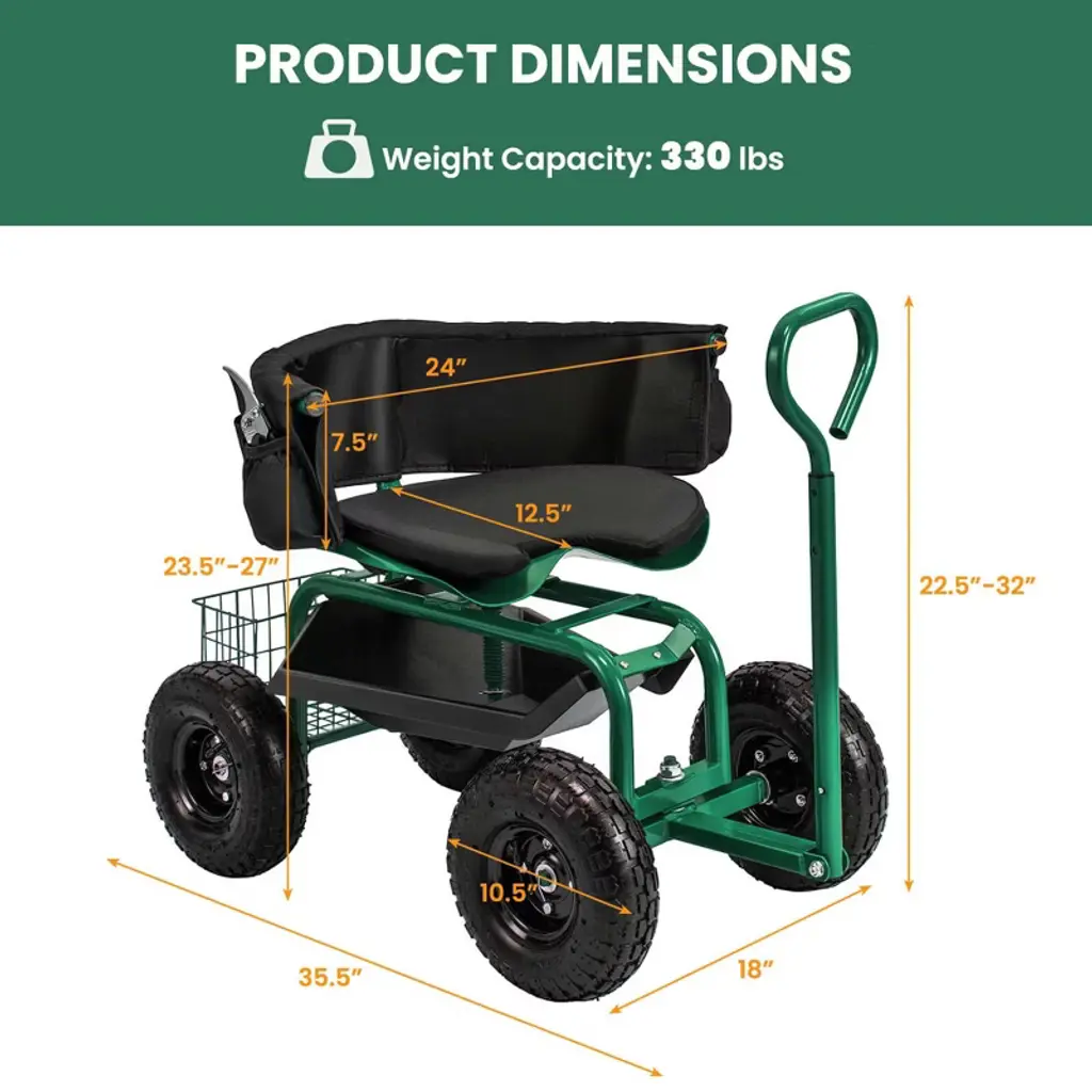 No more bending over, doing gardening work is easier with this garden cart! Plus 4 large rubber wheels are non-skid and wear-resistant, ideal for a smooth ride on uneven terrain. Thanks to the height-adjustable and 360° swivel seat, this garden scooter will promote a comfortable position for working in the garden without worries about pain and fatigue. Moreover, comfy padded seat and backrest further increase the comfort to the highest level. Including a storage basket, a storage tray and storage pockets, the work seat can easily hold gloves, planting shovels and other gardening tools. It's the smart way to look after your garden in comfort!FeaturesMade of anti-rust metal frame with powder coating Rubber rolling wheels for easy movement on any road 360° swivel seat brings convenience to your gardening Adjustable seat height for users' needs Offers diverse storage options for your gardening tools Effortlessly move the garden cart with steering handles Both the seat and back are fitted with a comfy cushion Cushions are removable and washable for easy cleaning Can be used in garden, yard, farm, greenhouse, etc. Color: Blue/Red/Green Material: Metal, Rubber Product Dimensions: 35.5 x 24 x 24 inch (L x W x H) Net Weight: 34 lbs